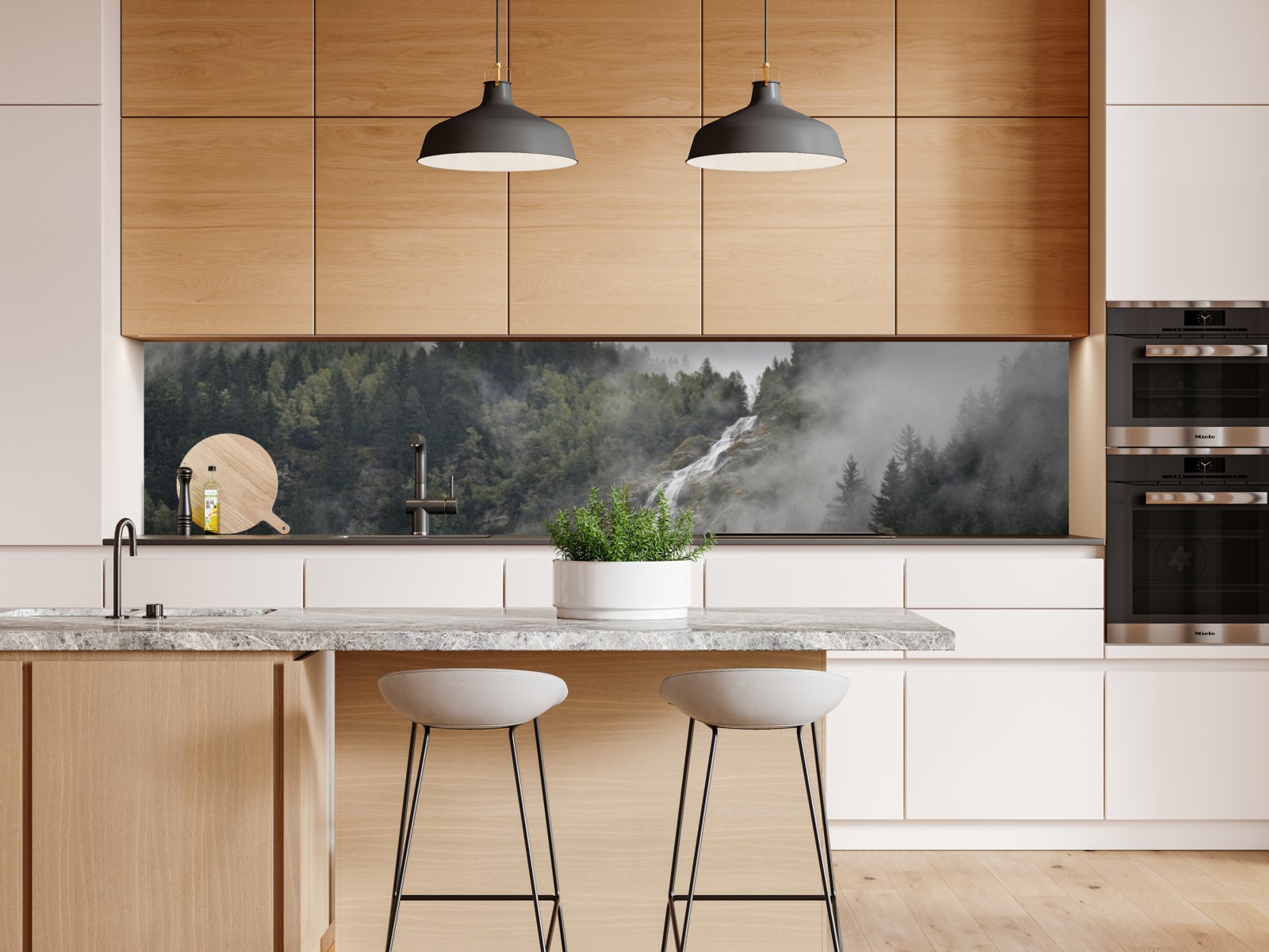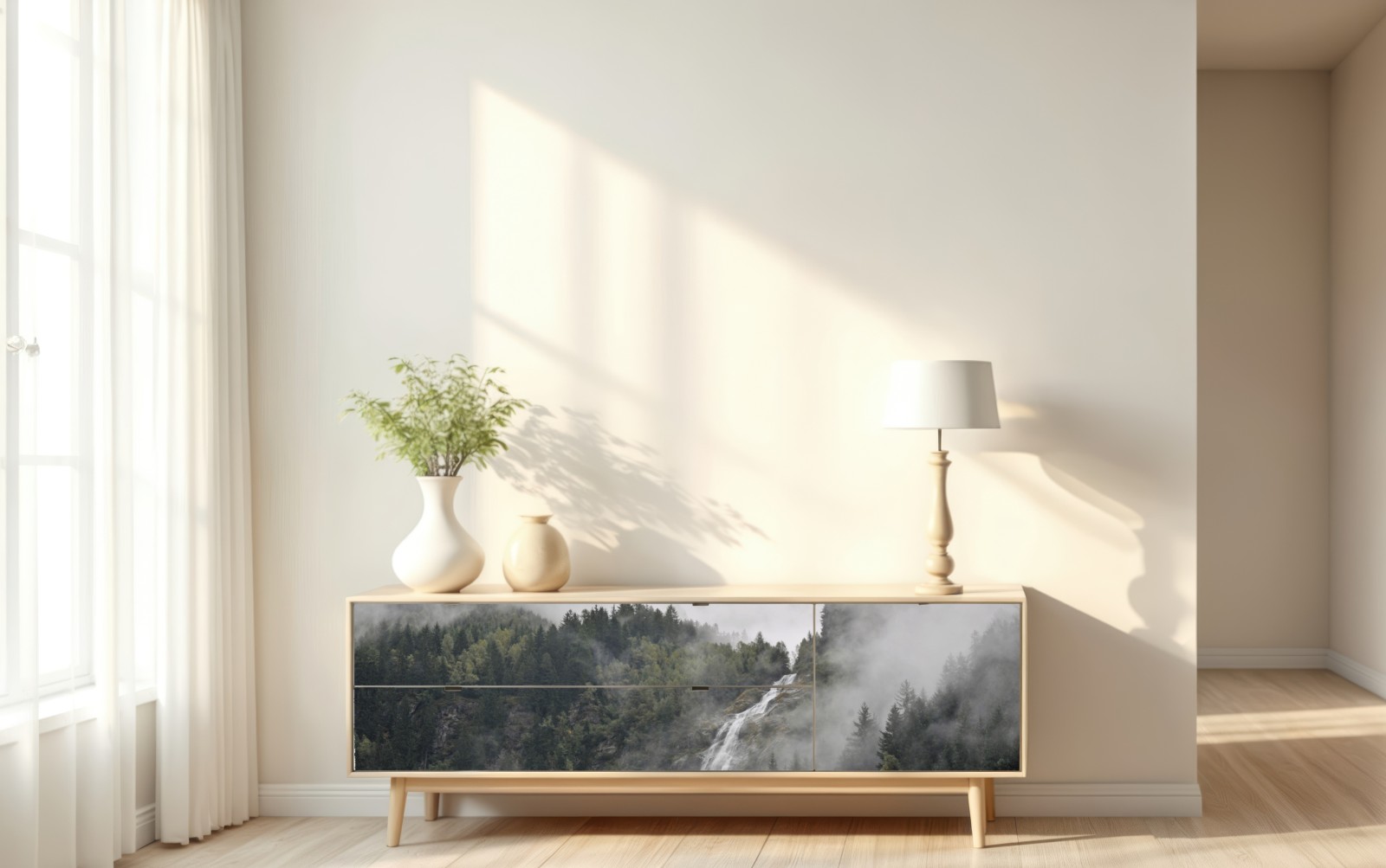 Ein nebelverhangener wasserfall, der durch dichten, grünen bergwald fließt und jedem raum eine ruhige, naturnahe atmosphäre verleiht.