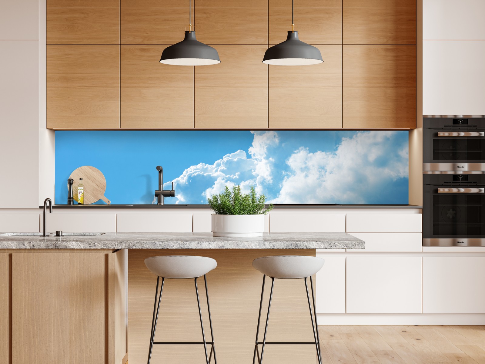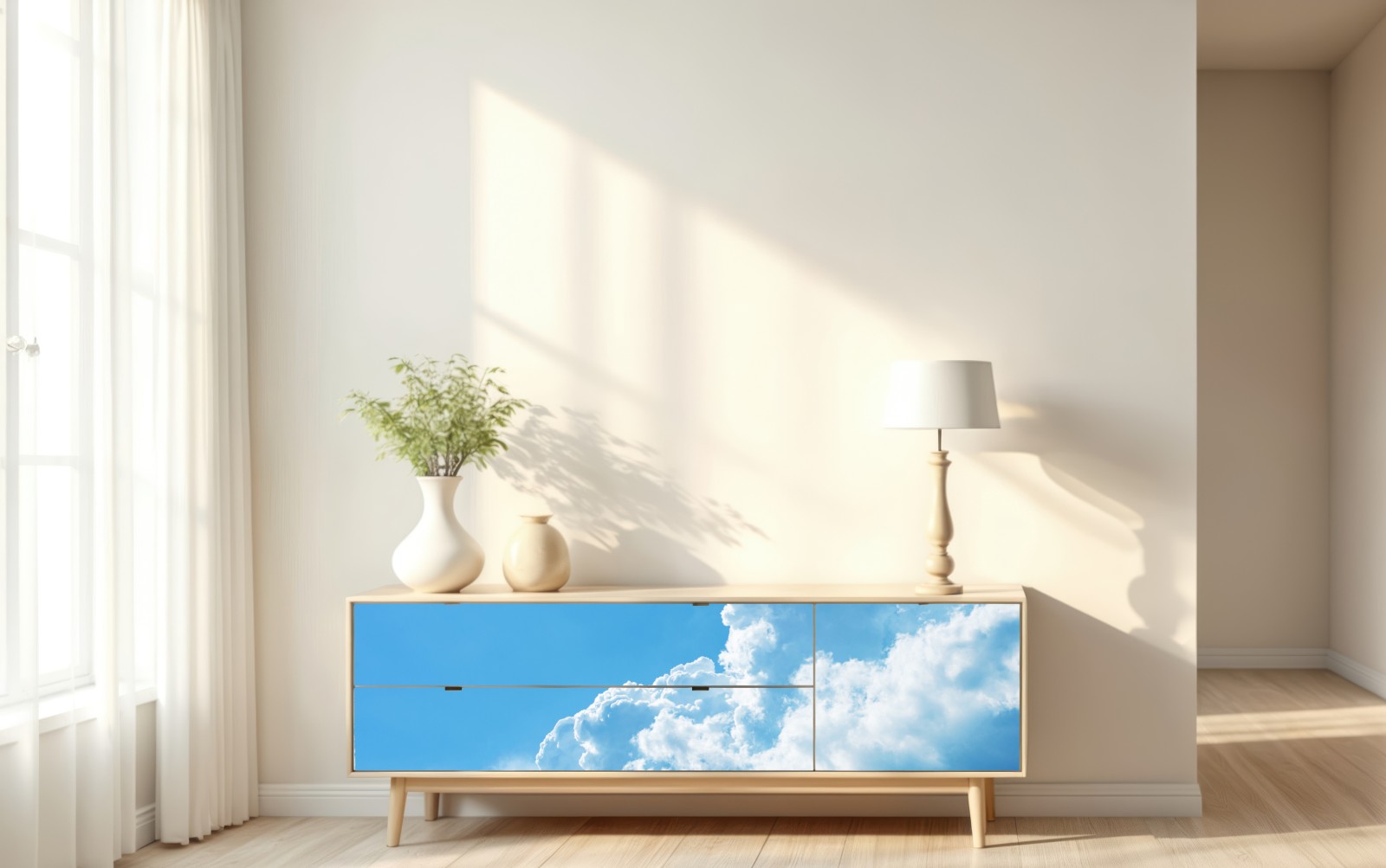 Ein beruhigendes Foto eines hellblauen Himmels mit fluffigen weißen Wolken, das jedem Raum Licht und Ruhe verleiht.