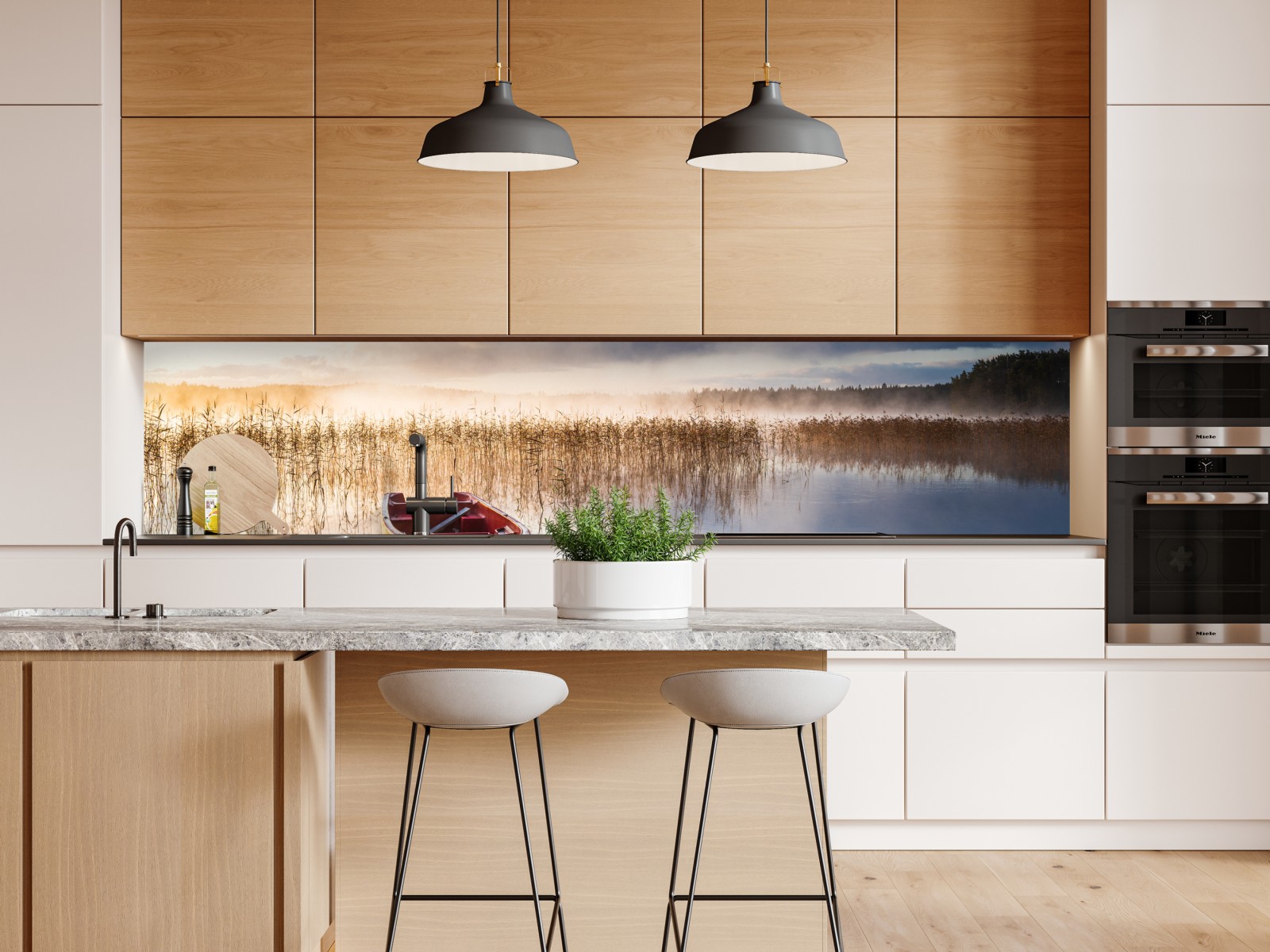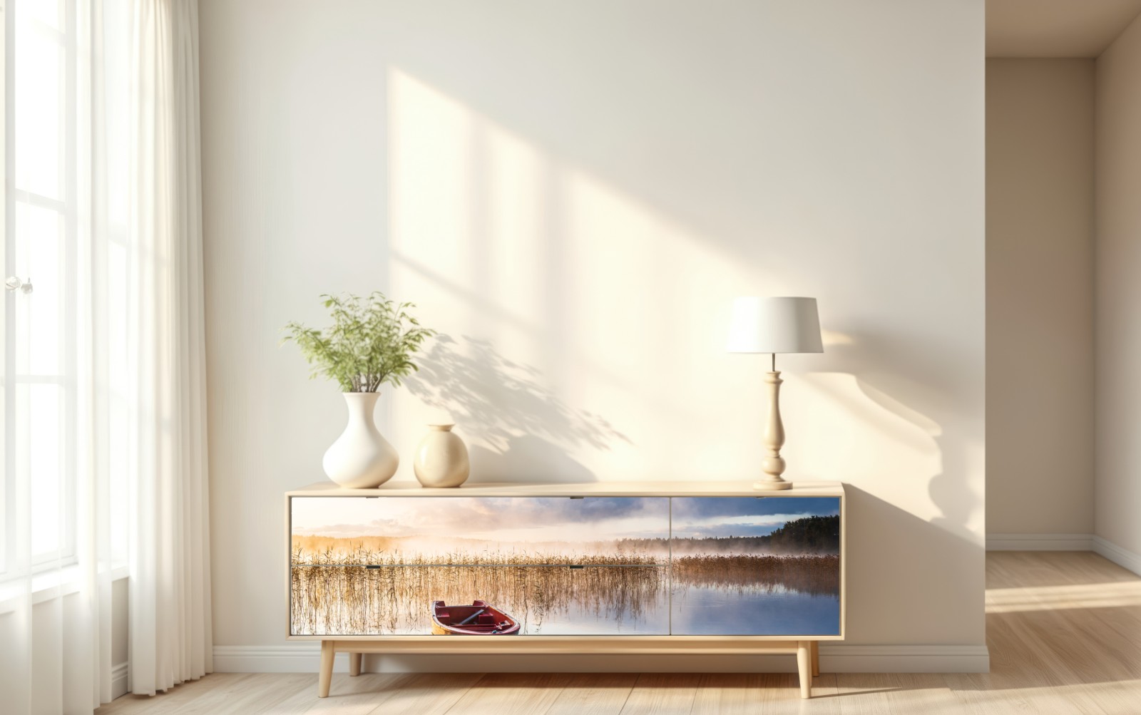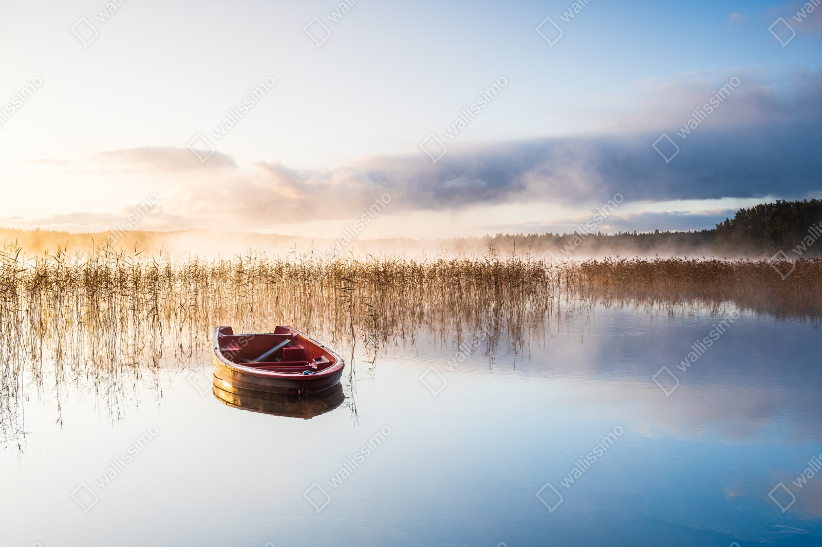 Ein ruhiges seeufer im morgendlichen nebel mit einem einsamen roten boot und spiegelglatter wasseroberfläche, ideal für wohnräume.