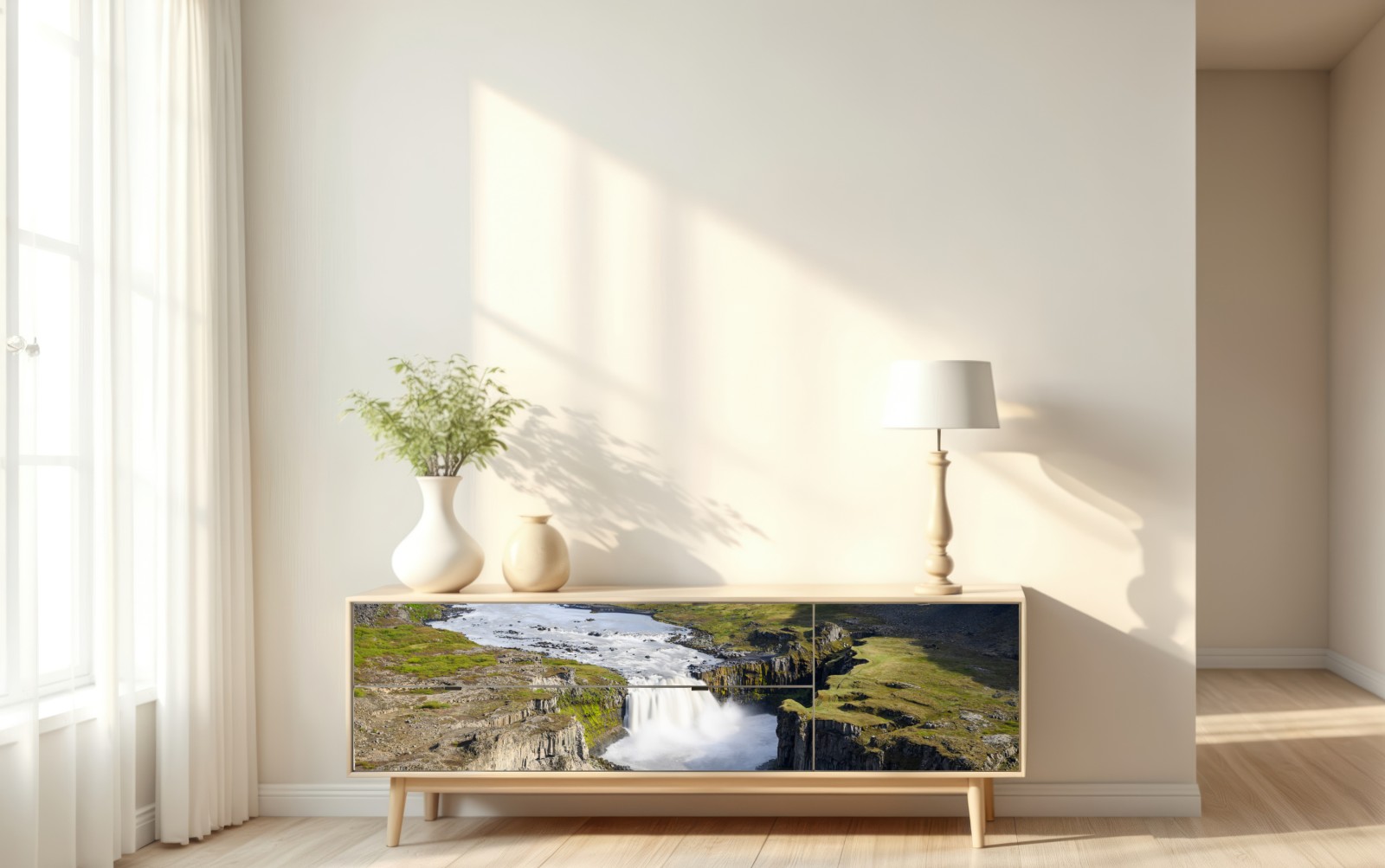 Bringen Sie die rohe Schönheit Islands in Ihr Zuhause mit diesem dramatischen Wasserfall in einer Schlucht, der jedem Raum Ruhe und Abenteuer verleiht.
