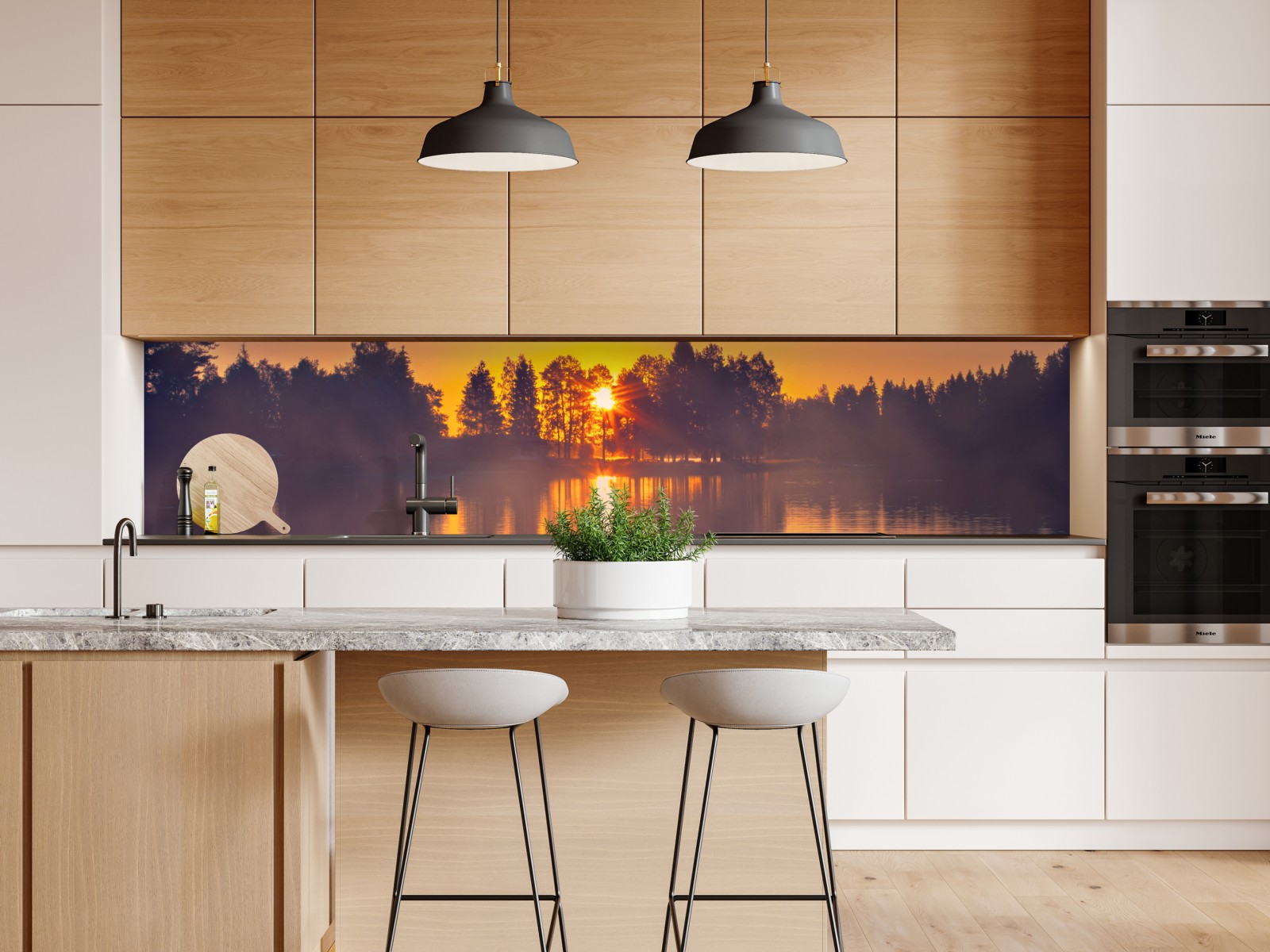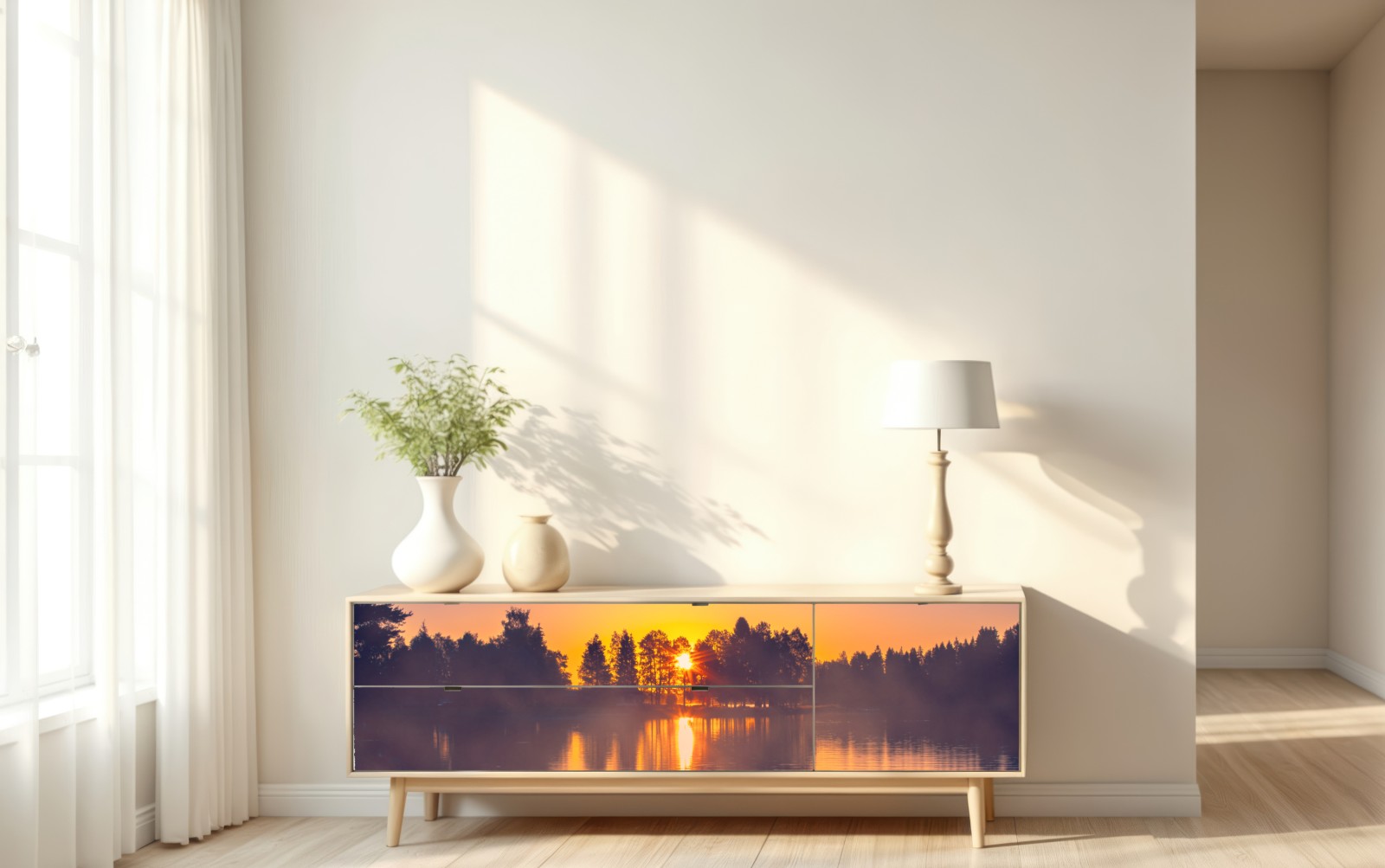 Ein ruhiger, nebliger Sonnenuntergang über einem stillen See mit warmen Farbtönen und sanften Reflexionen, ideal zur Verschönerung Ihres Wohnraums.