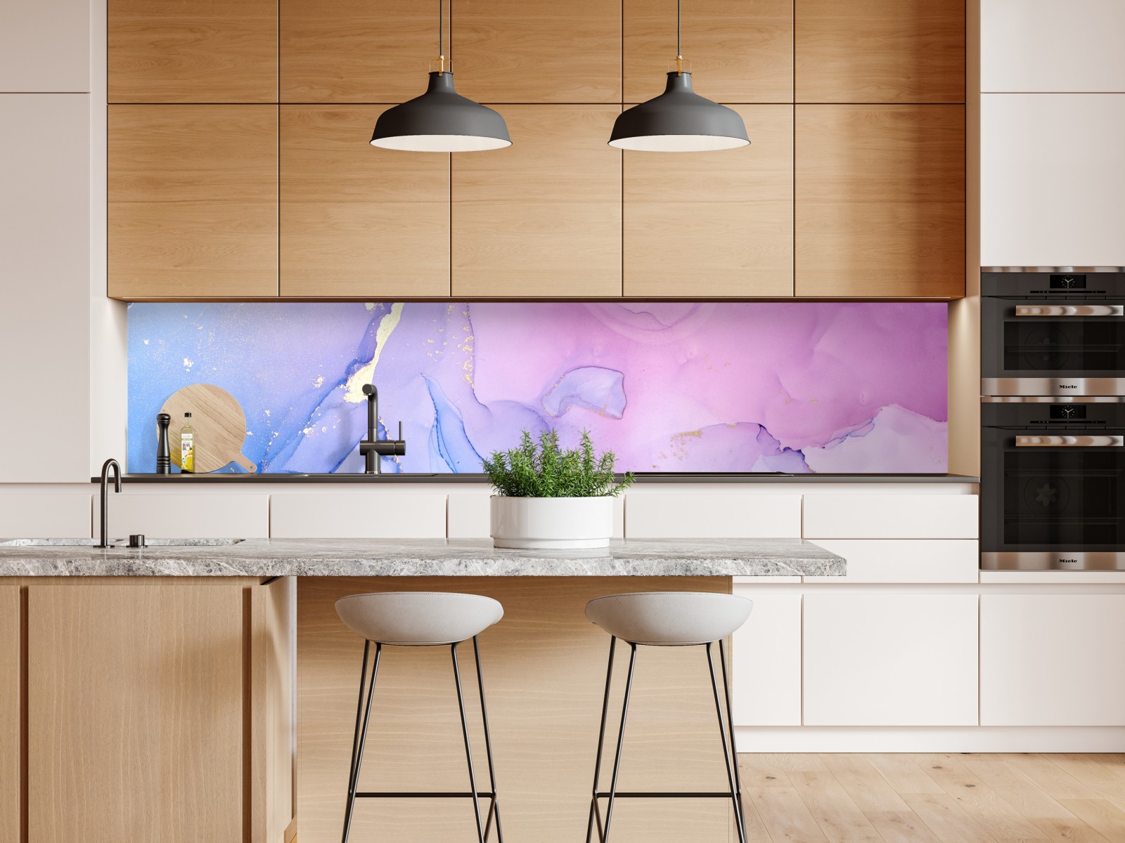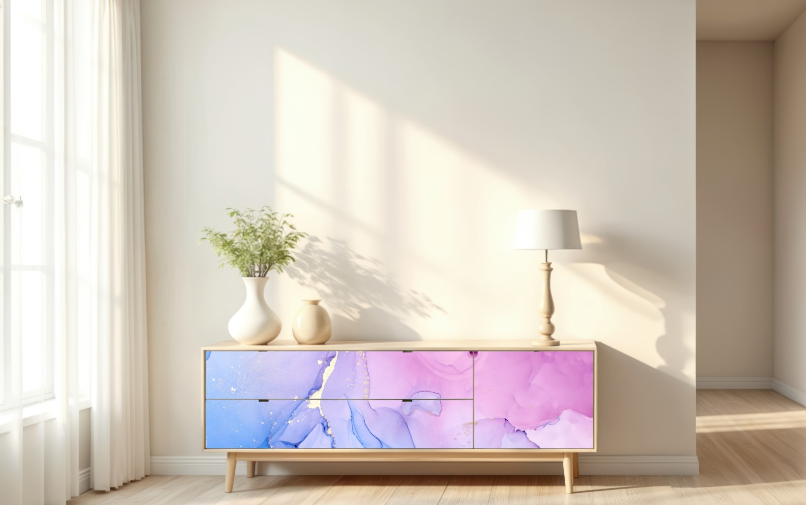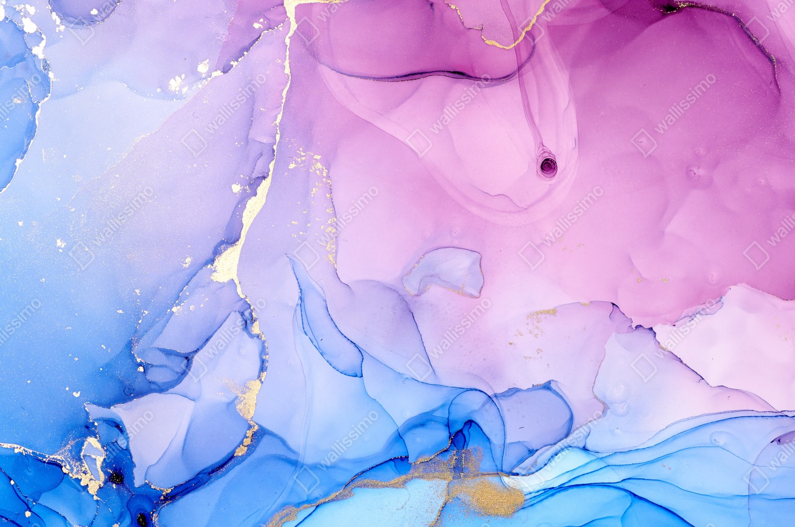 Zarte rosa-blaue marmorierte Komposition mit goldenen Akzenten, die modernen Räumen eine entspannte Atmosphäre verleiht.