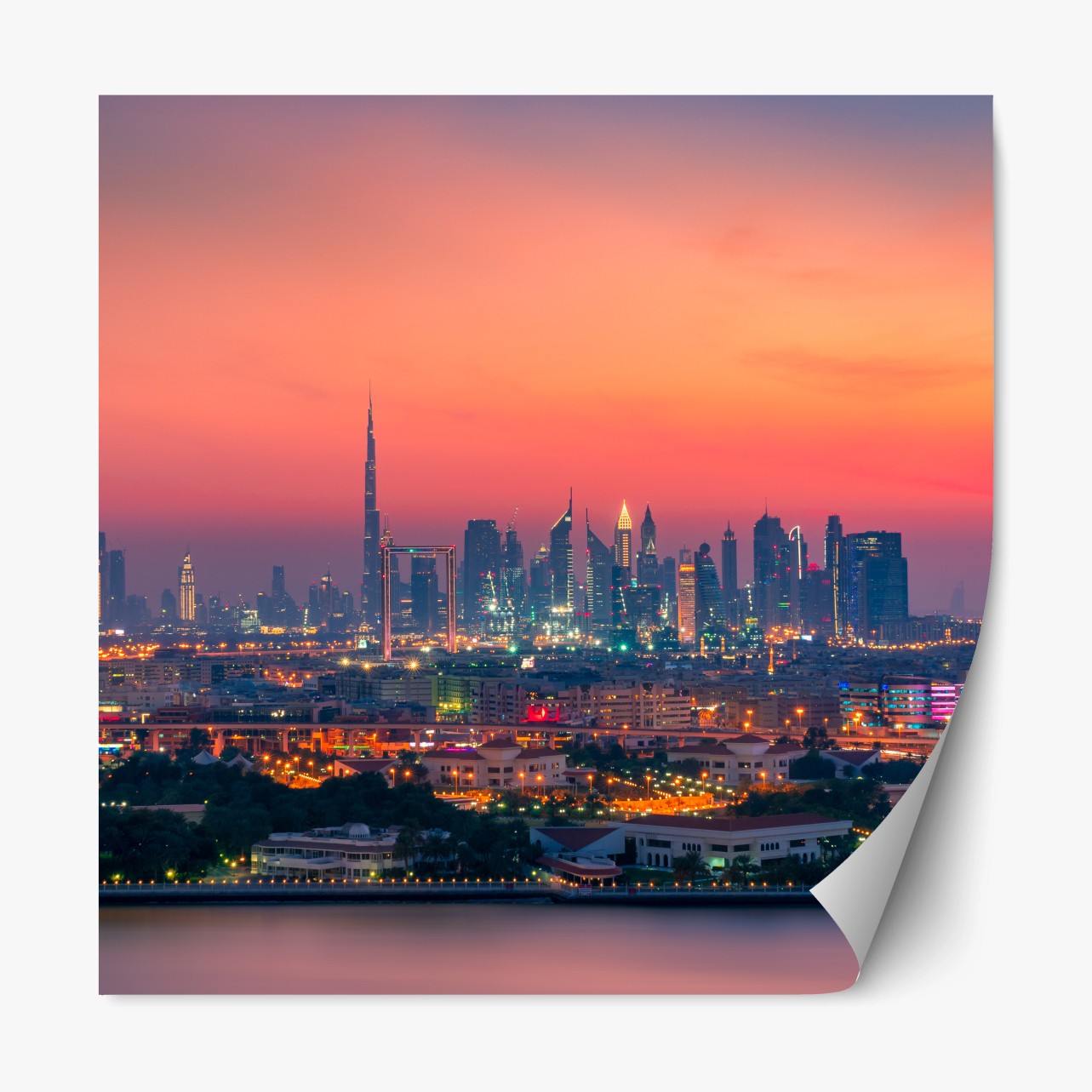 Repositionierbarer Aufkleber Dubai skyline bei sonnenuntergang