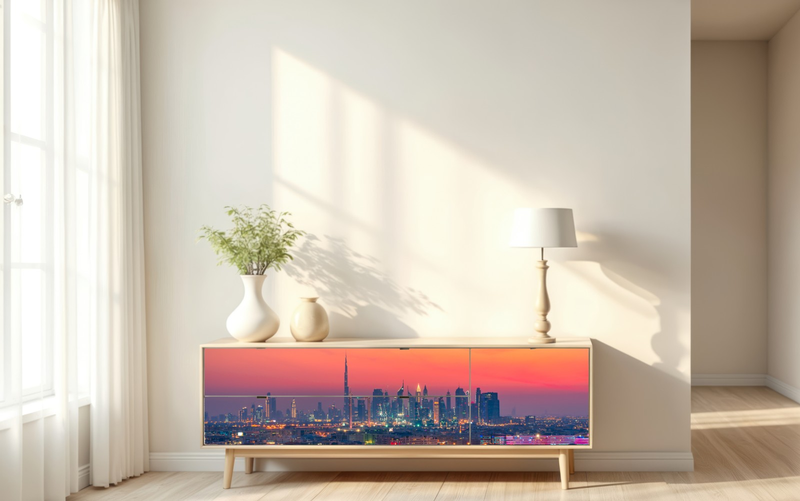 Ein lebendiges Panorama der Skyline von Dubai bei Sonnenuntergang, das warme Farben und Stadtlichter kombiniert und jeden Raum zum Blickfang macht.