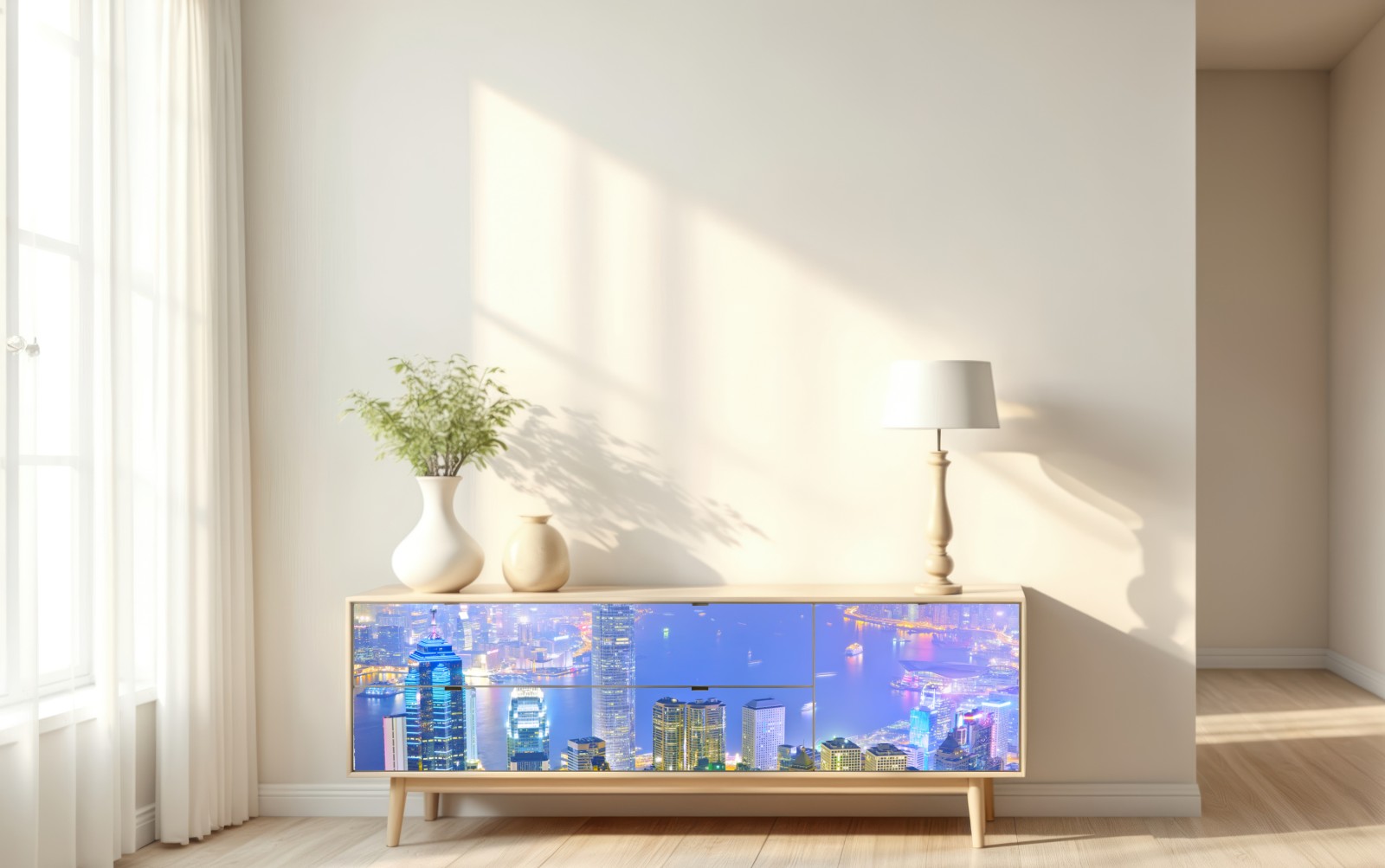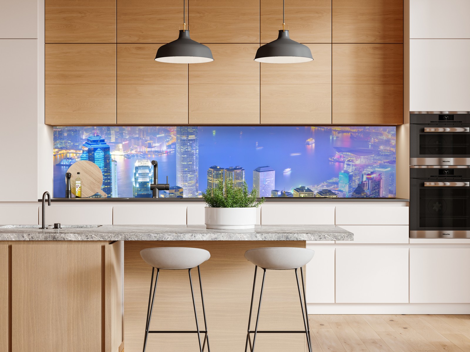Lebendige nächtliche Panoramaaufnahme der Skyline und des Hafens von Hong Kong, ideal um modernen Räumen urbanes Flair zu verleihen.