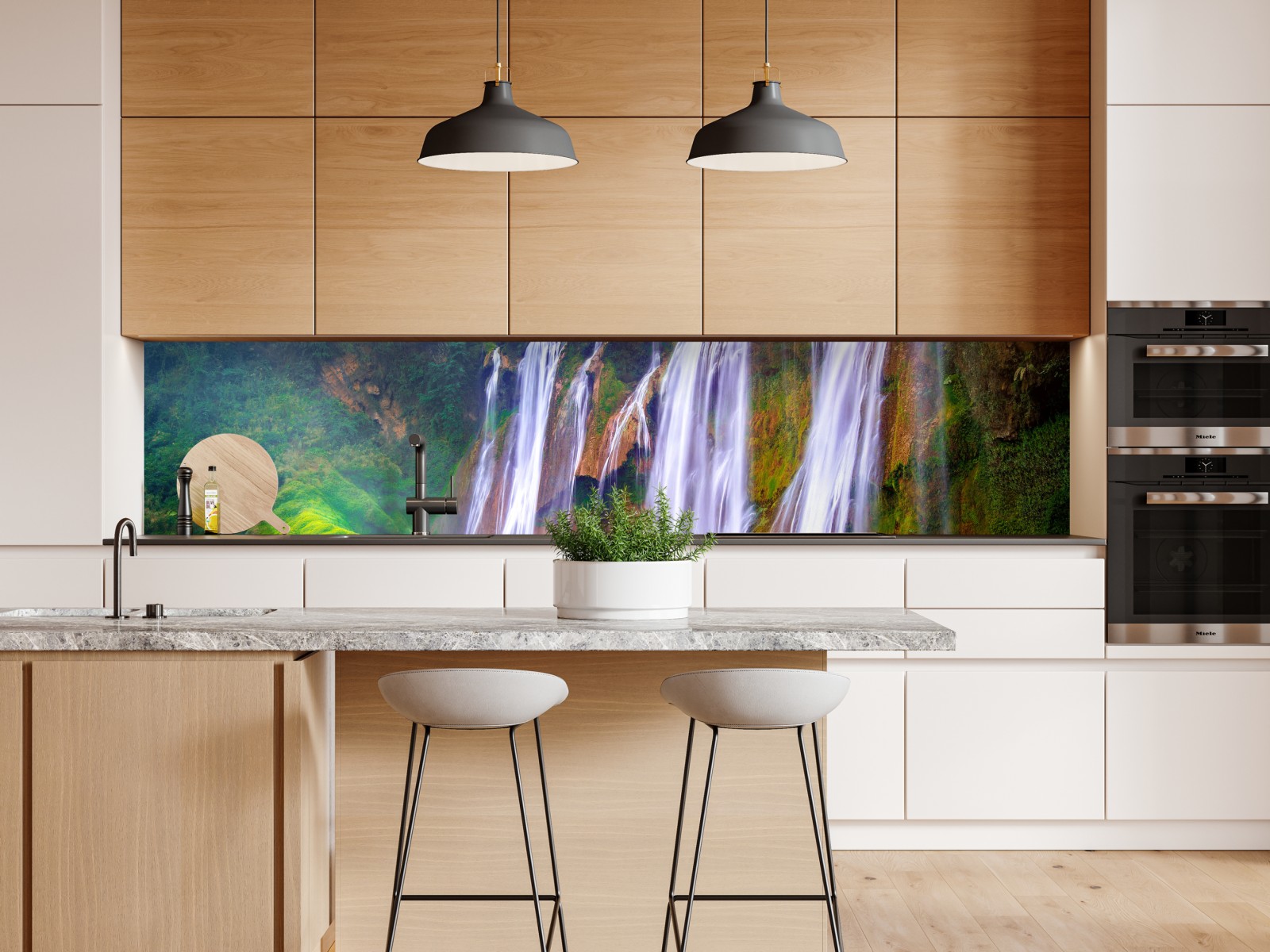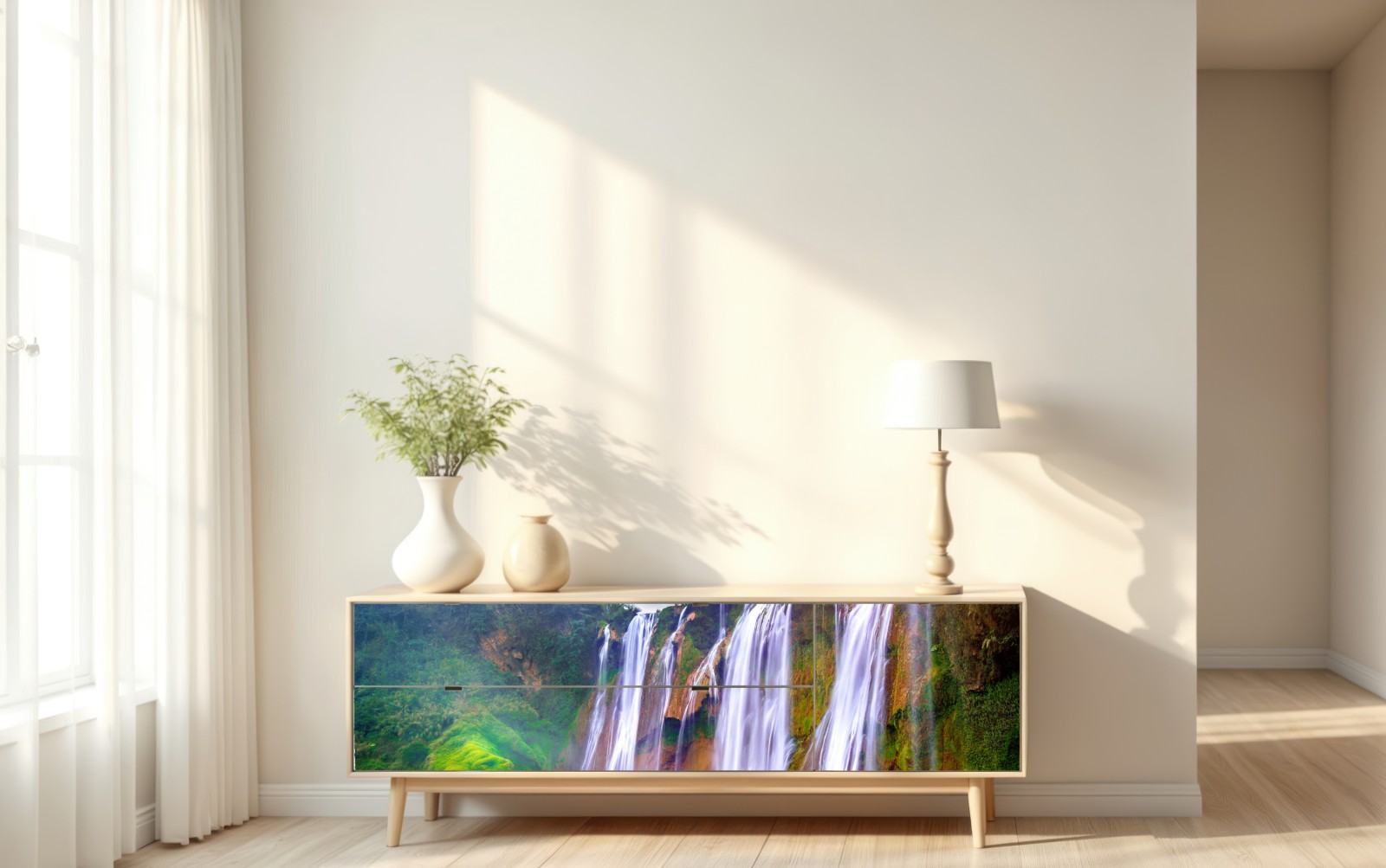 Bringen Sie die beruhigende Energie des Jiulong-Wasserfalls mit lebendigem türkisfarbenem Wasser und üppigen grünen Klippen in Ihren Raum, perfekt als natürlicher Blickfang.