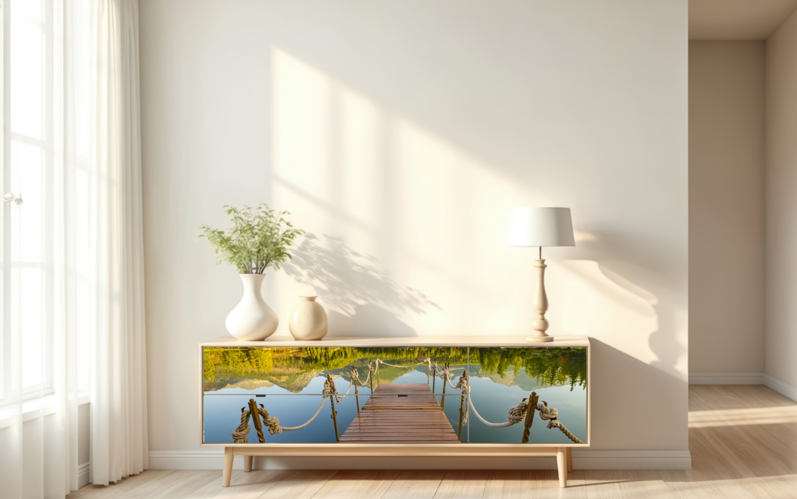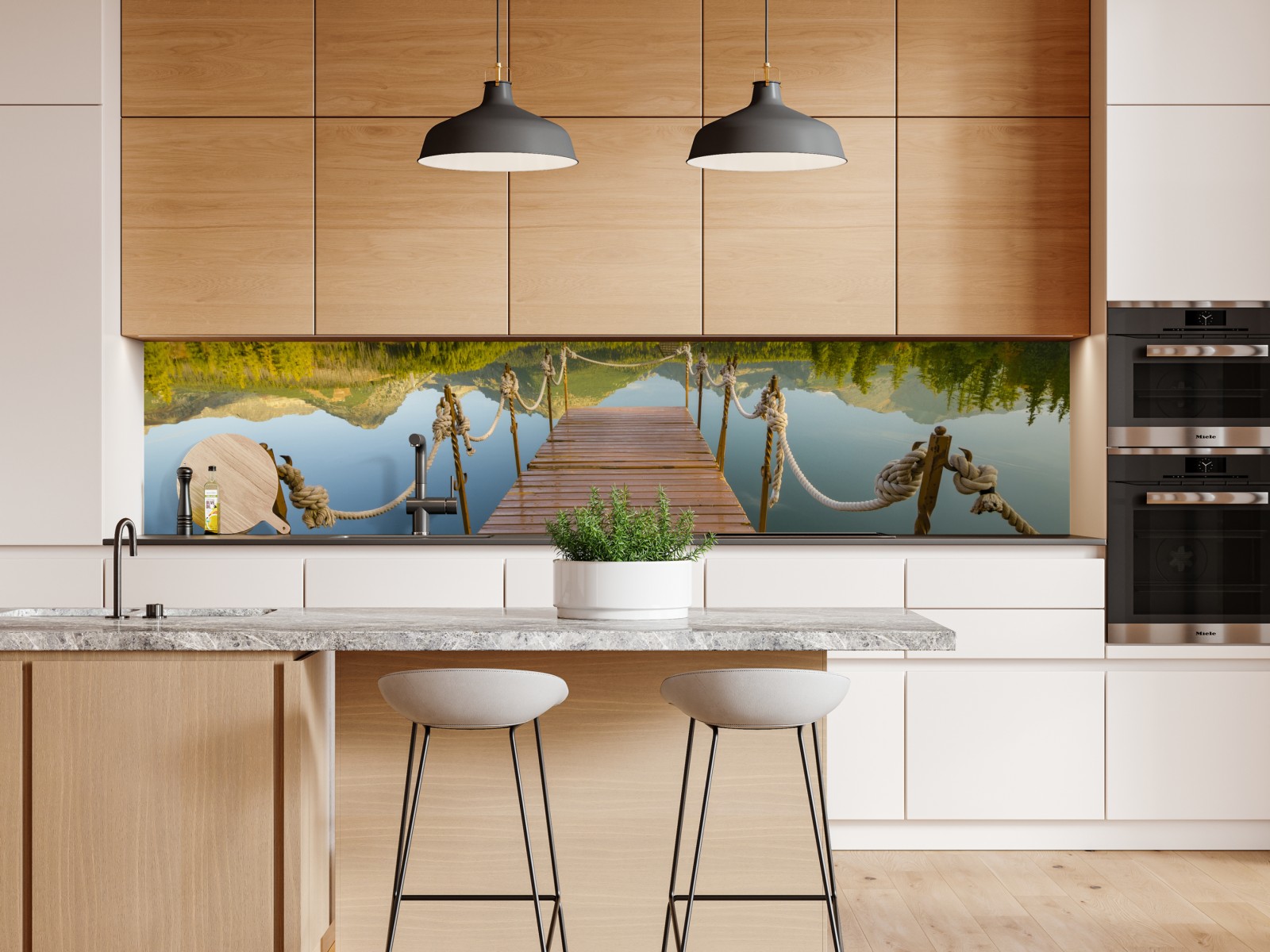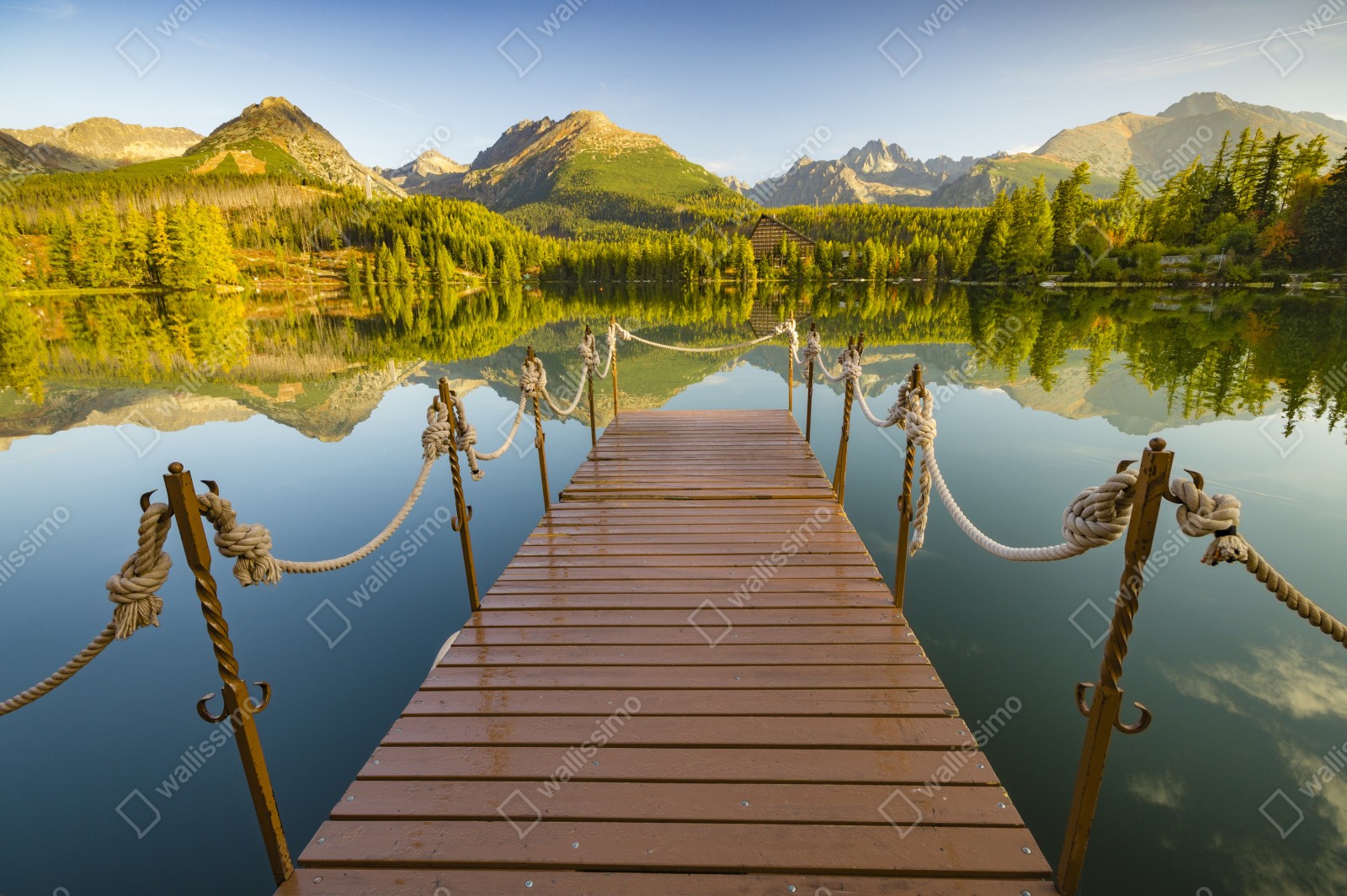 Ruhige Panoramaansicht des Sees Strbske Pleso mit einem hölzernen Steg und spiegelnden Alpen, perfekt, um natürliche Ruhe in Ihr Zuhause zu bringen.