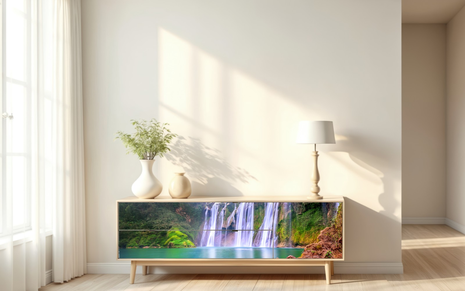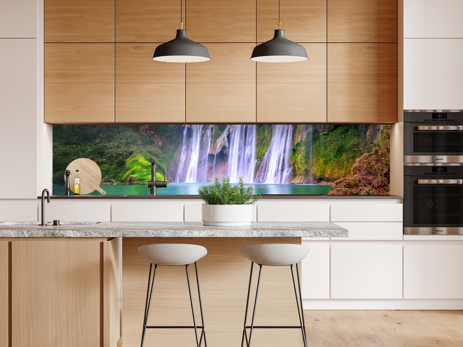 Bringen Sie ruhige Naturstimmung in Ihr Zuhause mit dem Anblick stürzender Wasserfälle über türkisfarbenem Wasser.