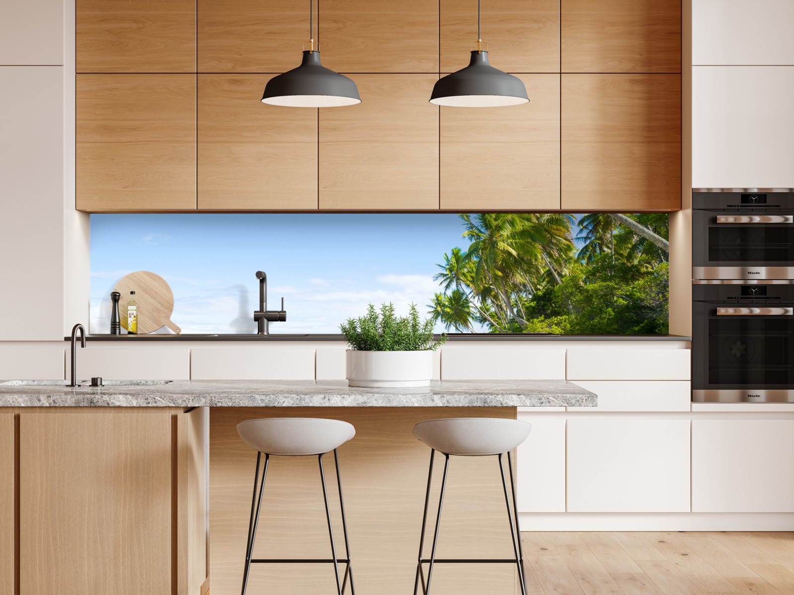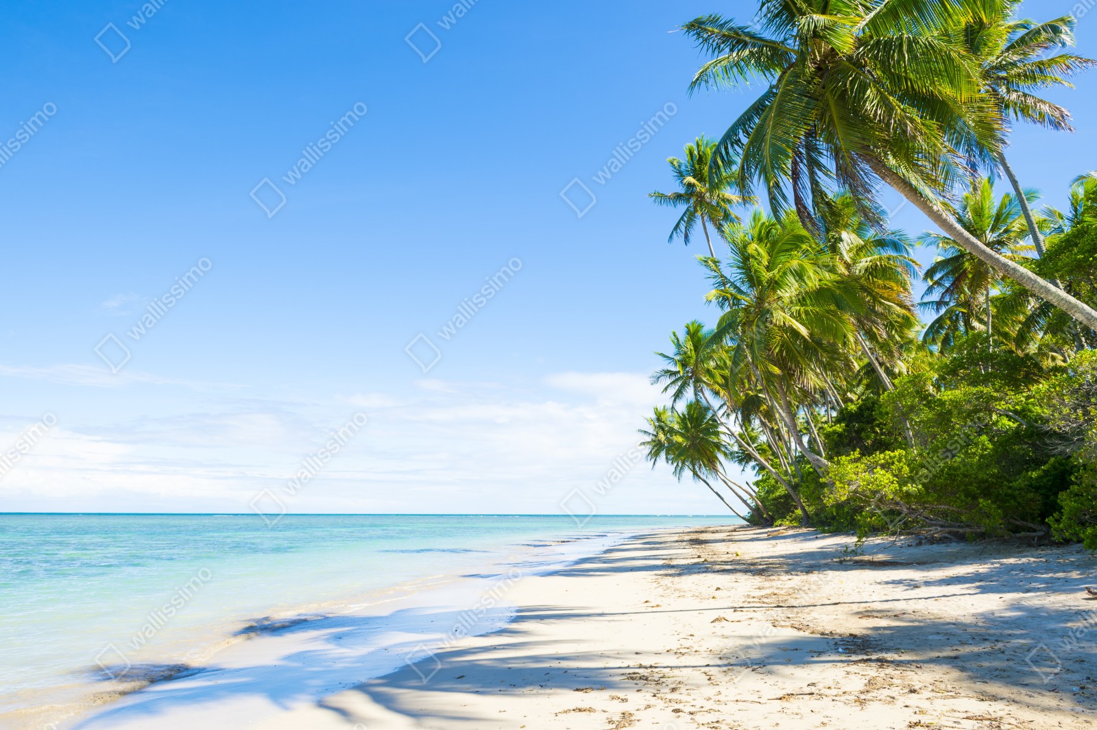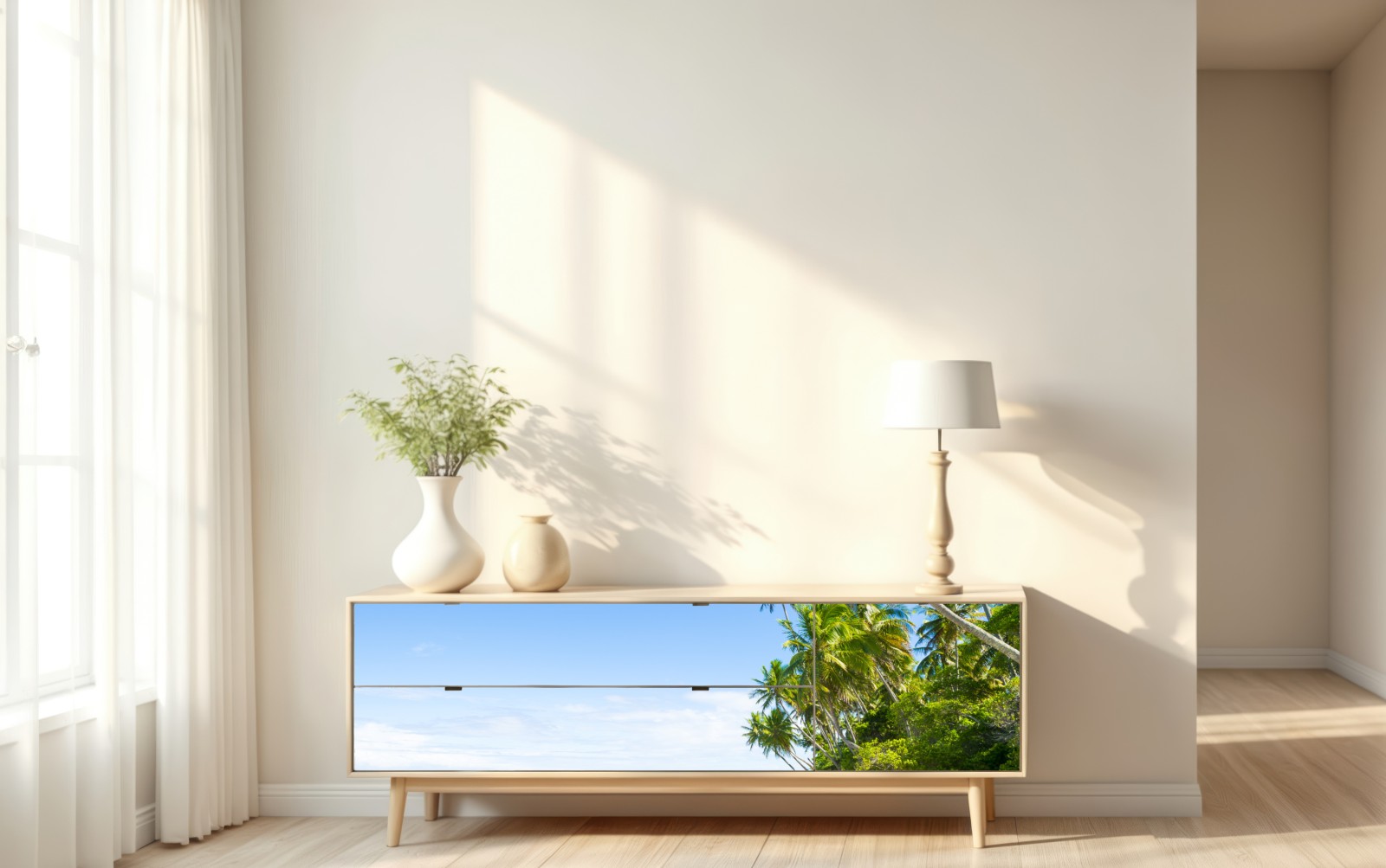 Eine ruhige tropische Strandaufnahme mit wiegenden Palmen und türkisfarbenem Wasser, die Sommerstimmung und Entspannung in jeden Raum bringt.