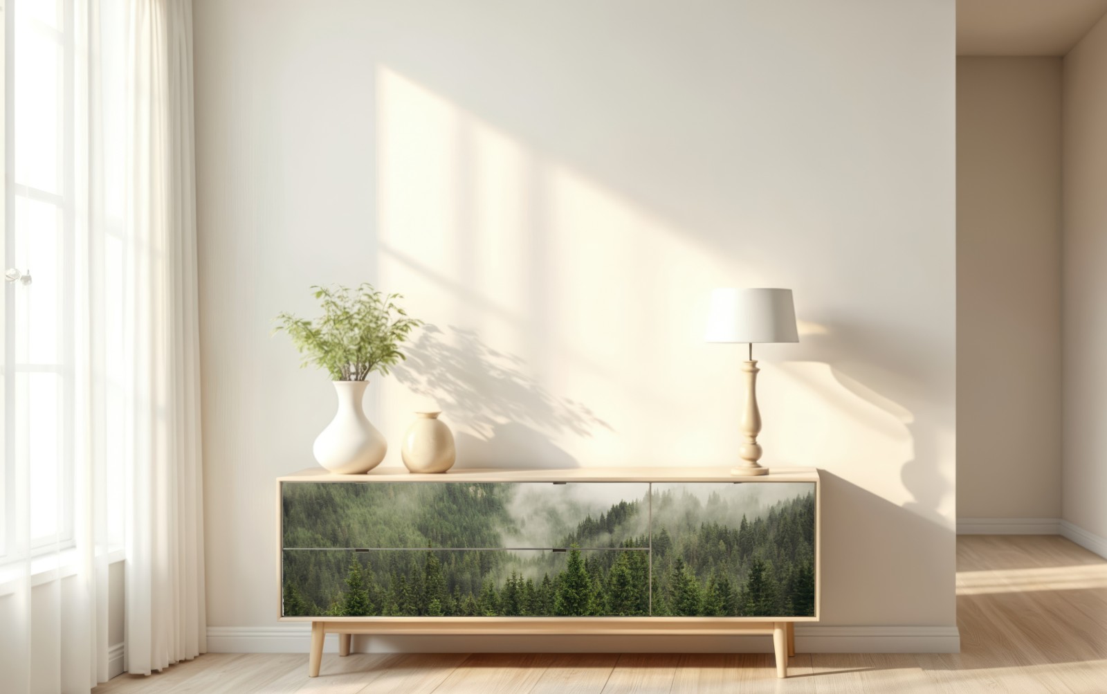 Eine ruhige, nebelverhangene Nadelwaldlandschaft, die natürliches Flair und Gelassenheit in jeden Raum bringt.