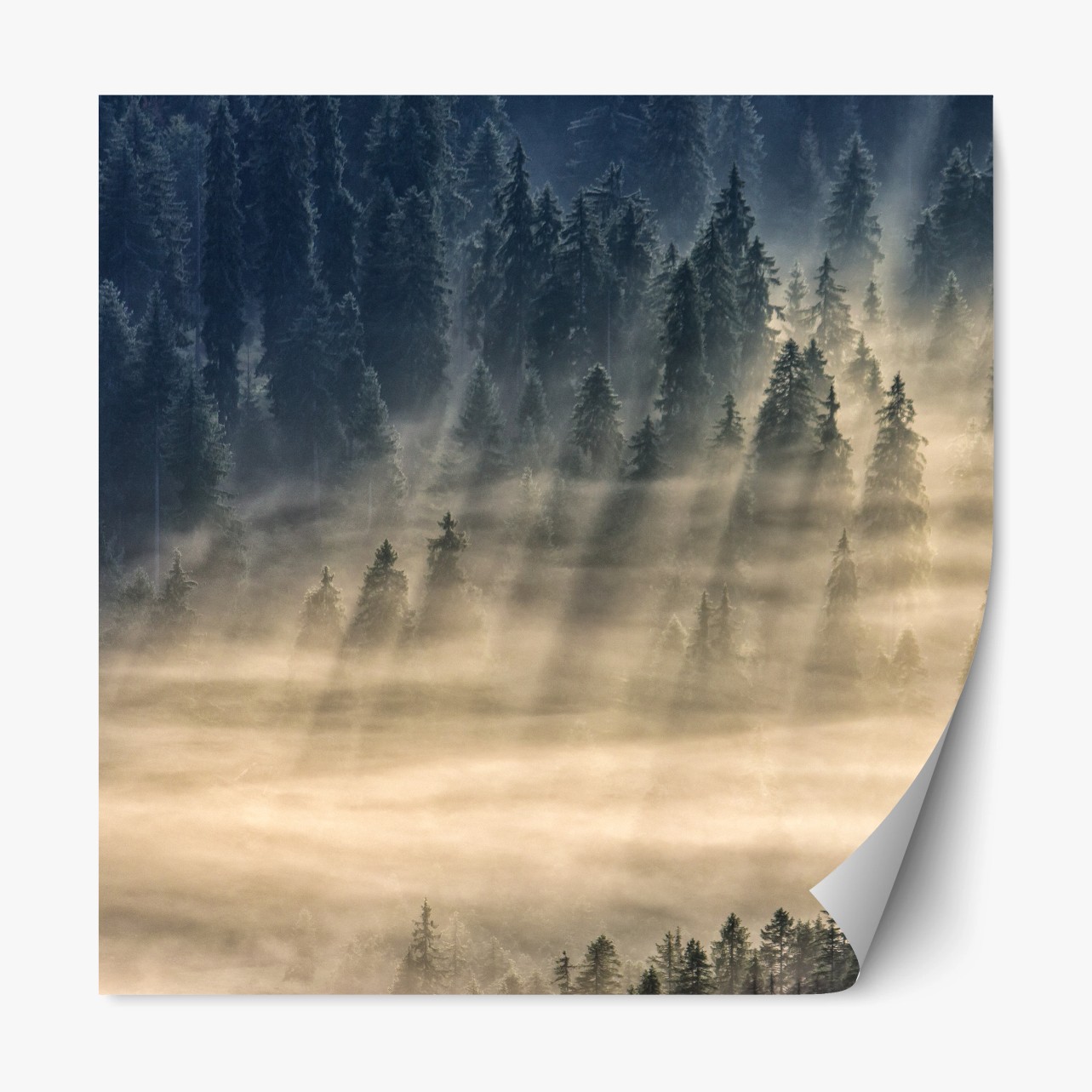 Repositionierbarer Aufkleber Nebliger fichtenwald im sonnenlicht