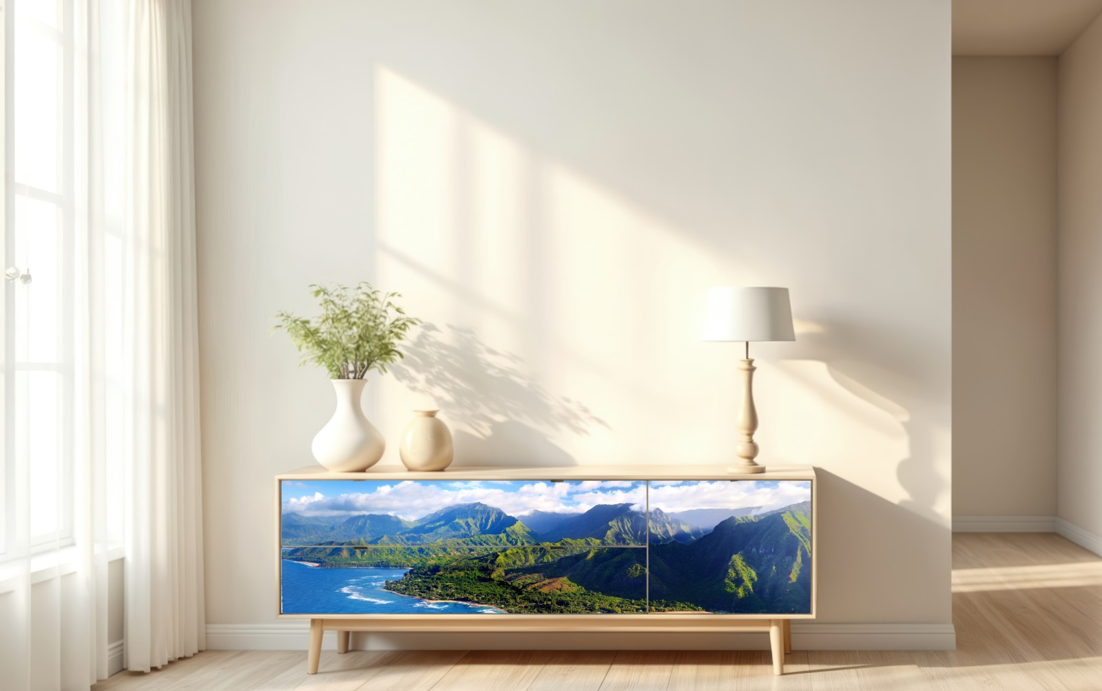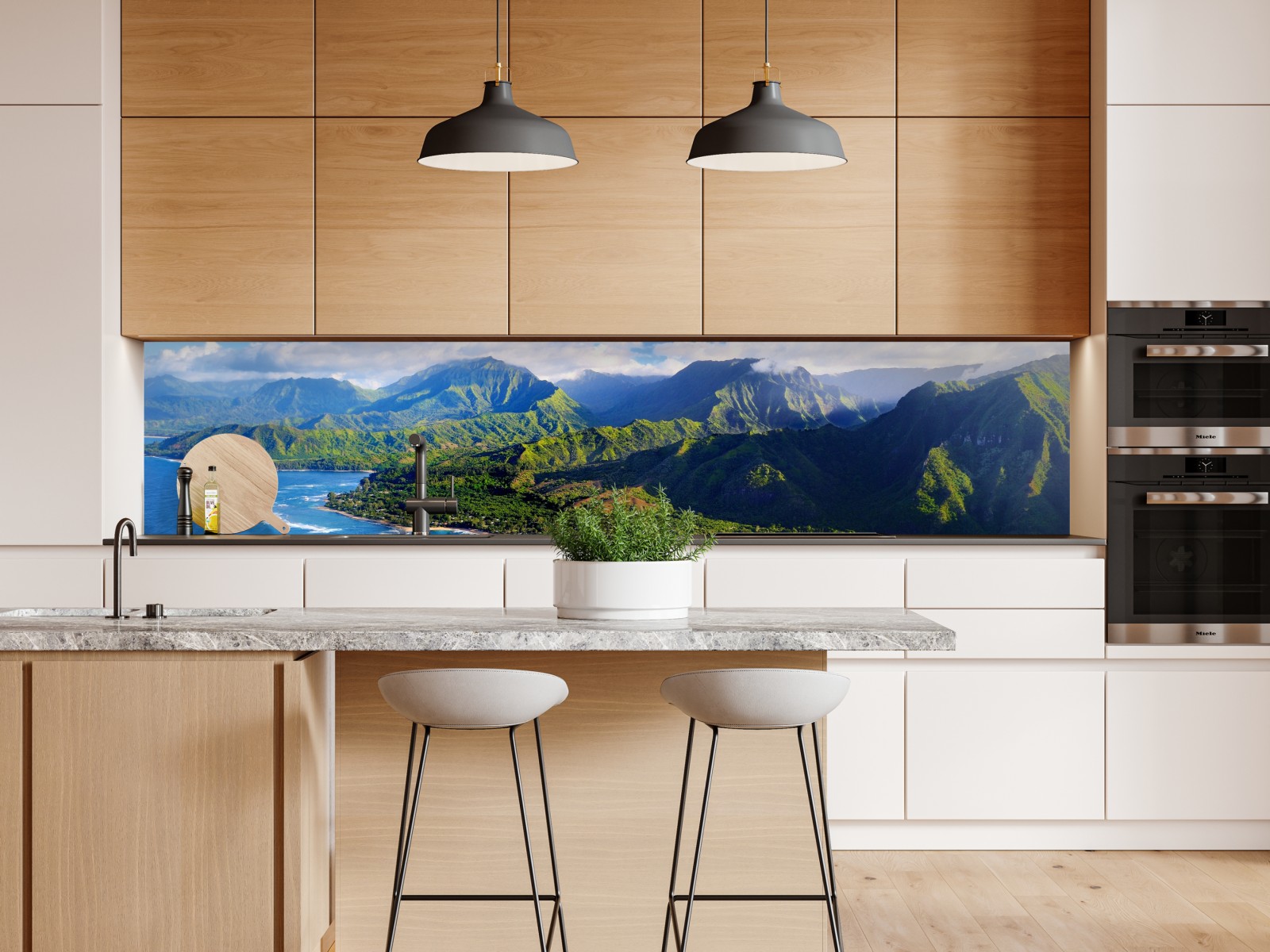 Bringen Sie beruhigende Meeresblicke in Ihr Zuhause mit diesem lebendigen Luftpanorama tropischer Küste, das tiefe Blautöne und üppiges Grün vereint.