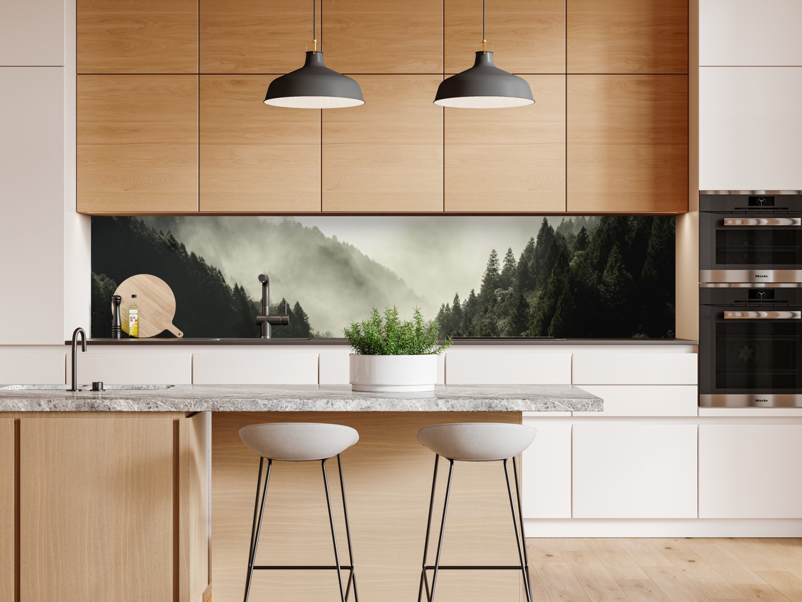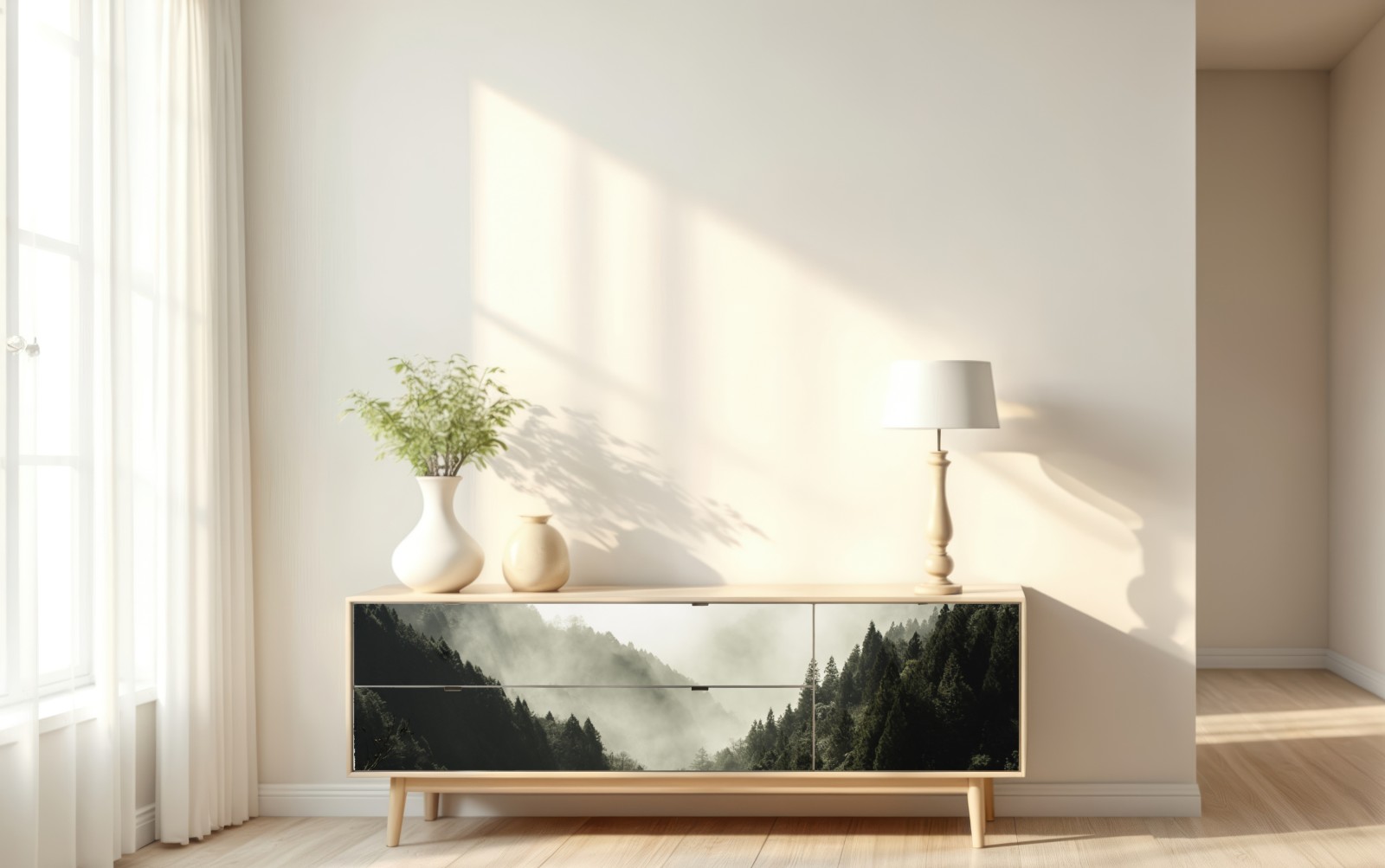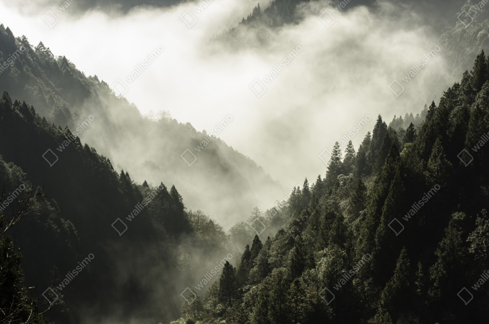 ein ruhiges, nebelverhülltes bergtal, das natürliche gelassenheit und atmosphäre in jeden raum bringt.