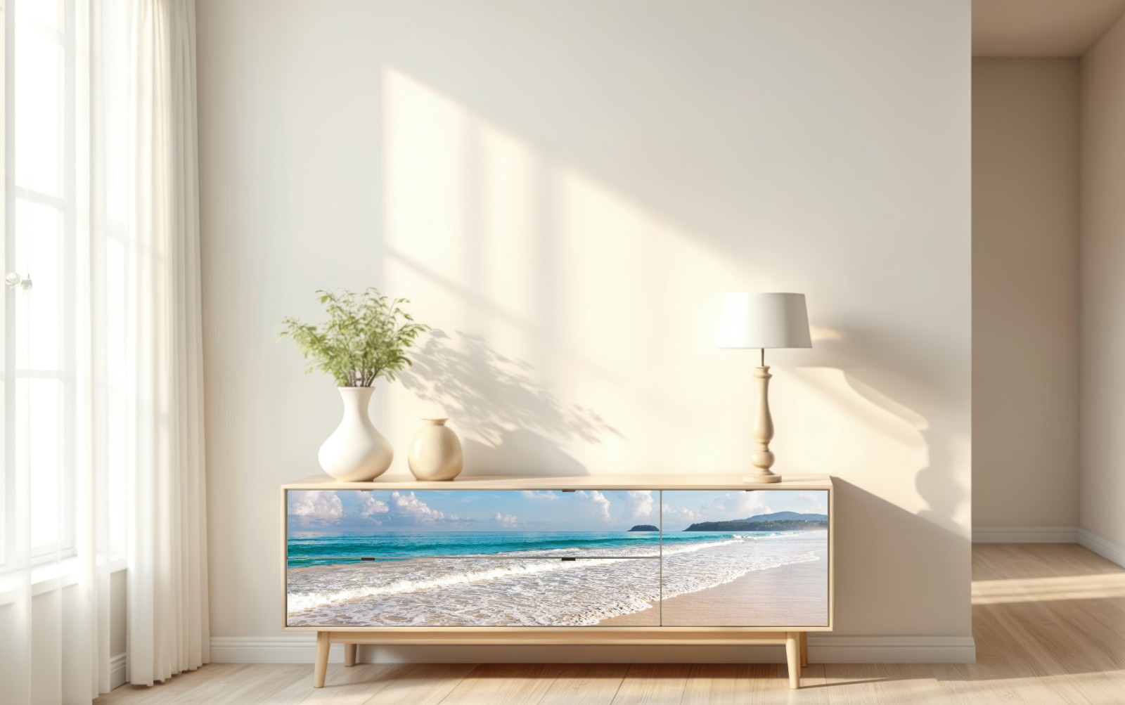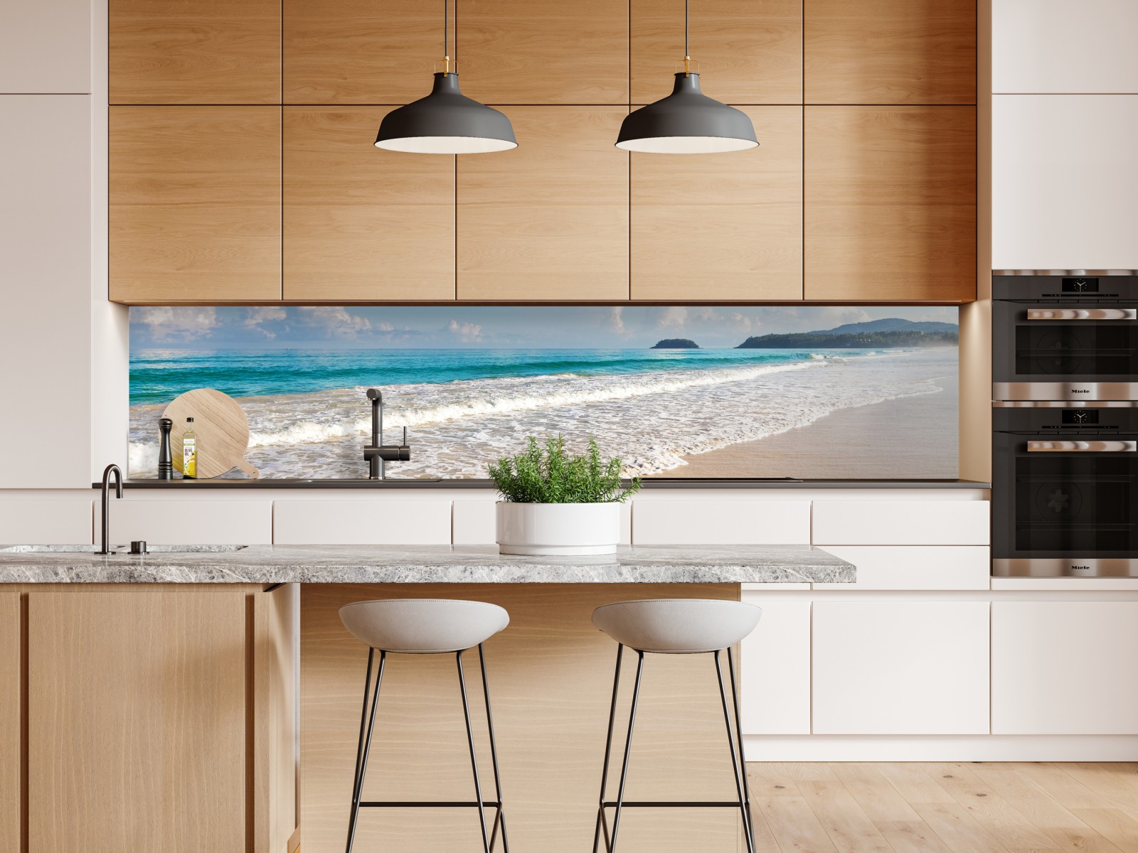 Bringen Sie die beruhigende Atmosphäre des Karon Strandes in Ihren Raum mit dieser lebendigen Meeresaufnahme mit türkisblauem Wasser, goldenem Sand und klarem Himmel.
