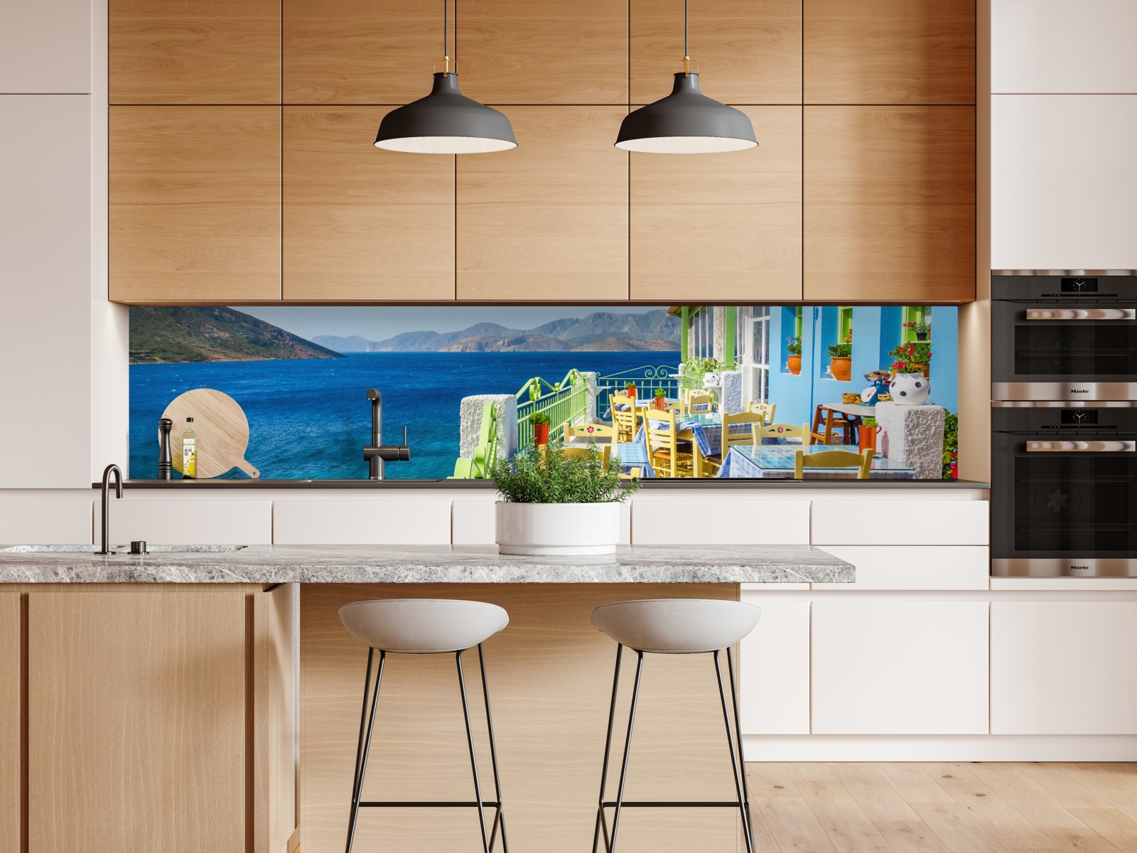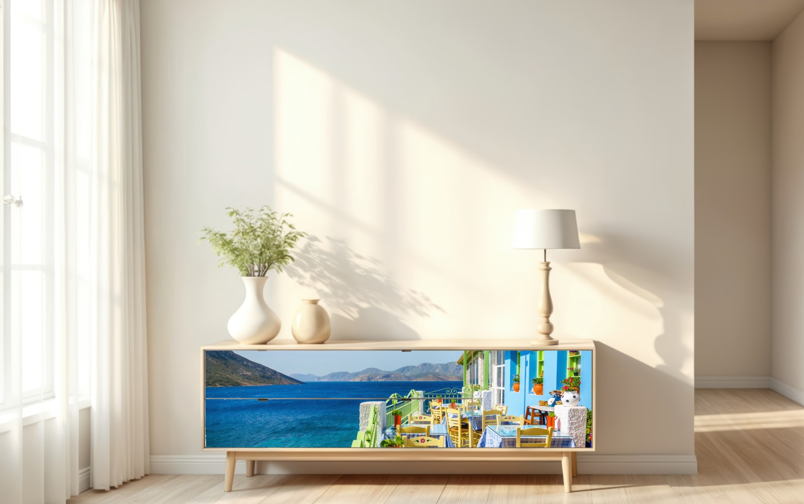 Helle Küstenterrasse mit Blick auf das türkisfarbene Meer bringt entspannte mediterrane Atmosphäre in Ihr Zuhause.