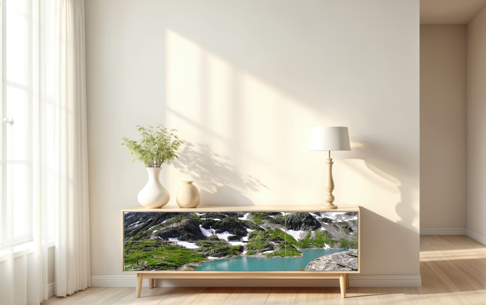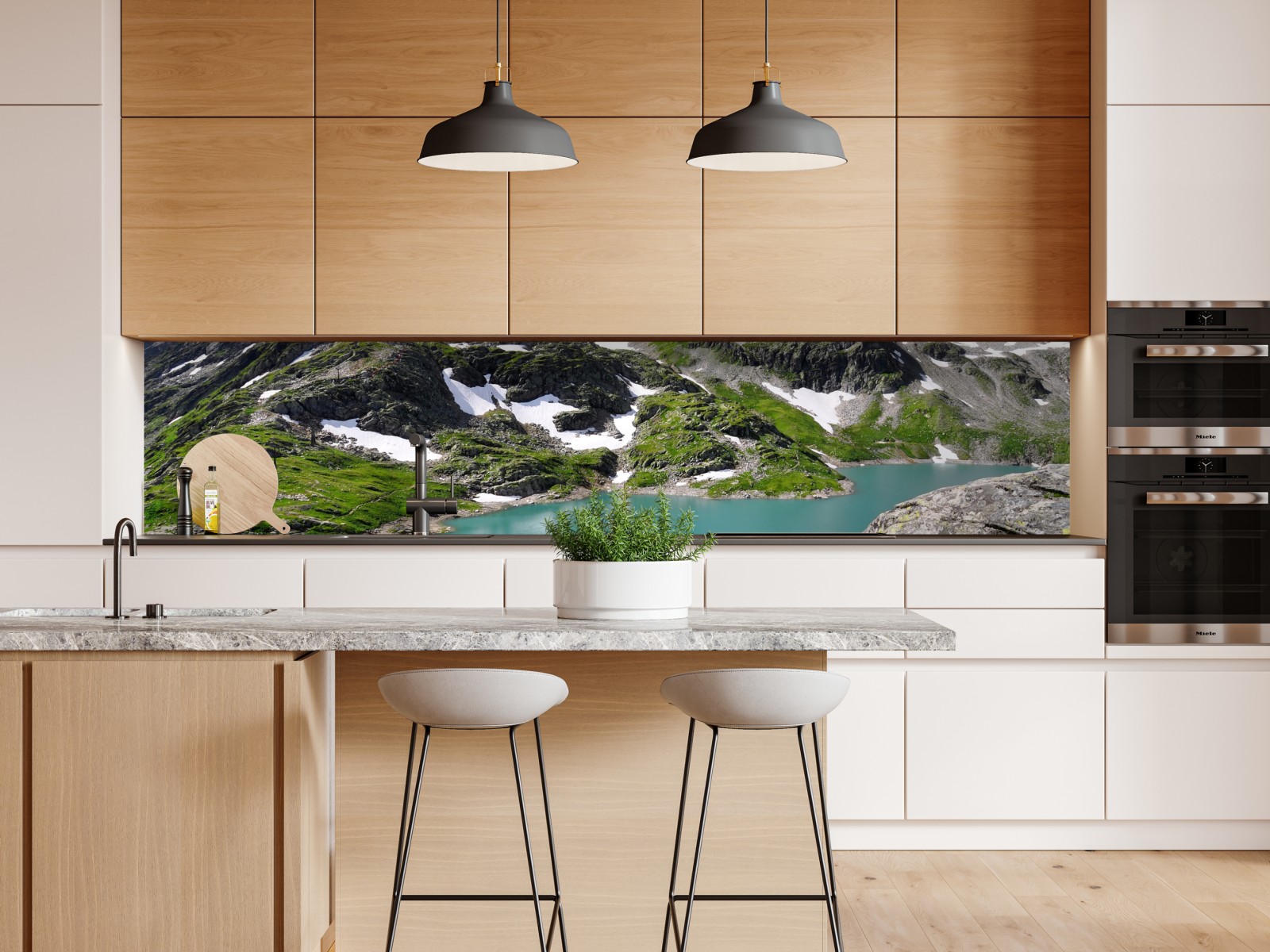 Atemberaubende Berglandschaft mit türkisfarbenem See, schneebedeckten Gipfeln und grünen Wiesen, die natürliches Flair in jeden Raum bringt.