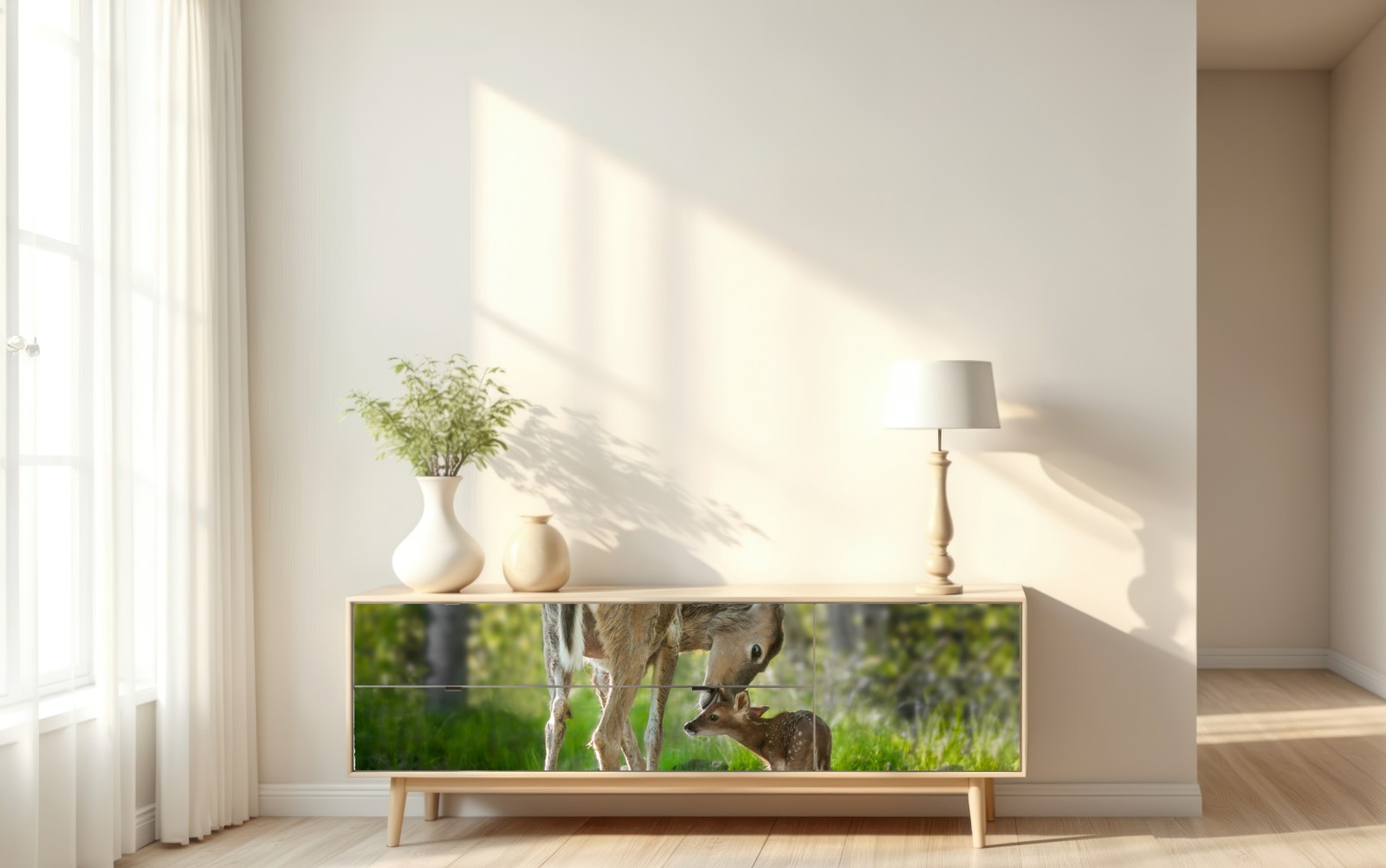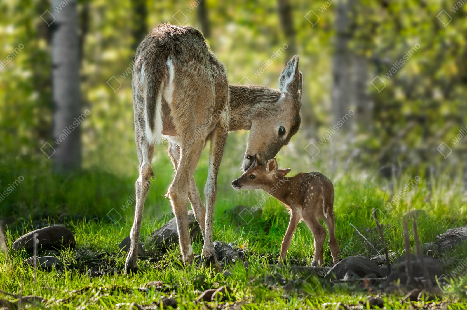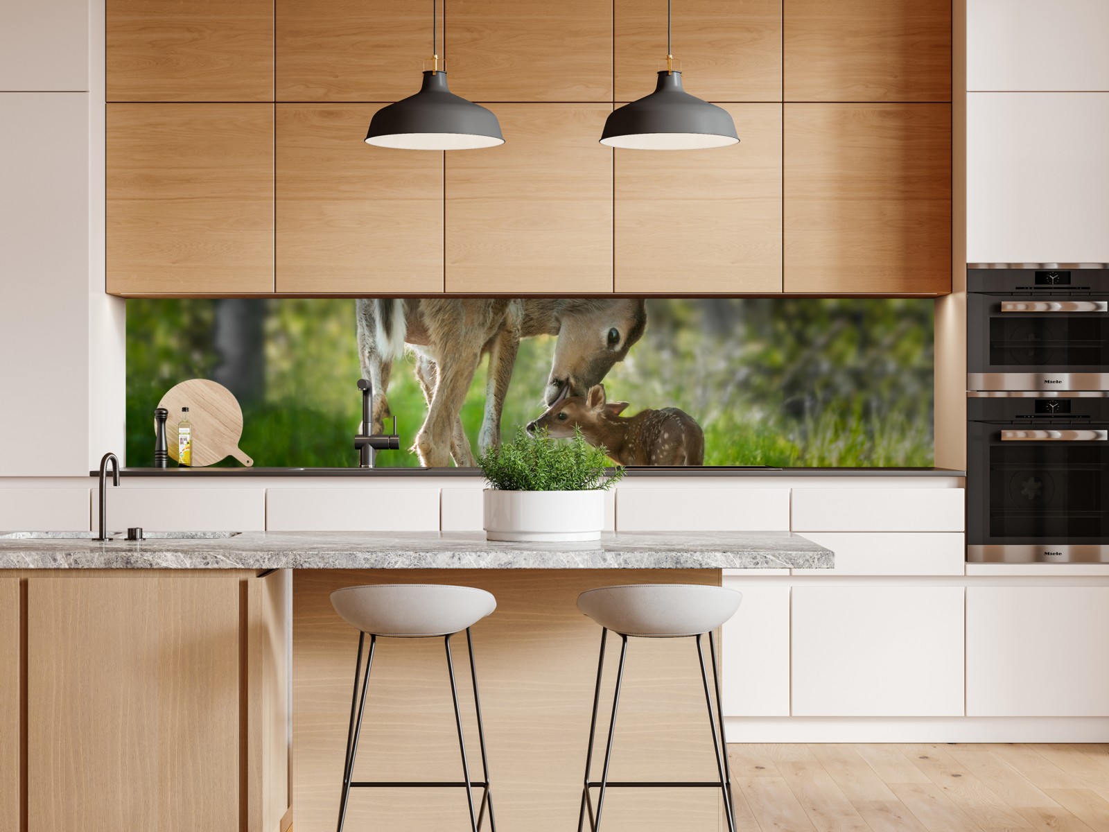 Ein zärtlicher Moment zwischen Hirsch und Kitz im sonnigen Wald, der Ruhe und Natur in Ihr Zuhause bringt.