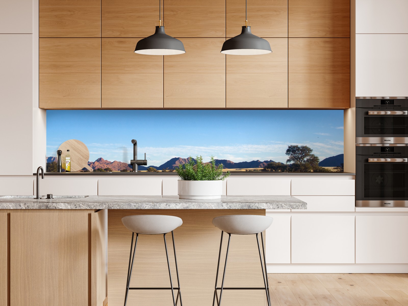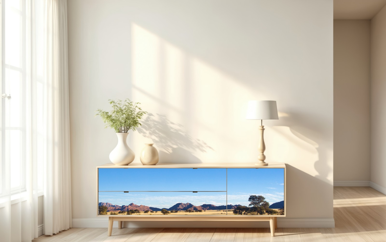 Eine beruhigende Savannenlandschaft mit goldenen Gräsern und fernen Bergen, ideal um natürliche Ruhe und ein Gefühl von Weite ins Zuhause zu bringen.