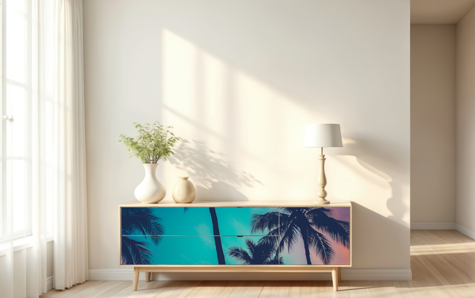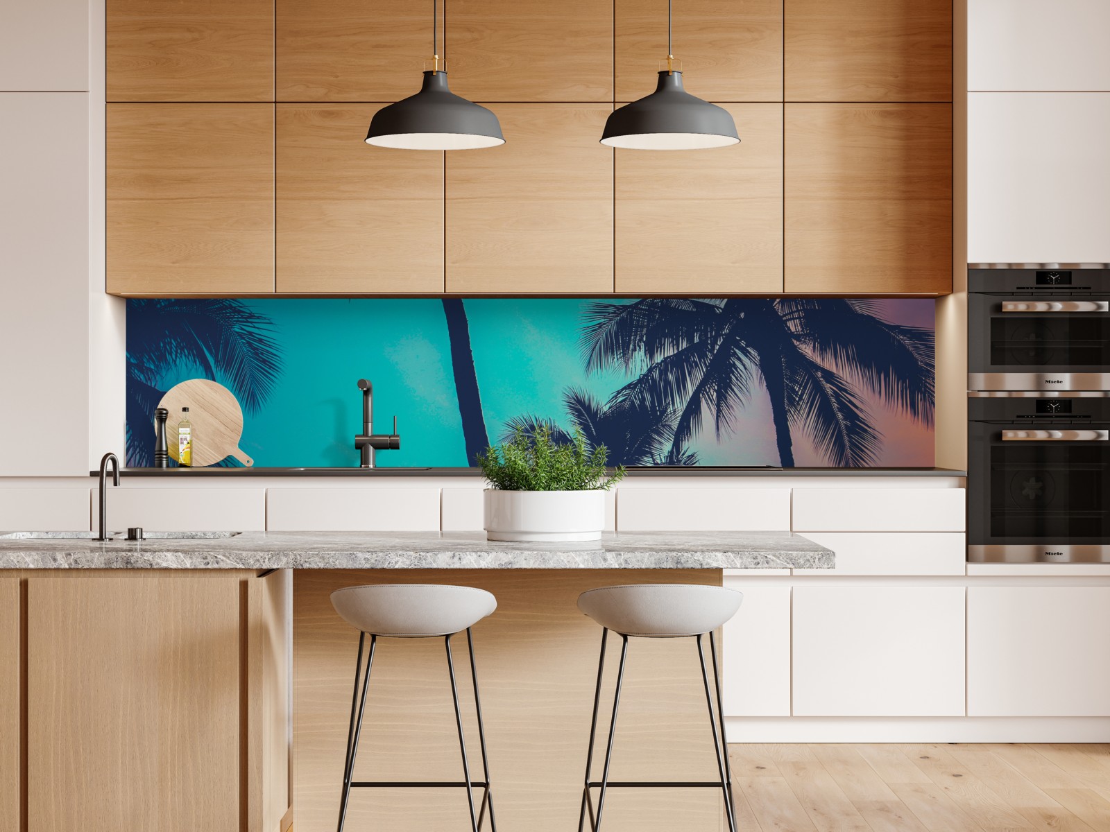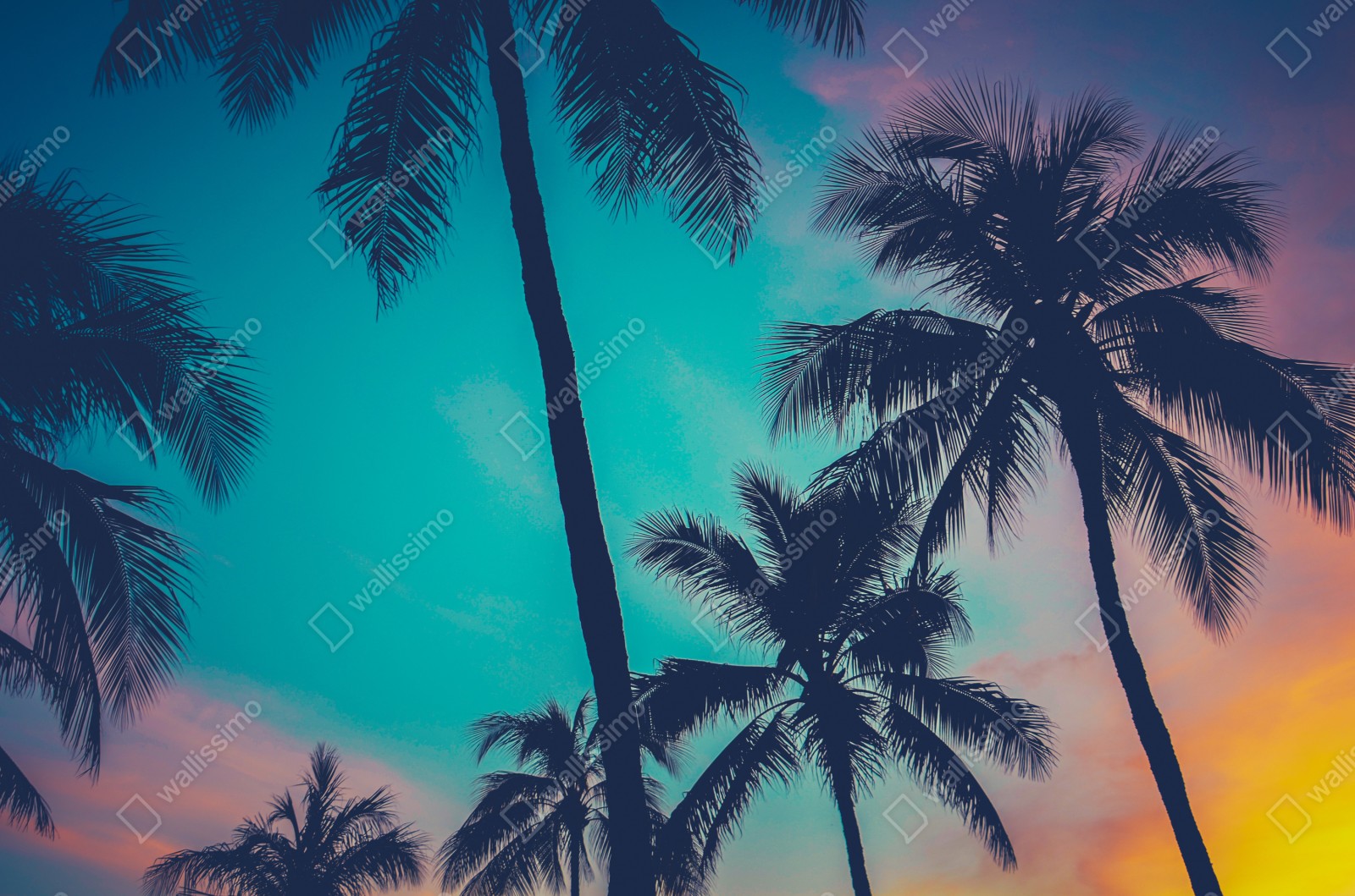 Bringen Sie tropisches Flair in Ihr Zuhause mit retro-gefilterten Palmen-Silhouetten vor einem türkisfarbenen Sonnenuntergang.