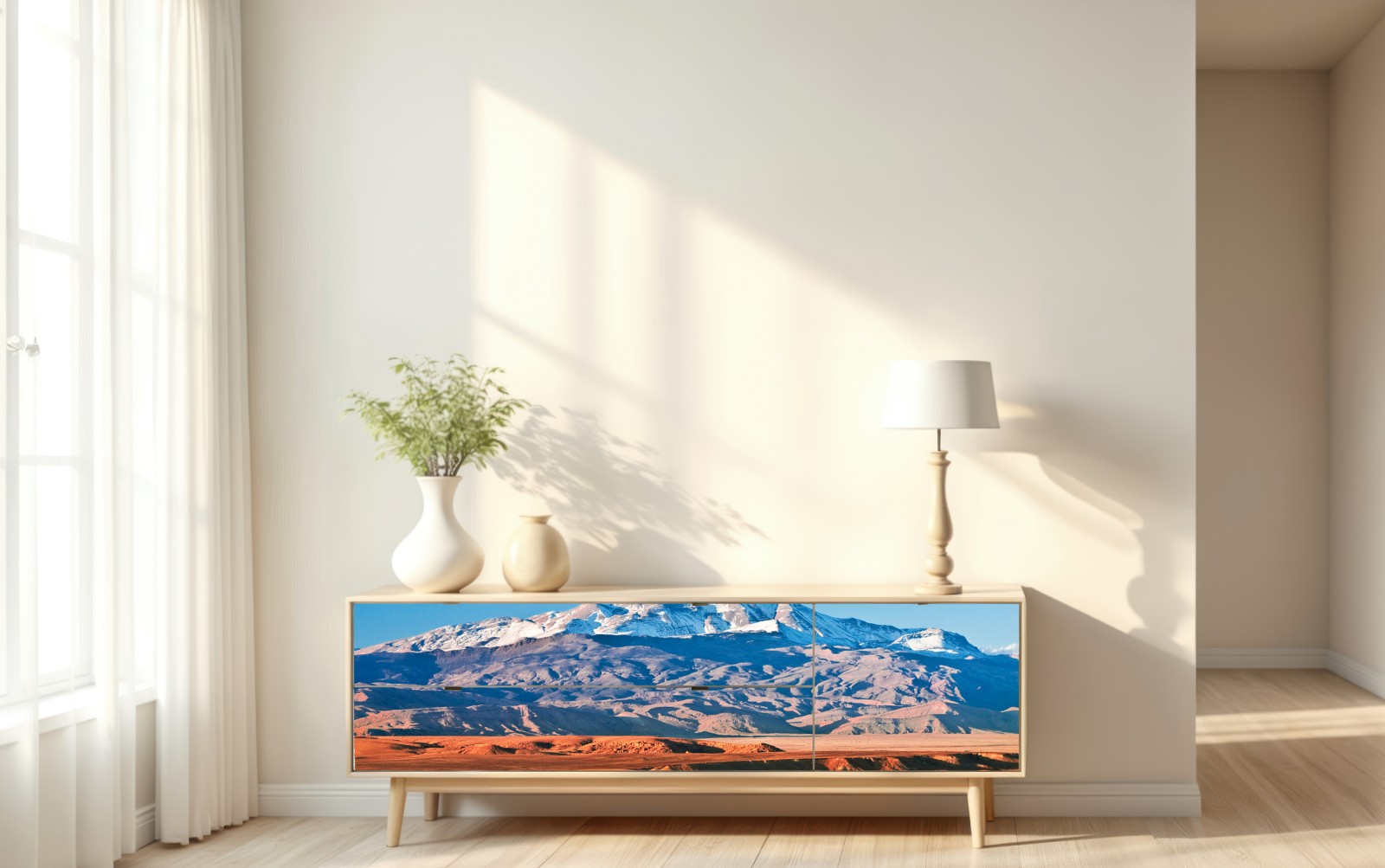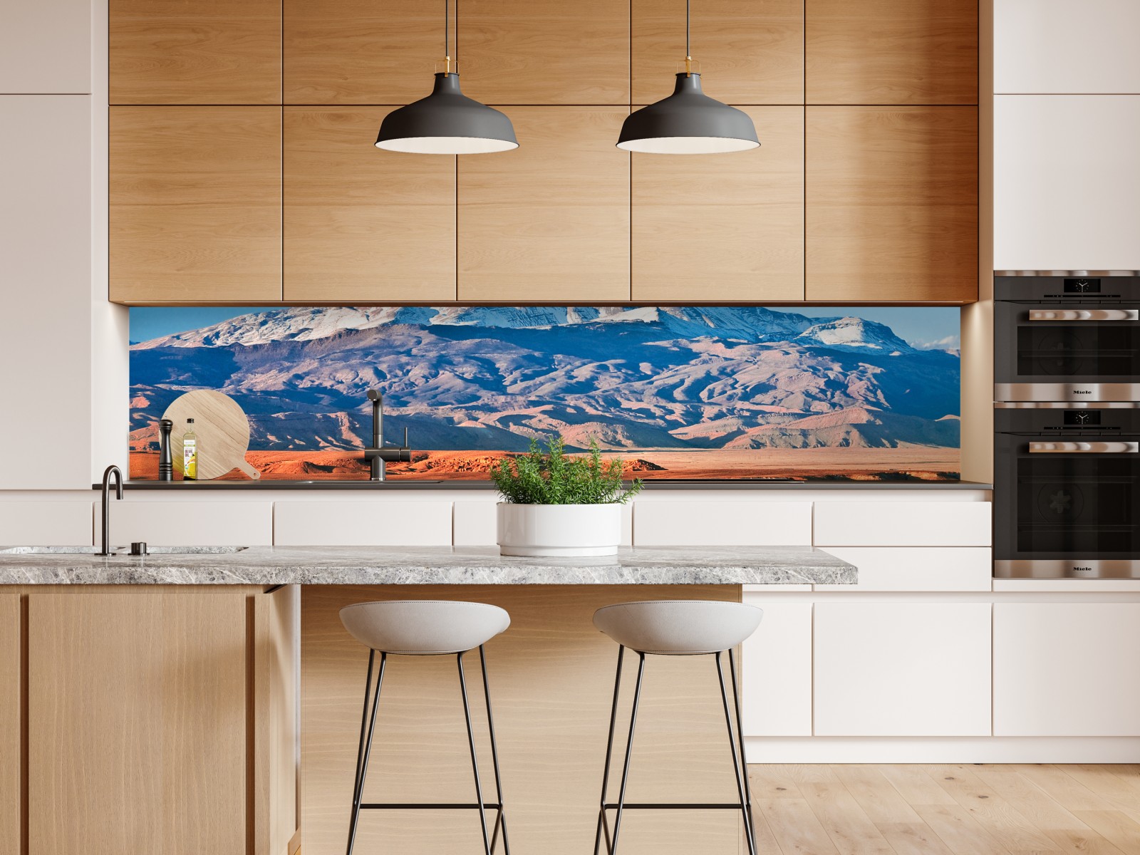 Beeindruckende Panoramaansicht sonnenbeschienener Wüstenebenen, die zu schneebedeckten Bergen unter klarem blauem Himmel führen, ideal, um Räumen Wärme und Tiefe zu verleihen.