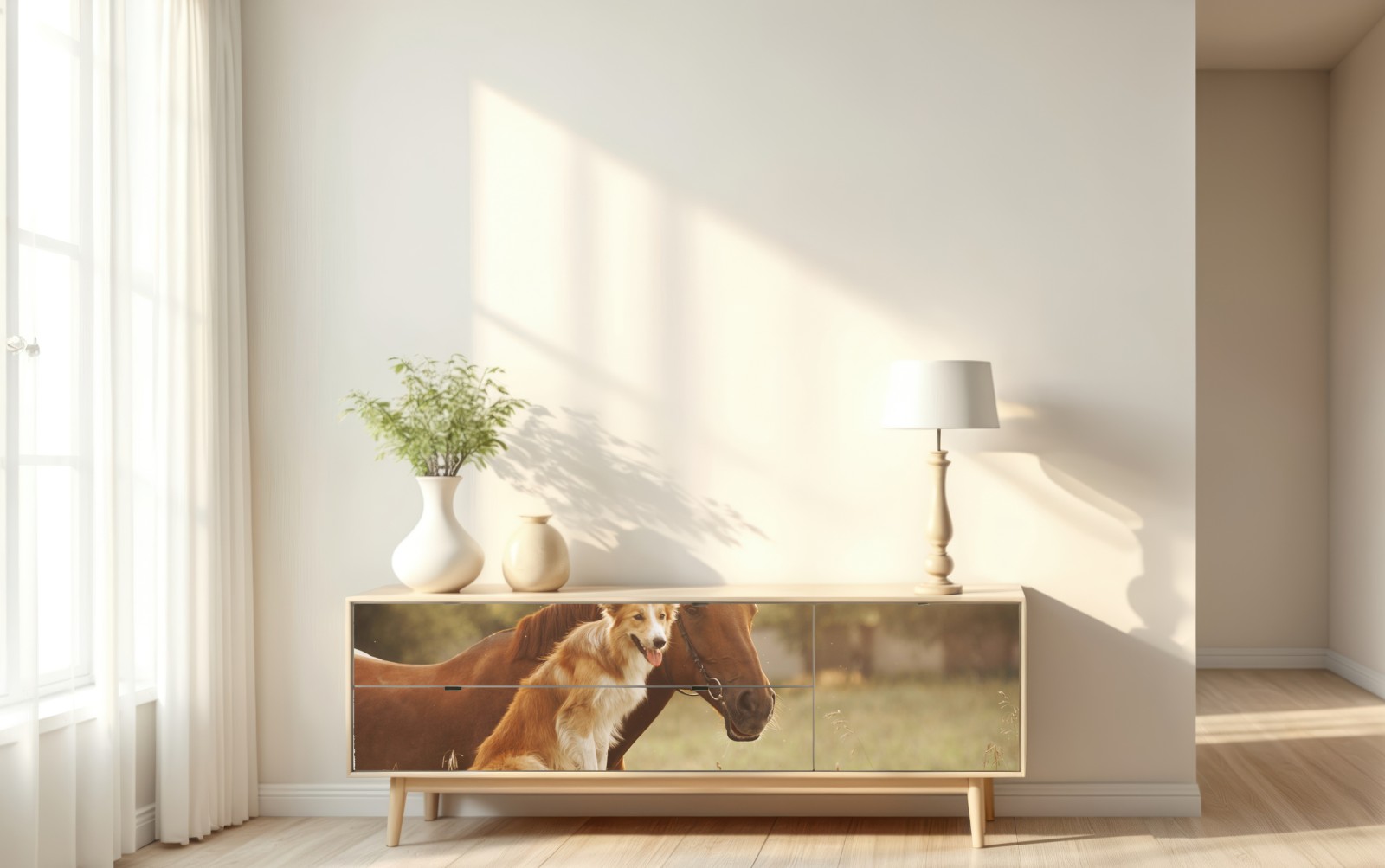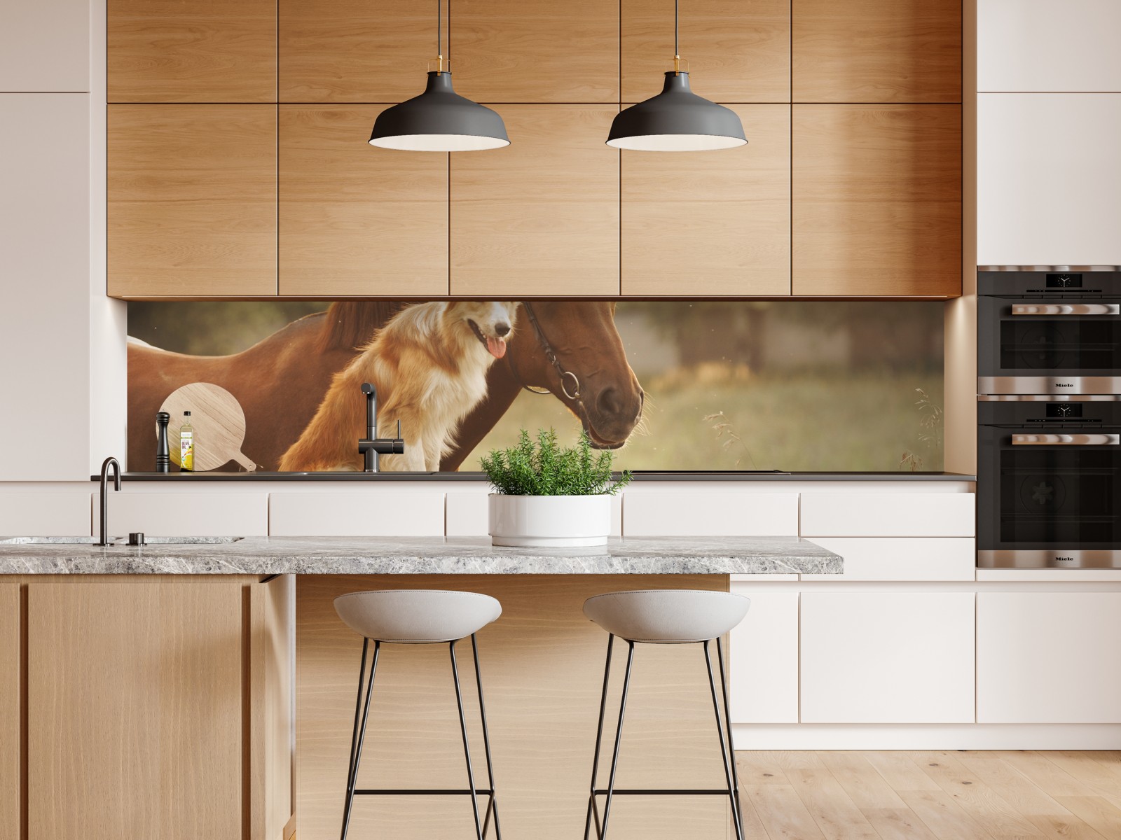 Ein warmes, sonnendurchflutetes Porträt von Hund und Pferd in idyllischer ländlicher Umgebung, ideal um rustikalen Charme und natürliche Wärme an die Wand zu bringen.