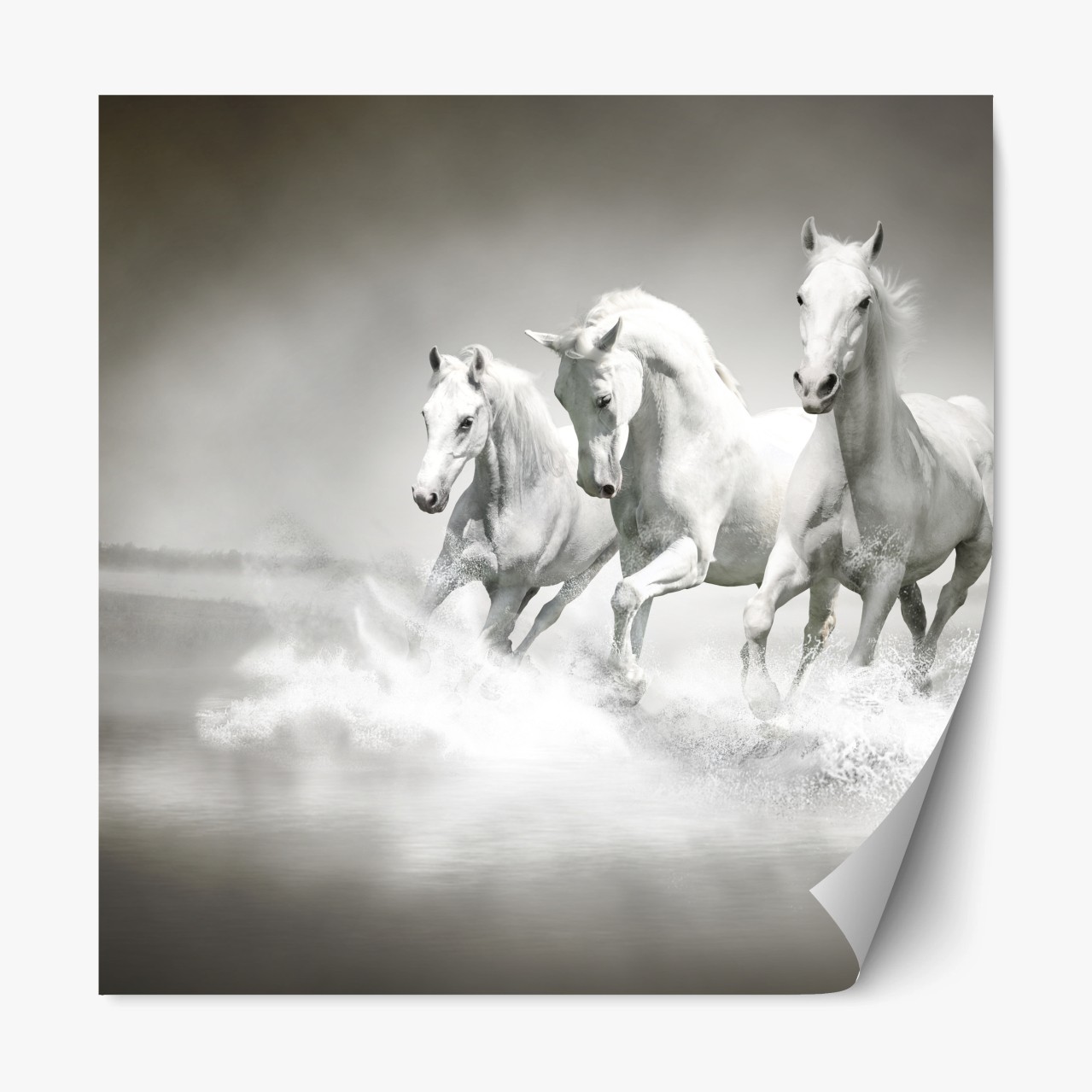 Repositionierbarer Aufkleber Drei weiße pferde im galopp durch wasser