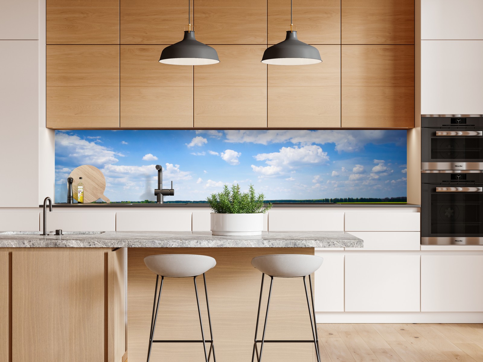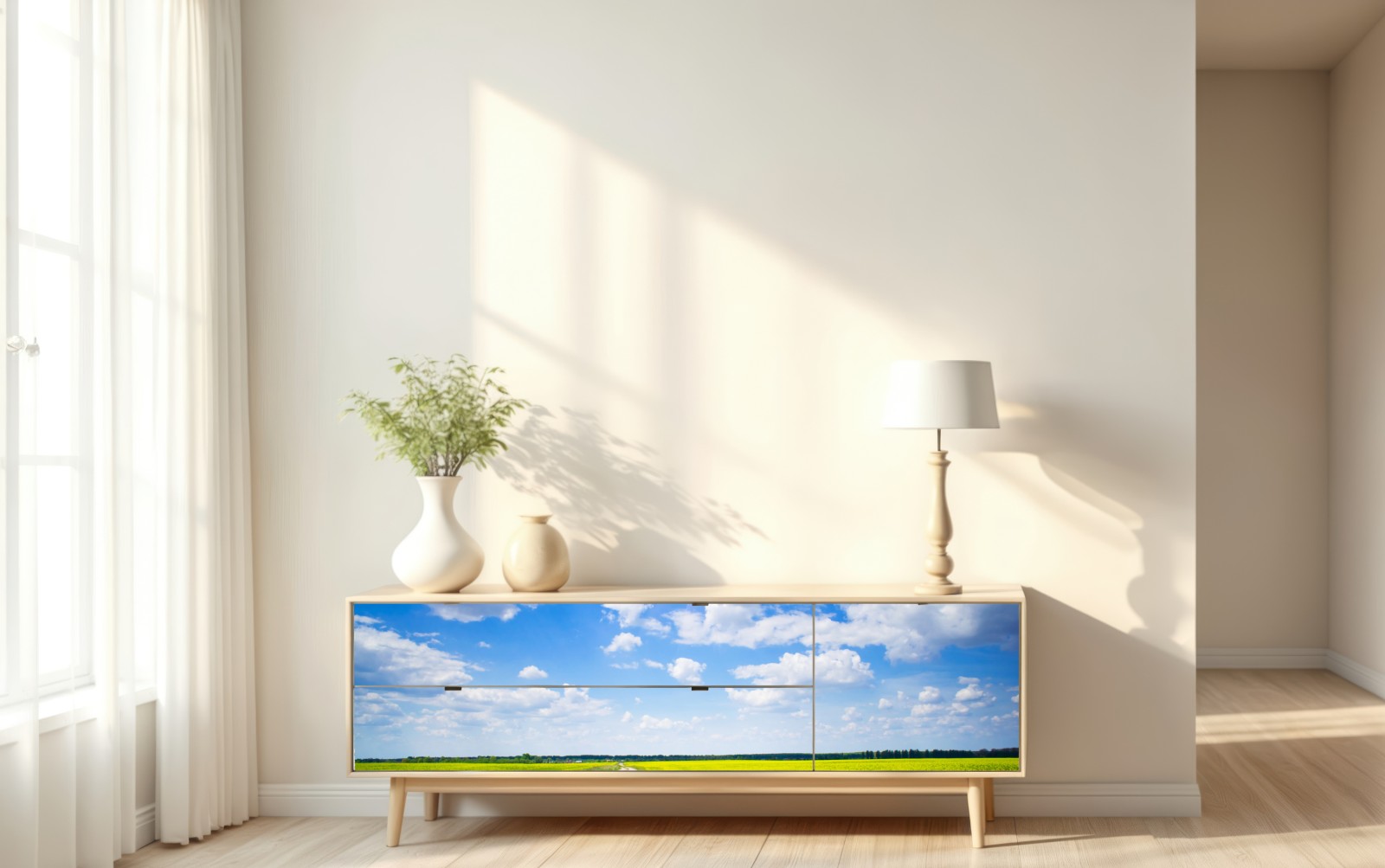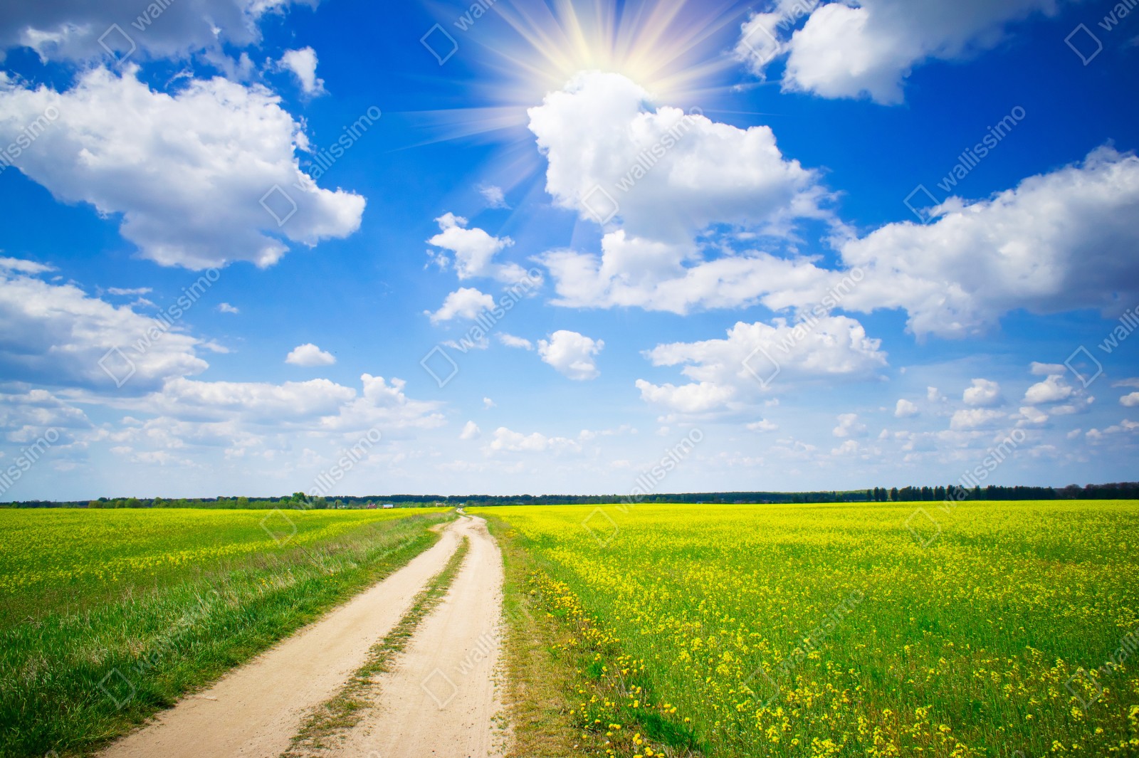 Helle gelbe Rapsfelder erstrecken sich bis zum Horizont unter einem leuchtend blauen Himmel und verleihen jedem Raum Ruhe und Weitläufigkeit.
