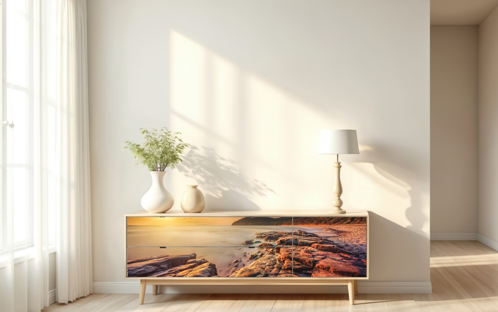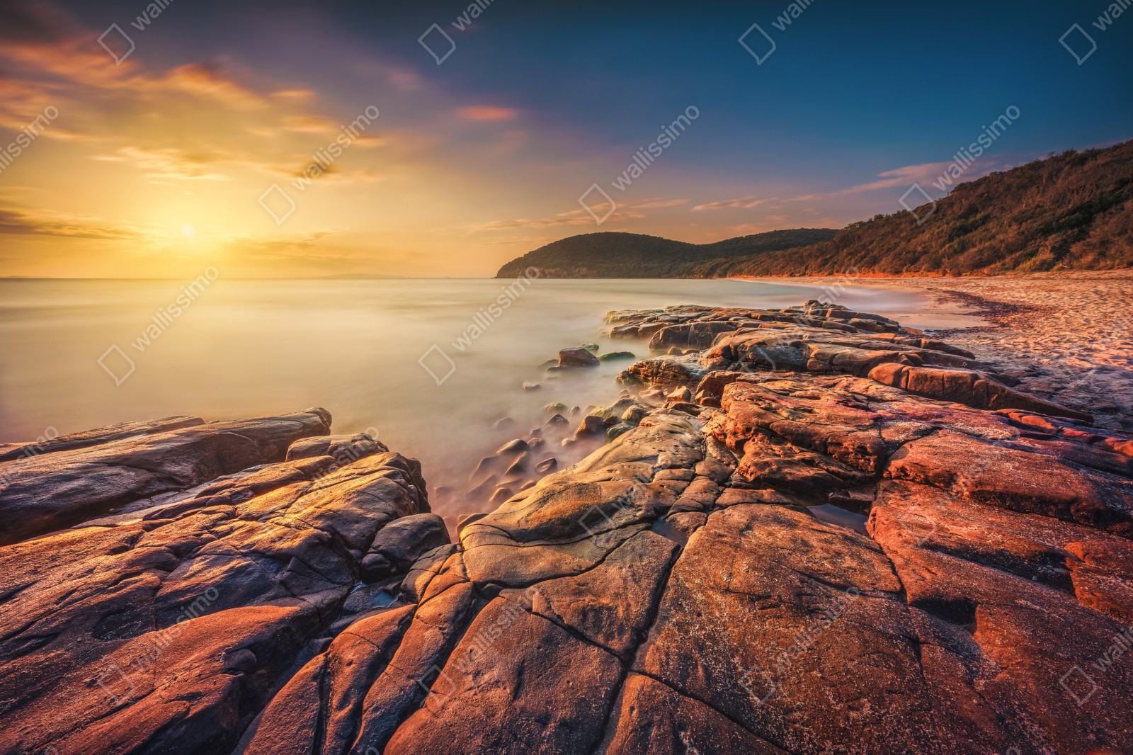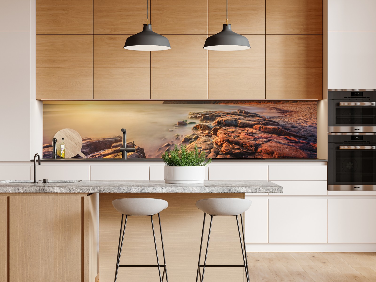 Tauchen Sie ein in das warme Licht eines Mittelmeer-Sonnenuntergangs an Cala Violina und verleihen Sie Ihrem Raum Ruhe und lebendige Farben.