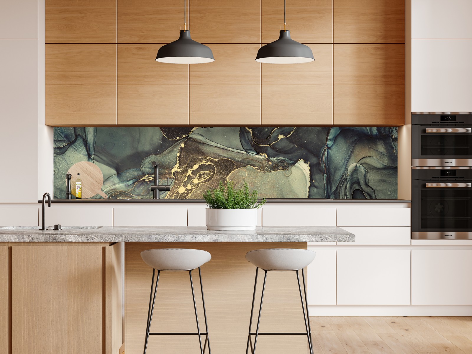 Elegante türkis-goldene fließende abstraktion mit schimmernden akzenten verleiht modernen räumen einen luxuriösen, verträumten touch.