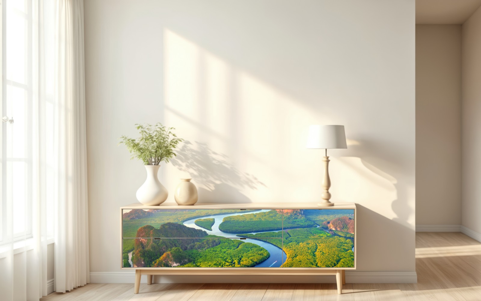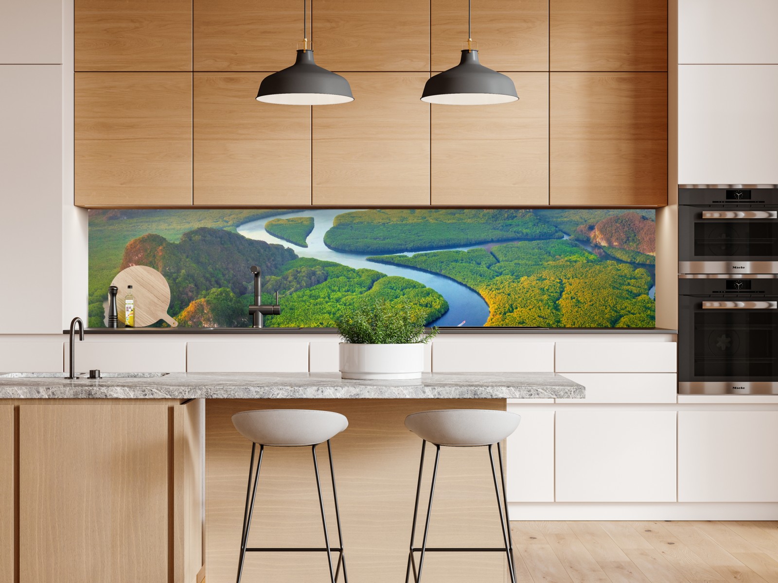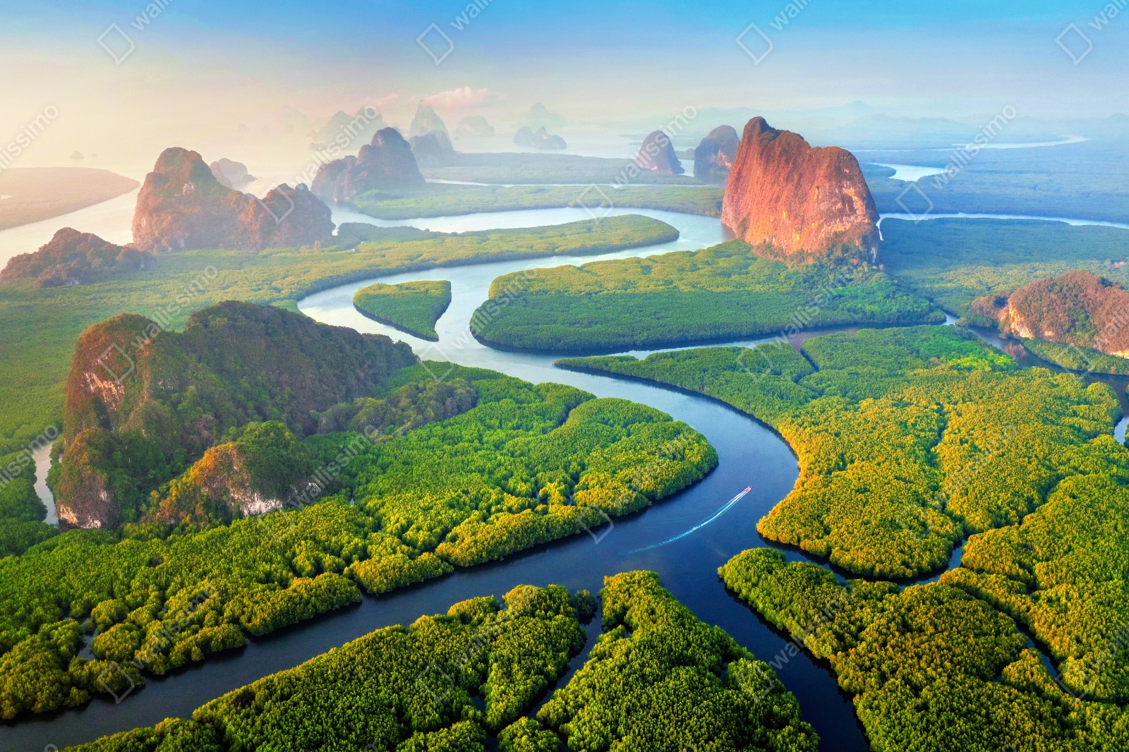 Atemberaubende Luftaufnahme der Phang Nga Bucht bei Sonnenaufgang mit gewundenen Flüssen und üppigen Mangroven, ideal zur Schaffung einer natürlichen Atmosphäre.