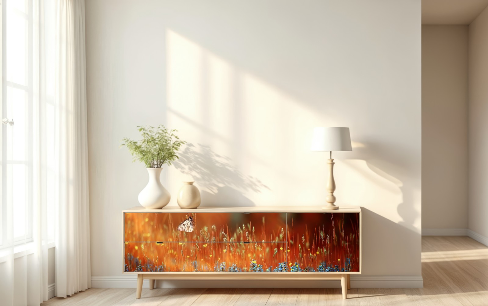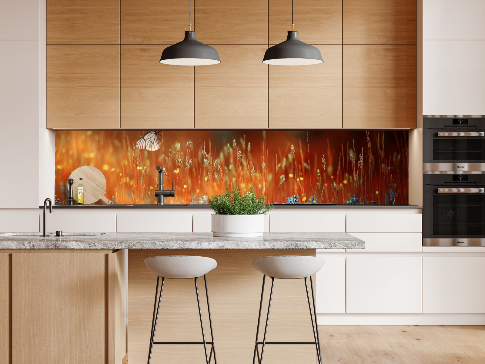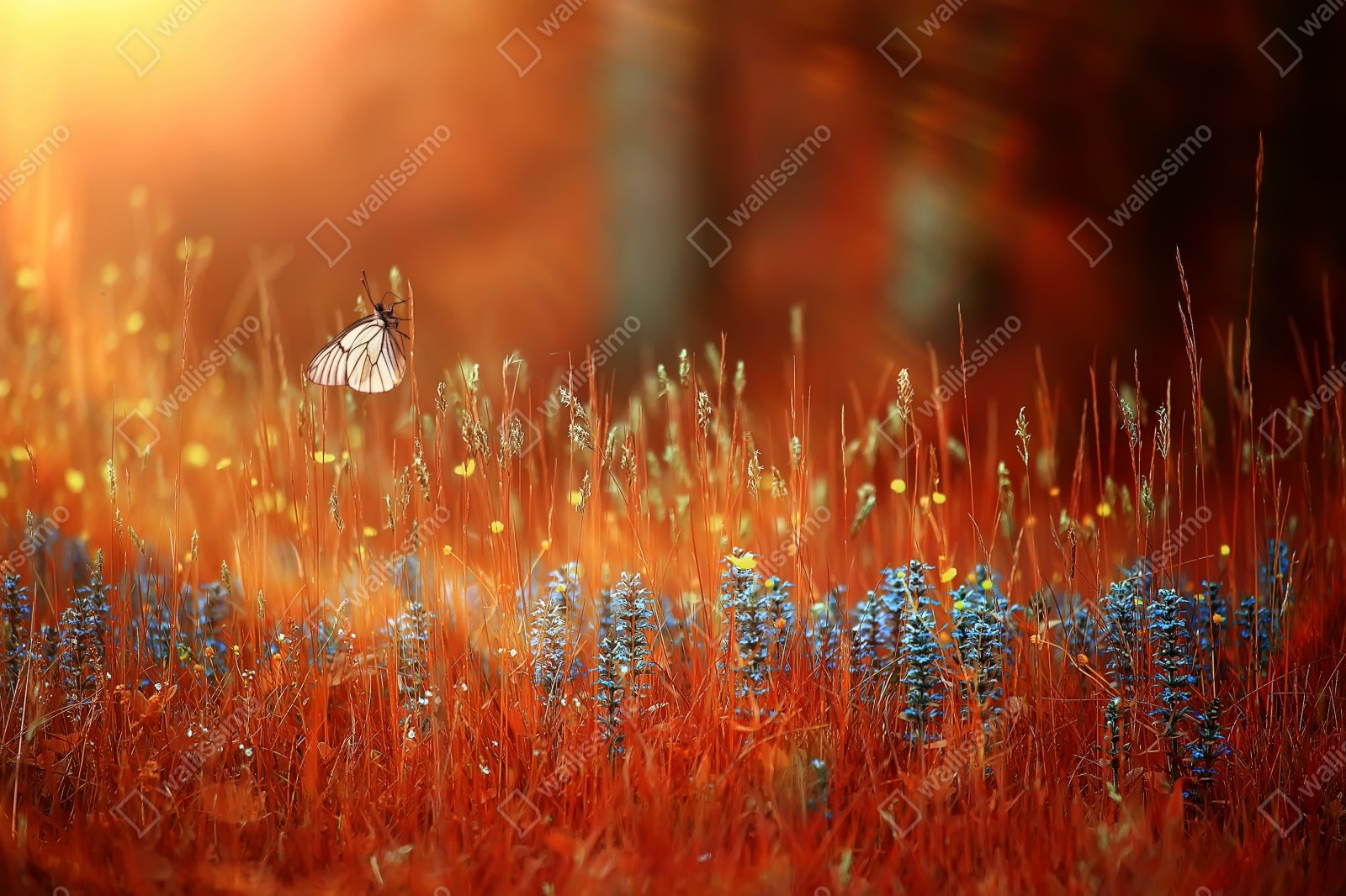 Eine träumerische Nahaufnahme eines Schmetterlings über wilden Blumen im warmen, goldenen Licht, ideal um jedem Raum natürliche Romantik zu verleihen.