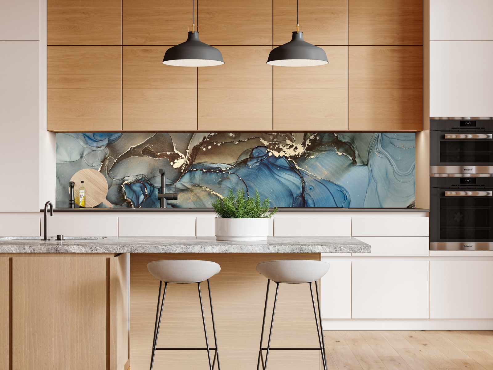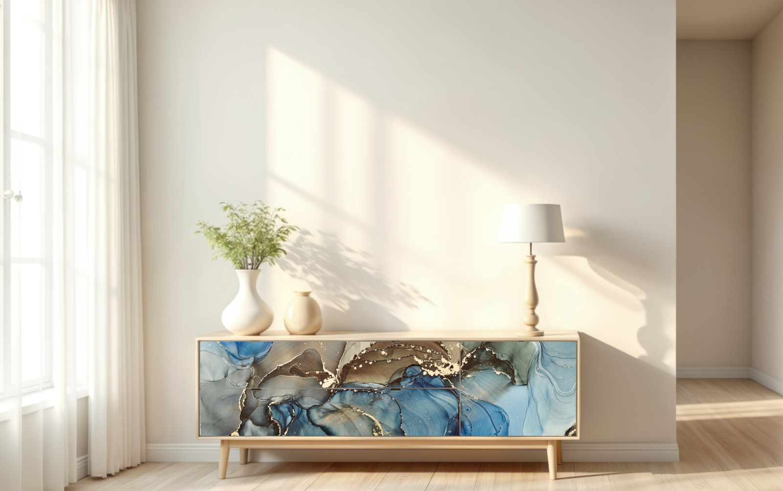 Luxuriöse Alcohol-Ink-Abstraktion mit tiefen Blautönen und goldenen Akzenten, die eine ruhige, fließende Komposition für moderne Innenräume schafft.