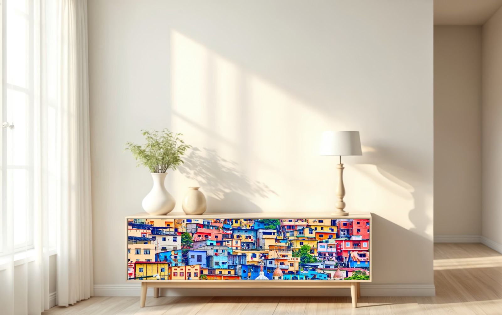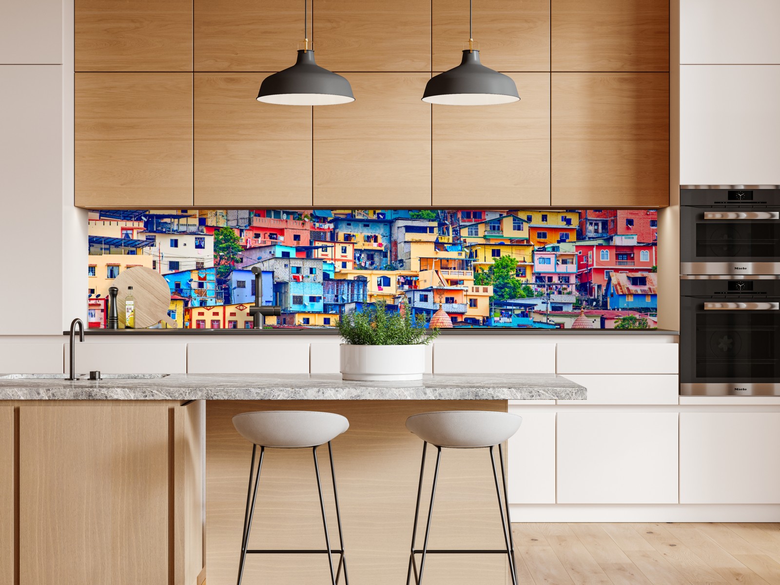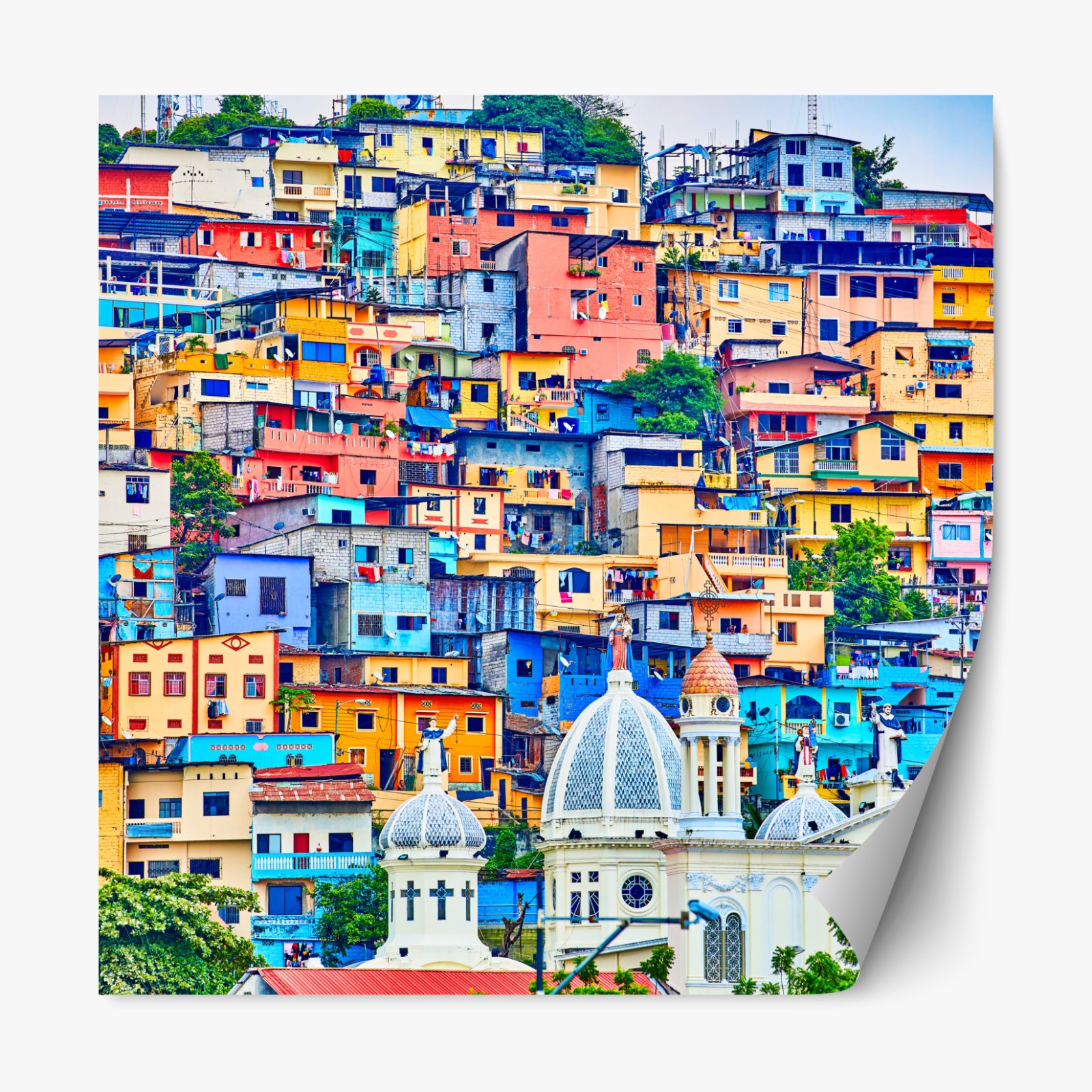 Lebendige Ansicht von Las Peñas auf dem Santa Ana hügel in Guayaquil mit einem Meer bunter Häuser und historischer Architektur, die jedem Raum Charakter verleiht.