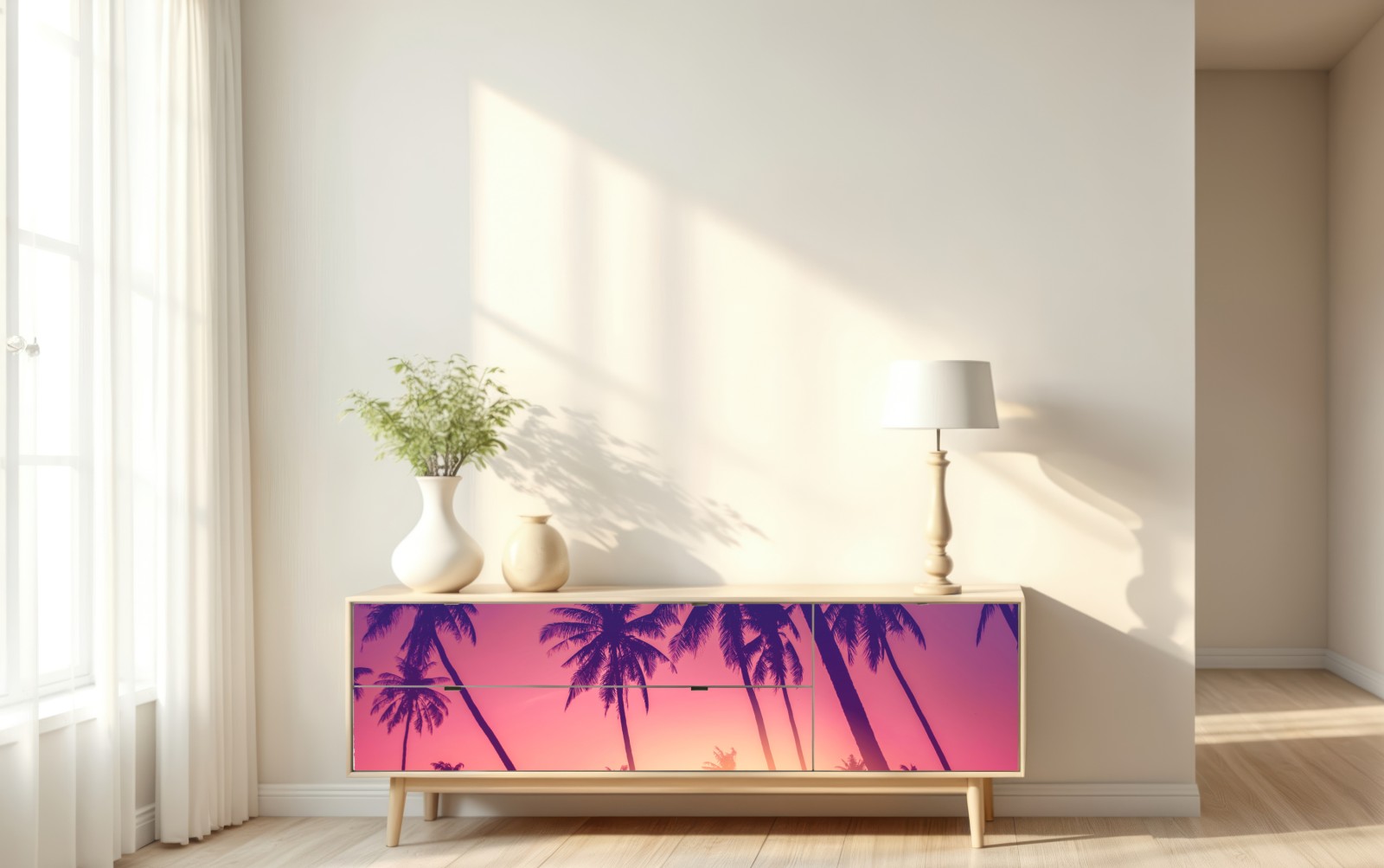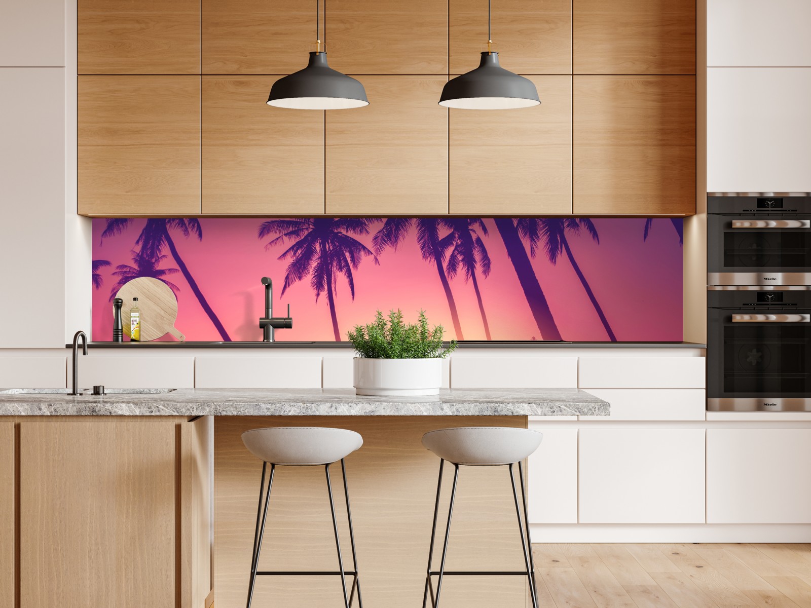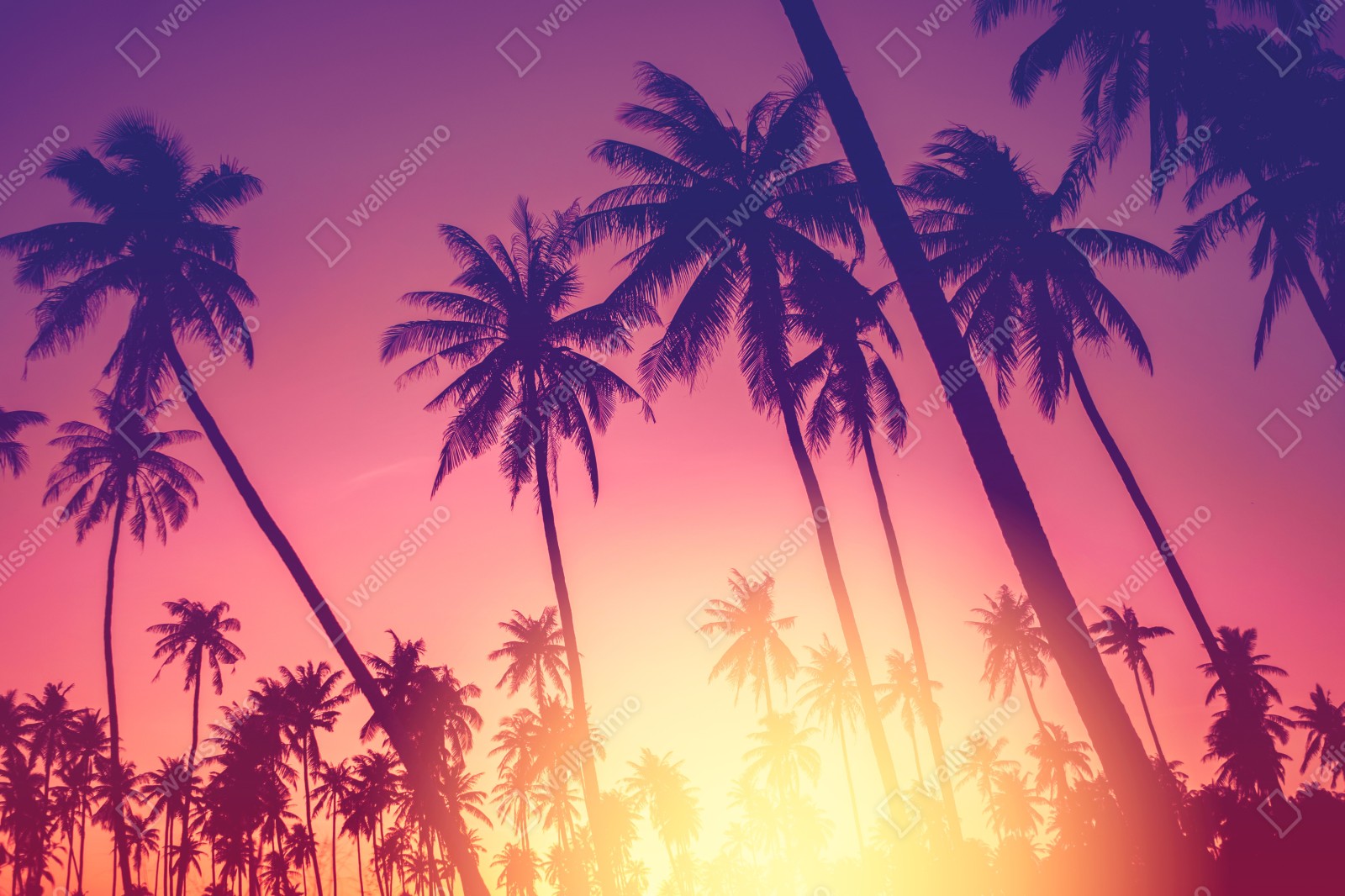 Lebendiger tropischer Sonnenuntergang mit Palmensilhouetten und warmer Duotone-Palette, der jedem Raum sommerliches Flair verleiht.