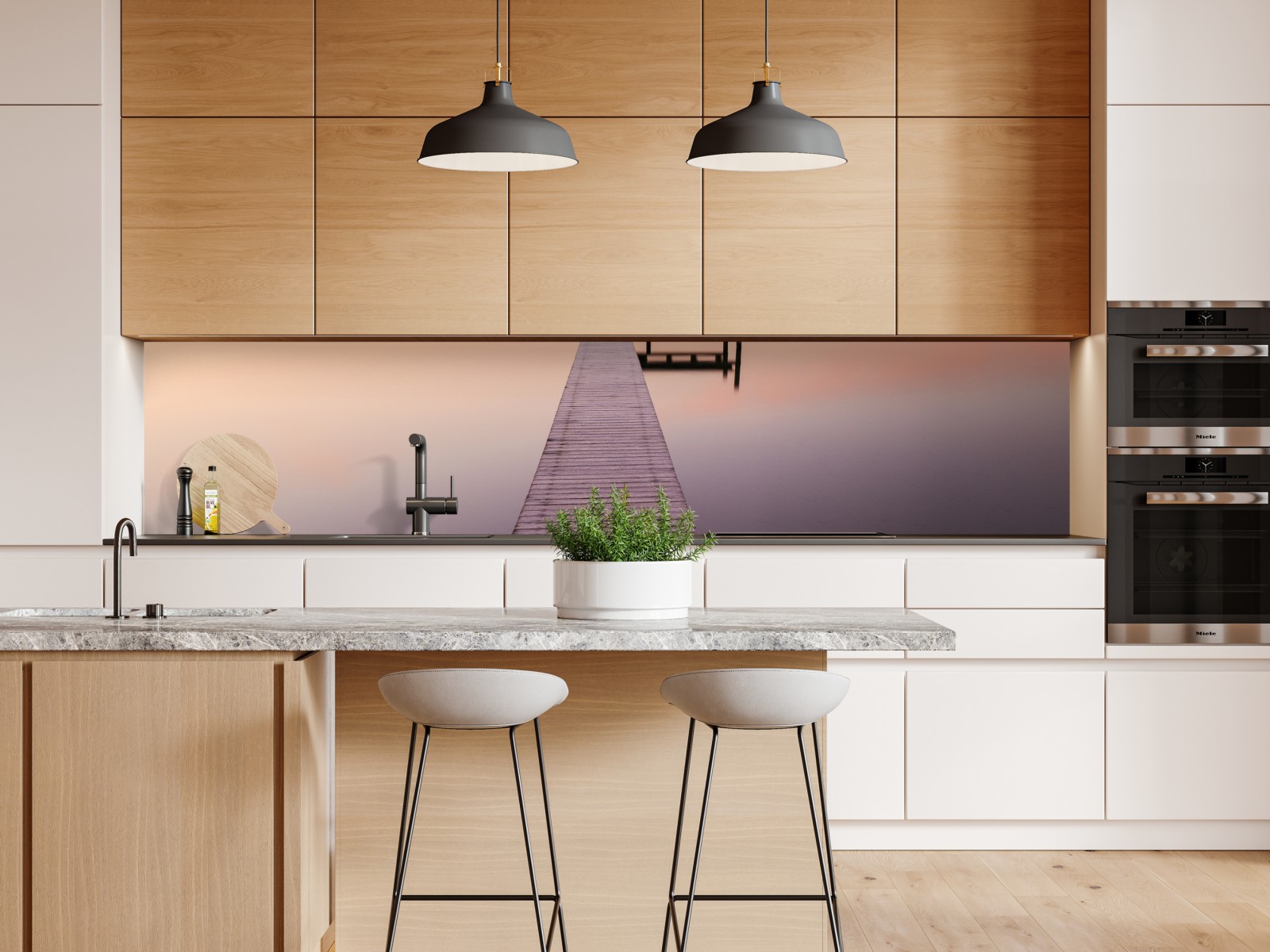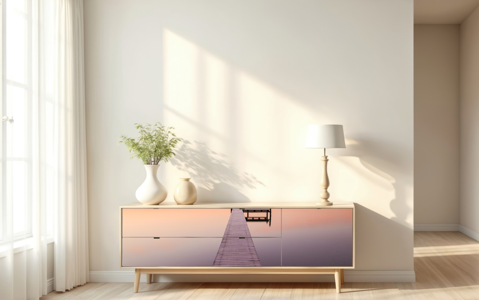 Sanfte Pastelltöne und ein minimalistischer Steg schaffen eine beruhigende Atmosphäre in jedem Raum.
