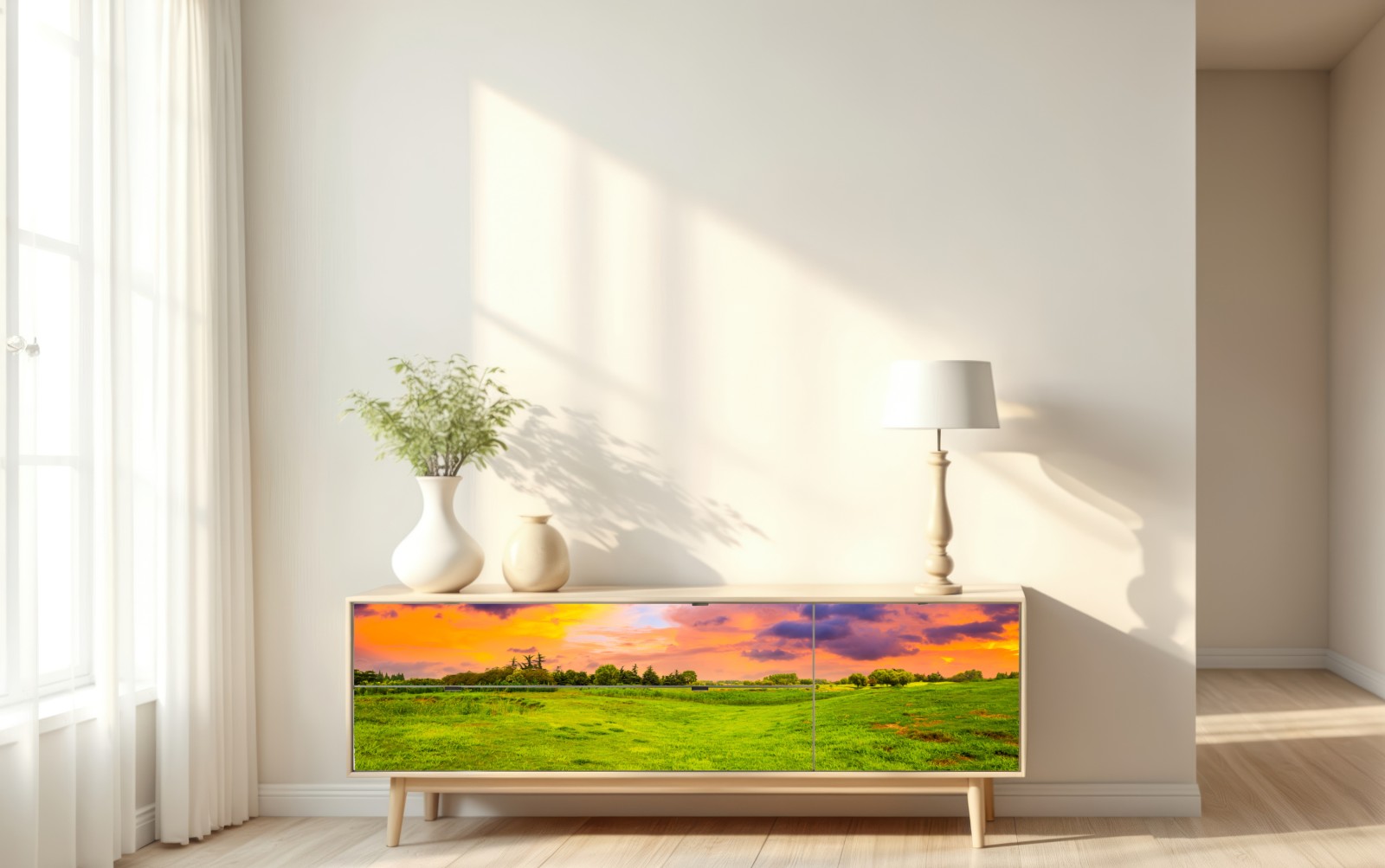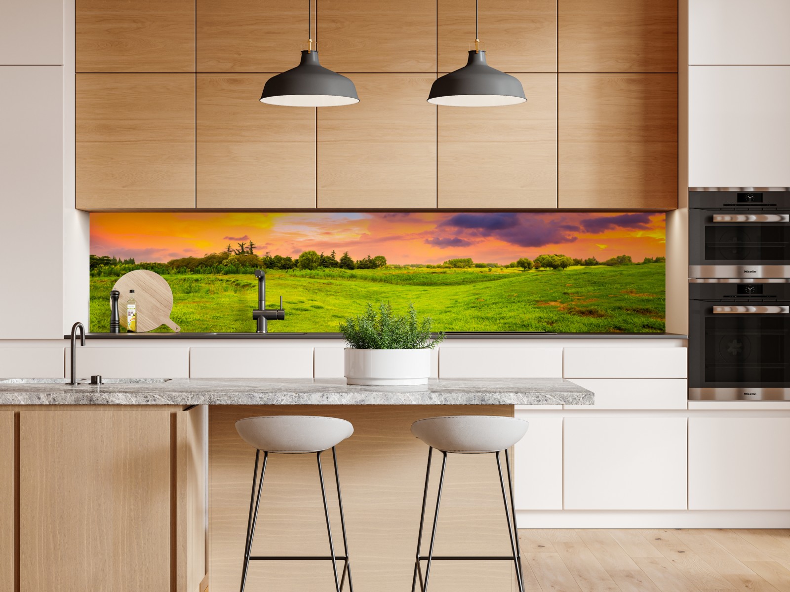 Ein leuchtender Sonnenuntergang über einer üppigen grünen Wiese bringt Wärme und Ruhe in jeden Raum.