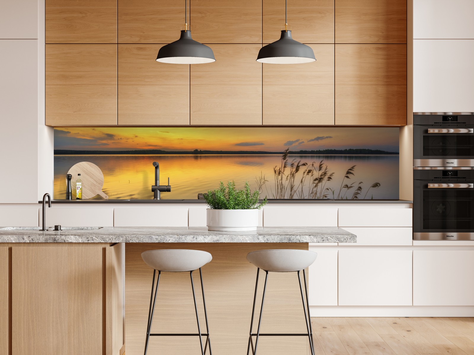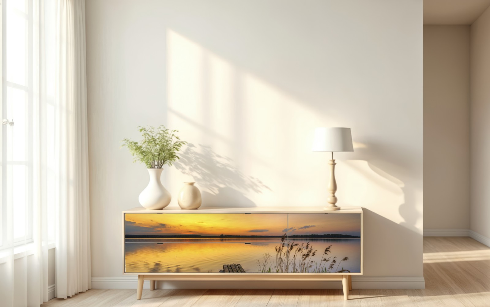 Ein ruhiger goldener Sonnenuntergang über einem stillen See mit einem rustikalen Steg und Schilf, ideal, um natürliche Atmosphäre ins Zuhause zu bringen.