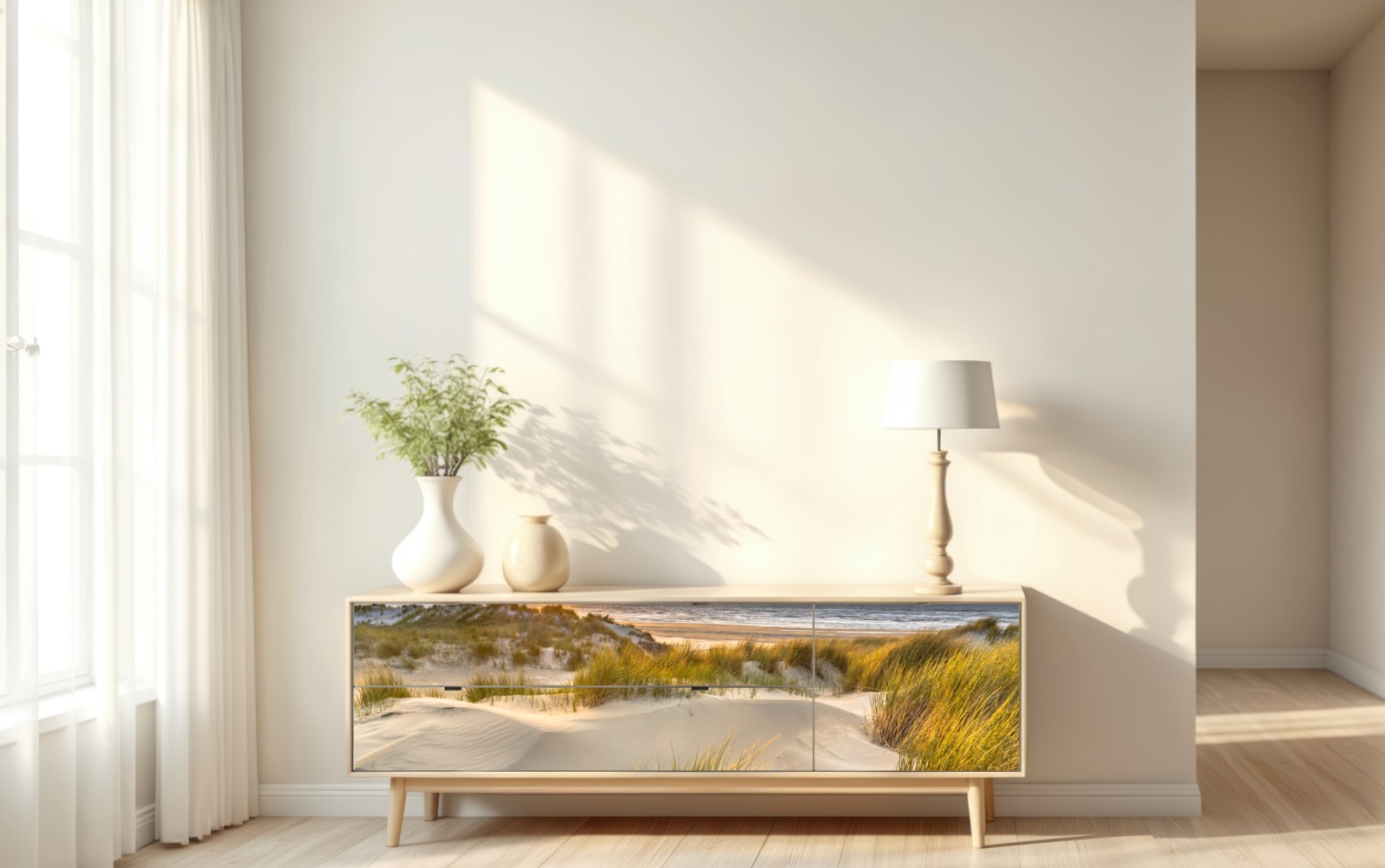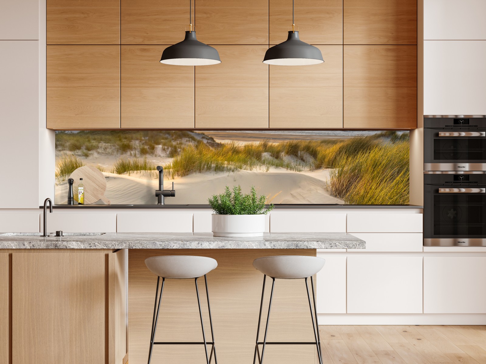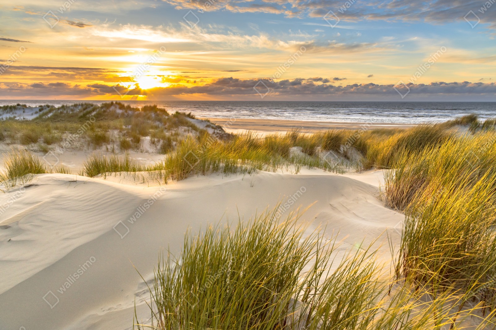 Bringen Sie die ruhige Stimmung eines Nordsee-Sonnenuntergangs und weitläufiger Sanddünen in Ihr Zuhause mit diesem Küstenbild.