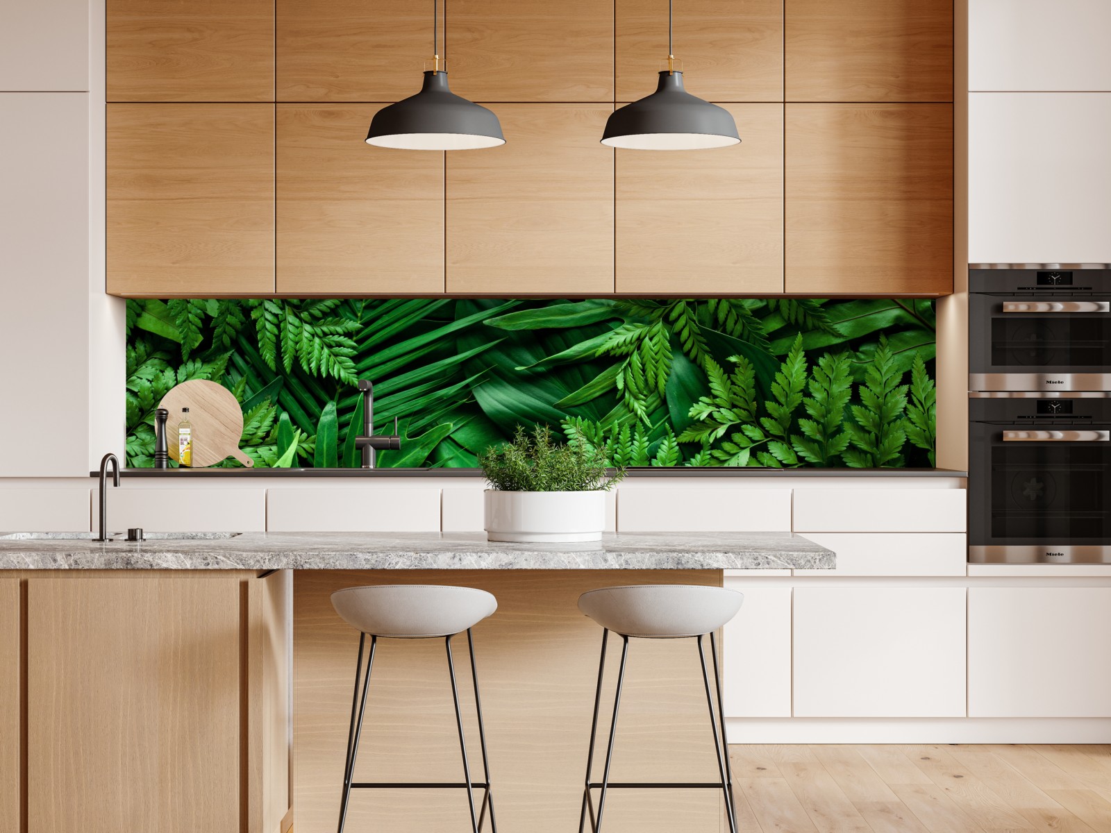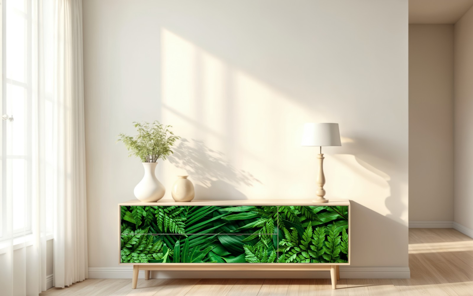 Lebendige Anordnung tropischer Blätter bringt einen beruhigenden, natürlichen Akzent in jeden Raum und schafft eine frische, biophile Atmosphäre.
