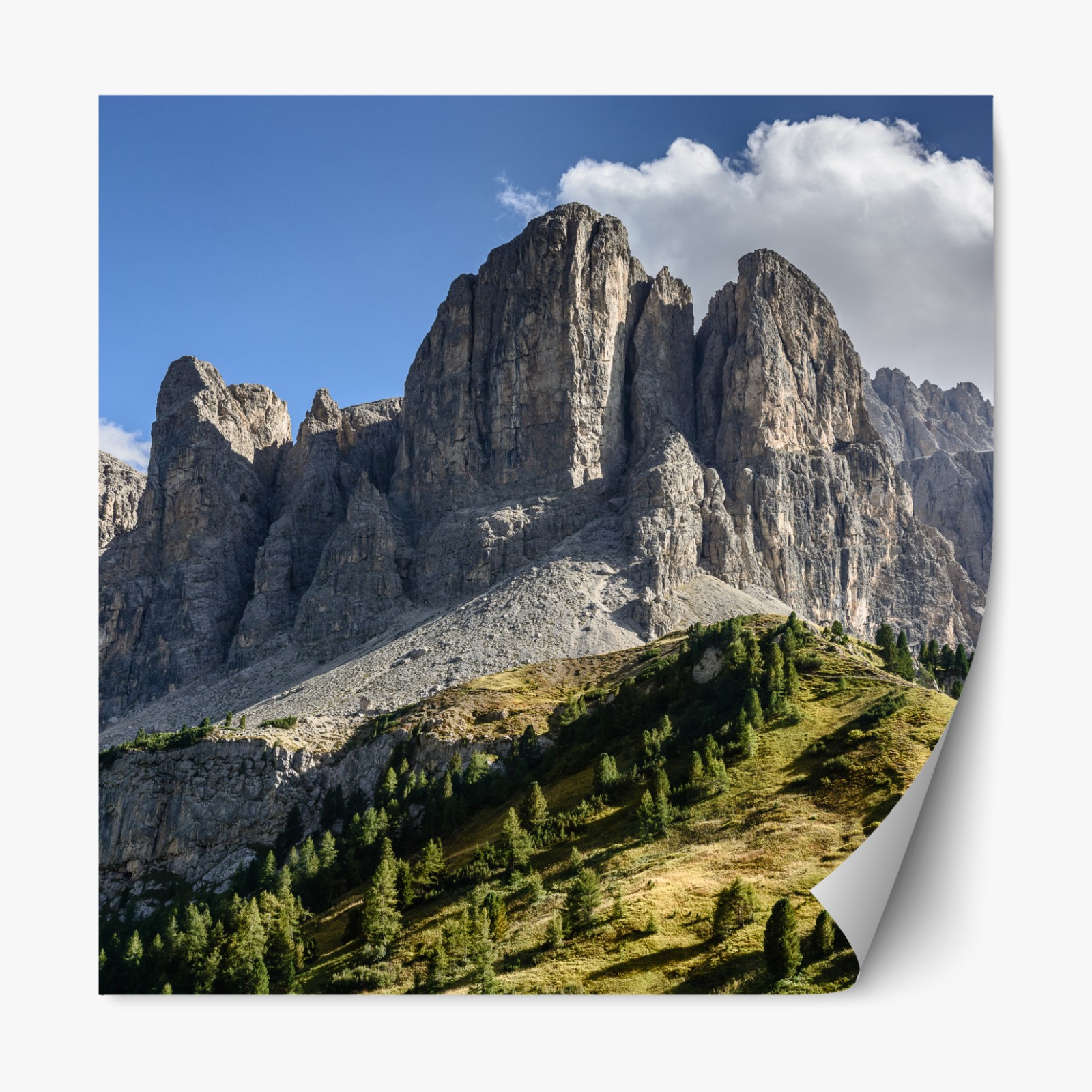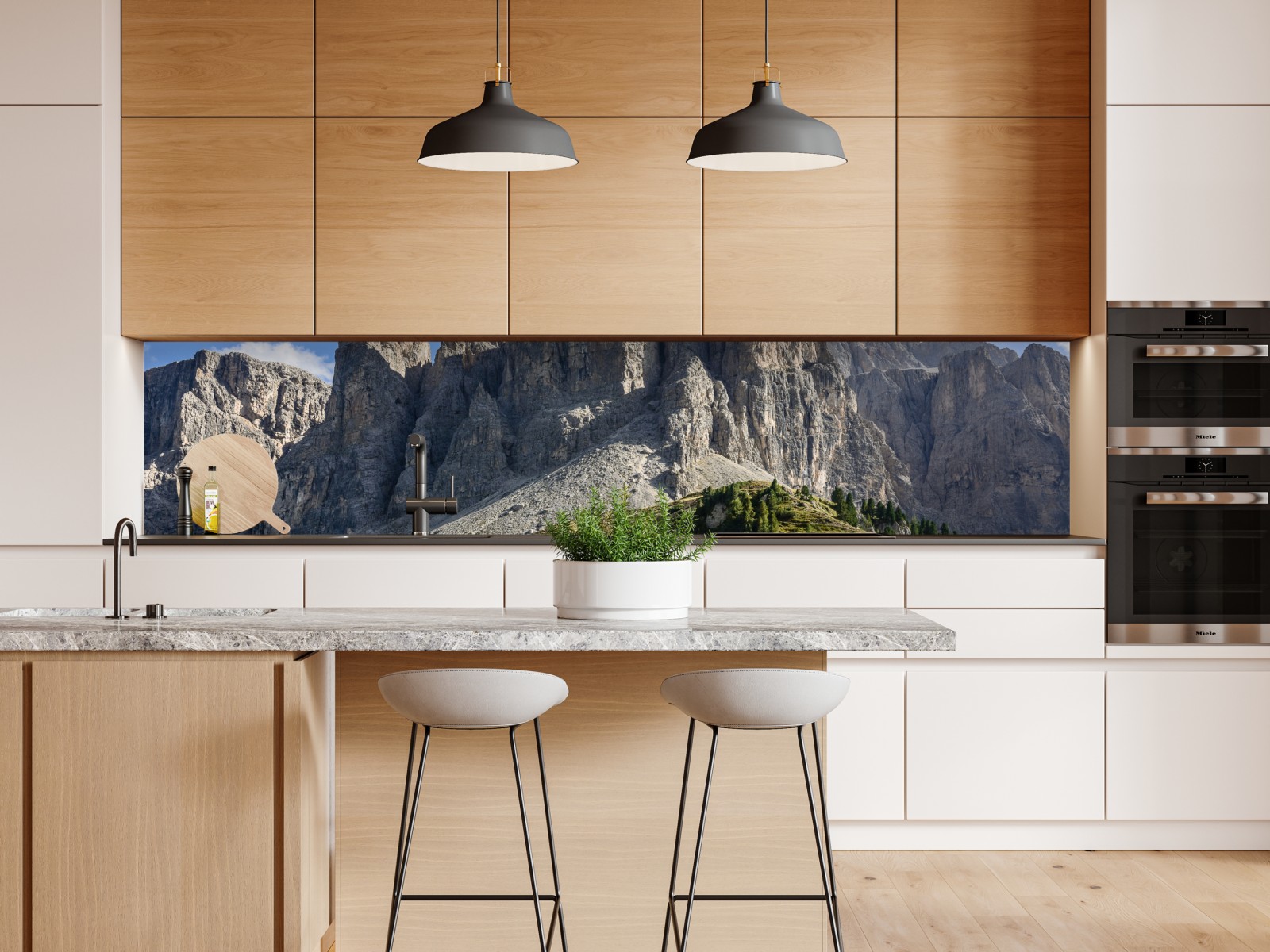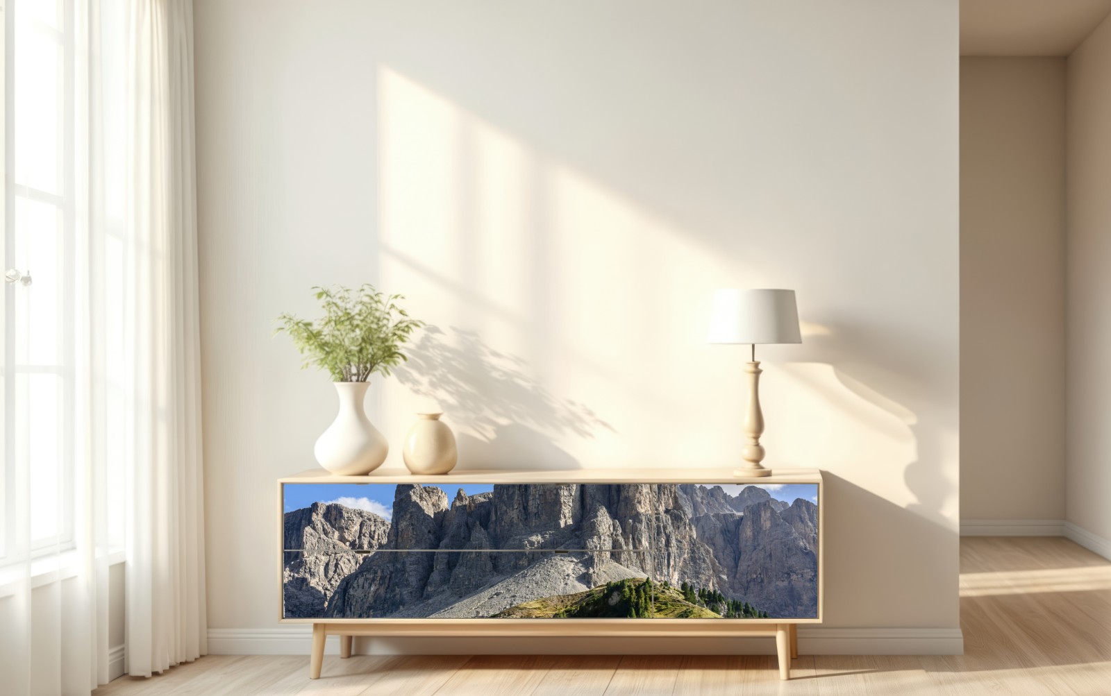 Ein atemberaubendes Bergpanorama mit imposanten Felswänden und sonnenbeschienenen Almhängen, ideal um natürliche Ruhe und Weite in Ihr Zuhause zu bringen.