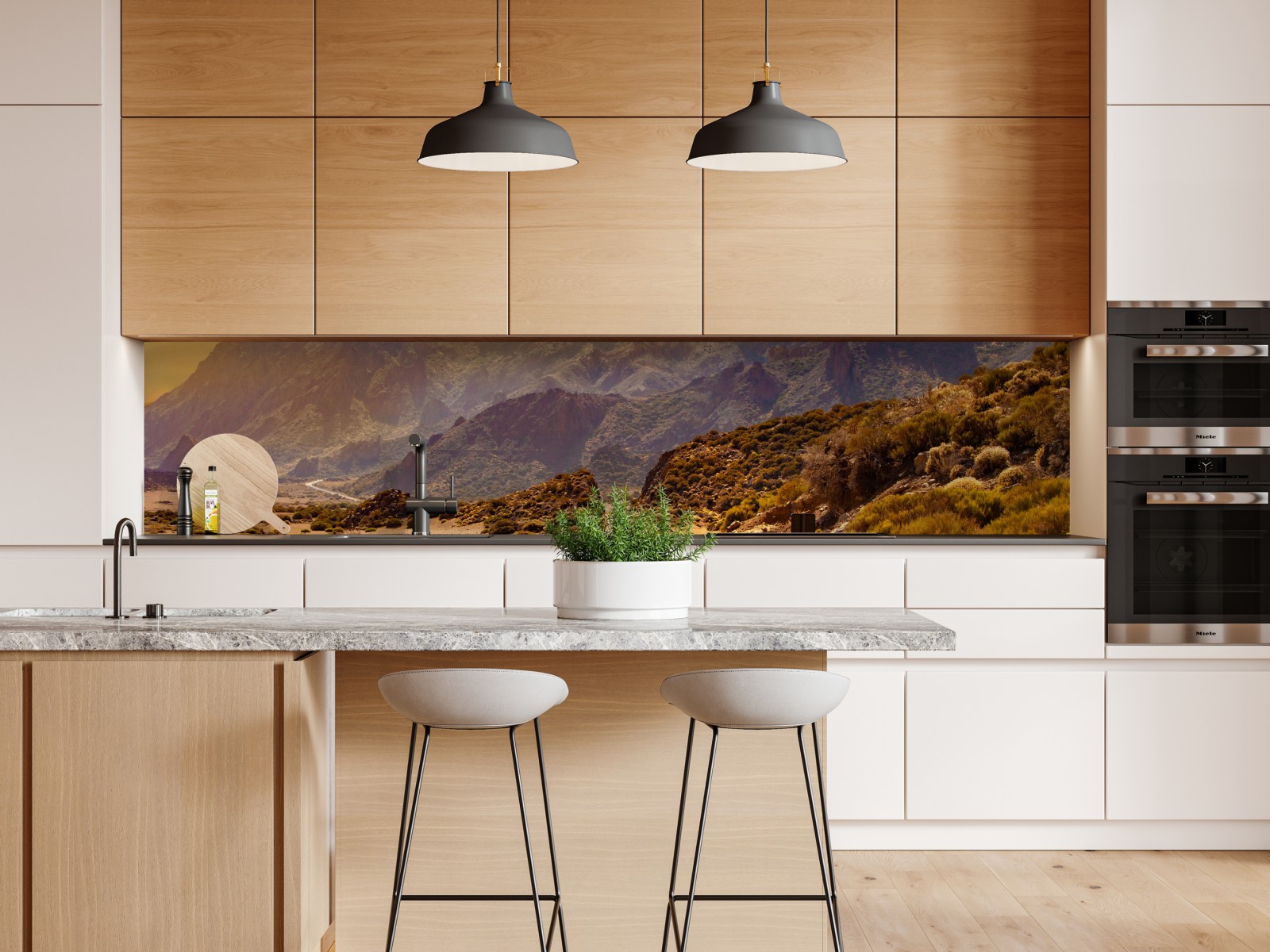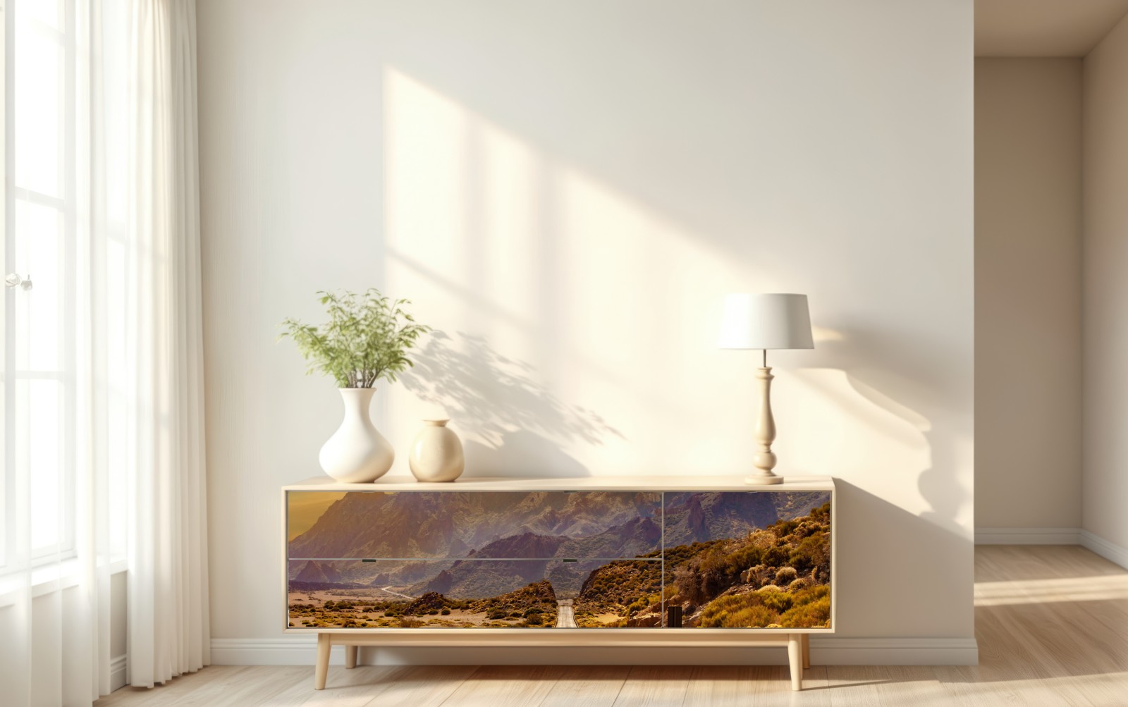 Dramatische Bergstraße bei Sonnenuntergang auf Teneriffa, die Ihrem Raum Abenteuer und Ruhe verleiht.