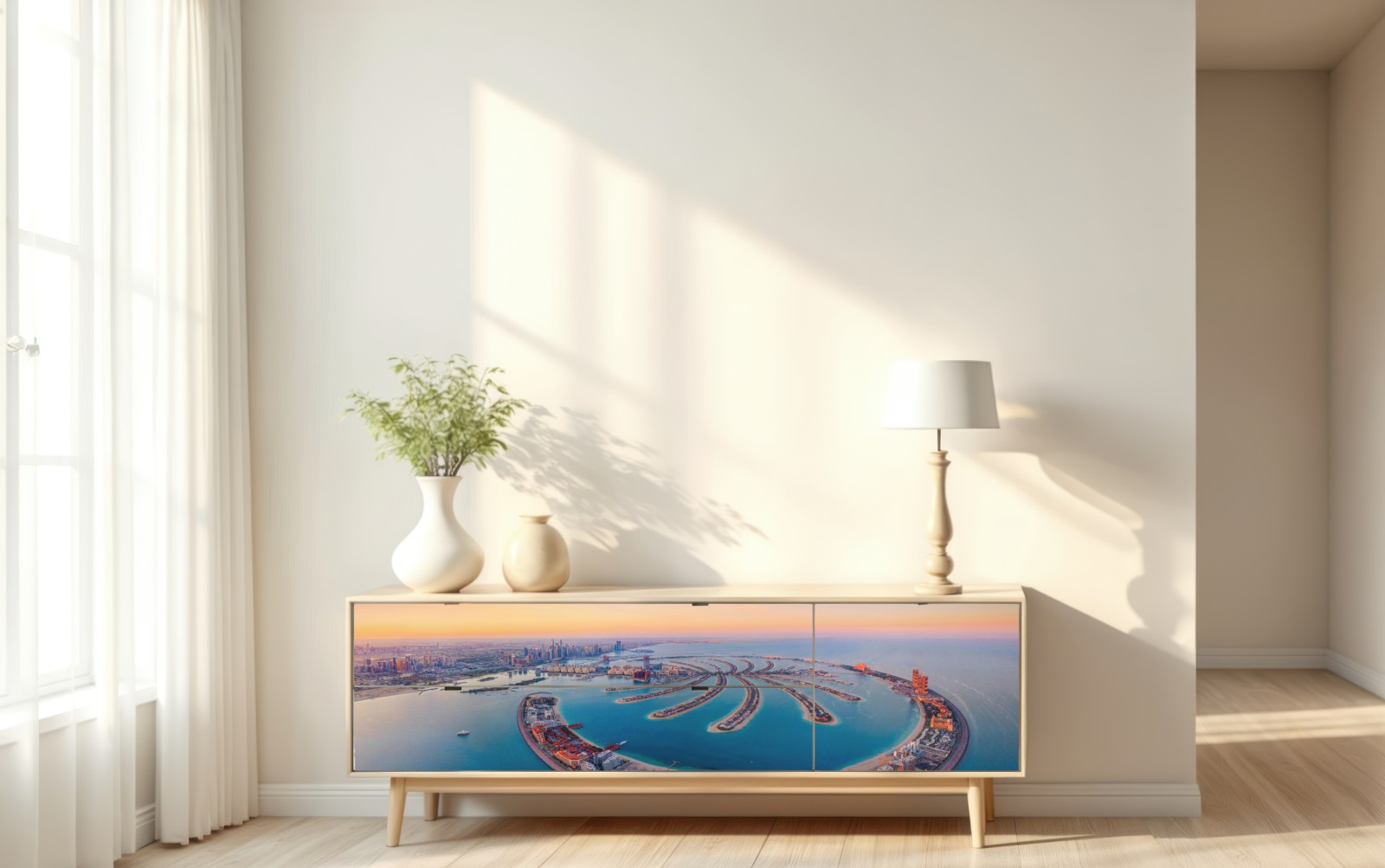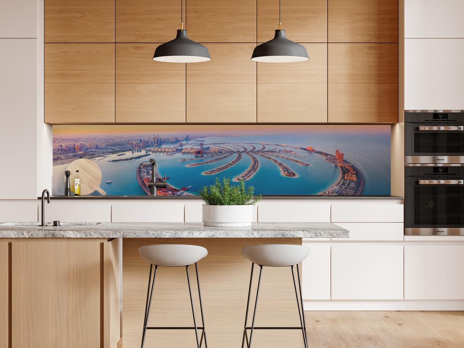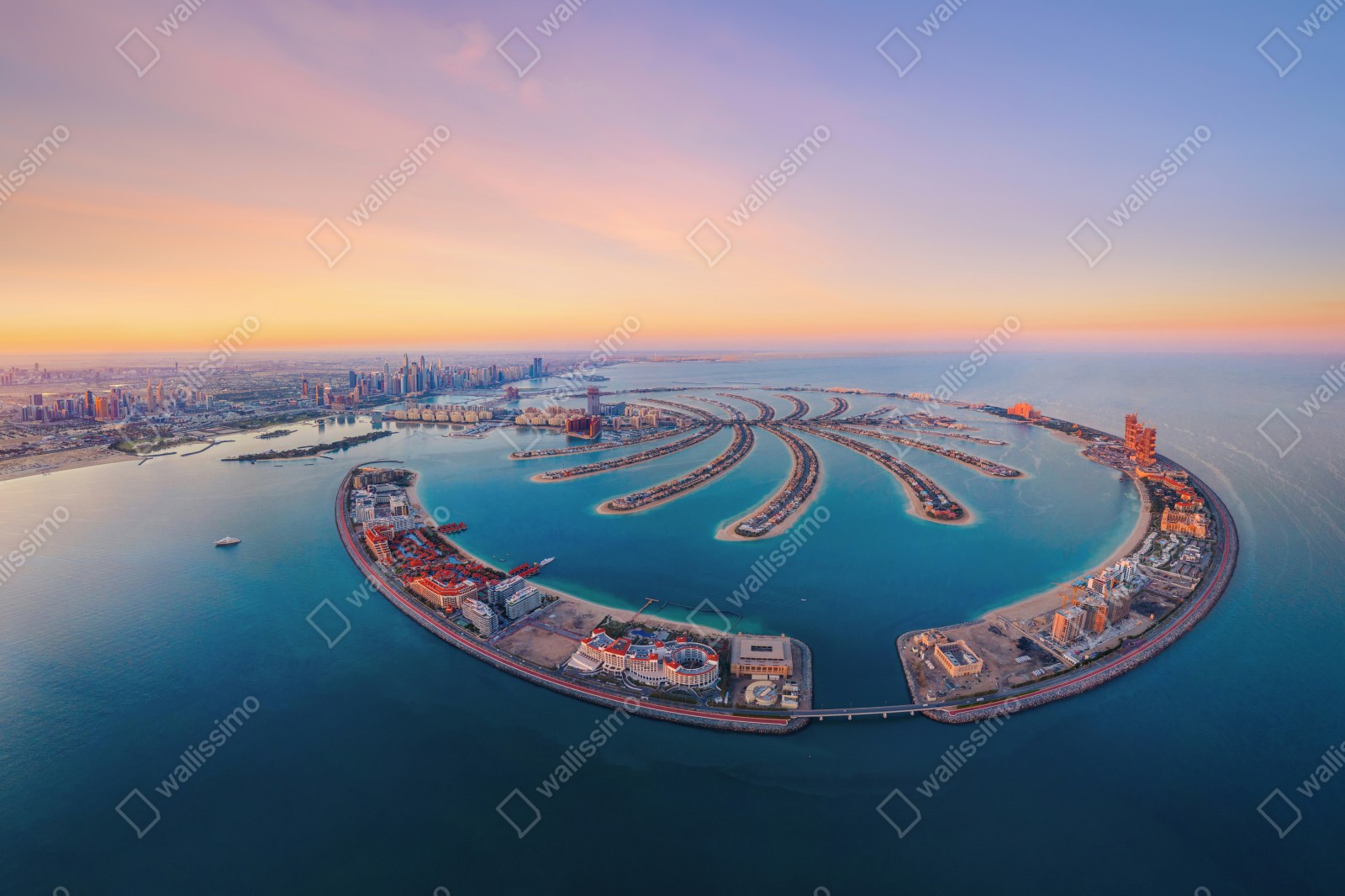 Atemberaubende Luftaufnahme von Palm Jumeirah beim Sonnenuntergang mit türkisfarbenem Wasser und einer strahlenden Skyline, ideal um modernen urbanen Stil ins Zuhause zu bringen.
