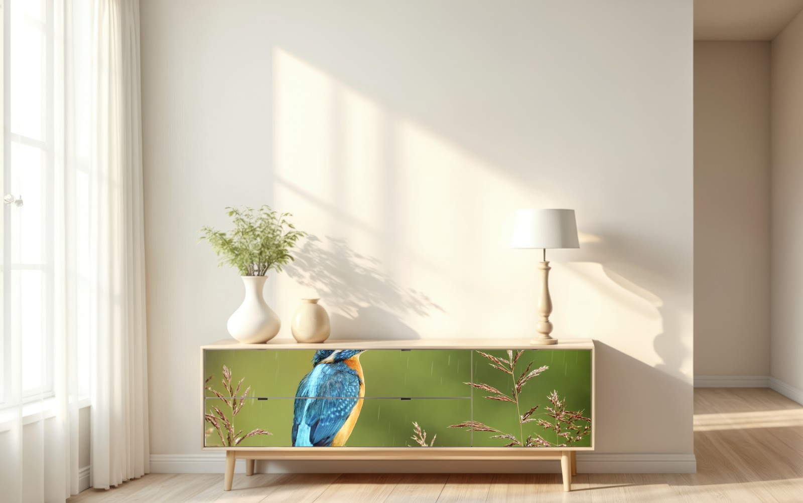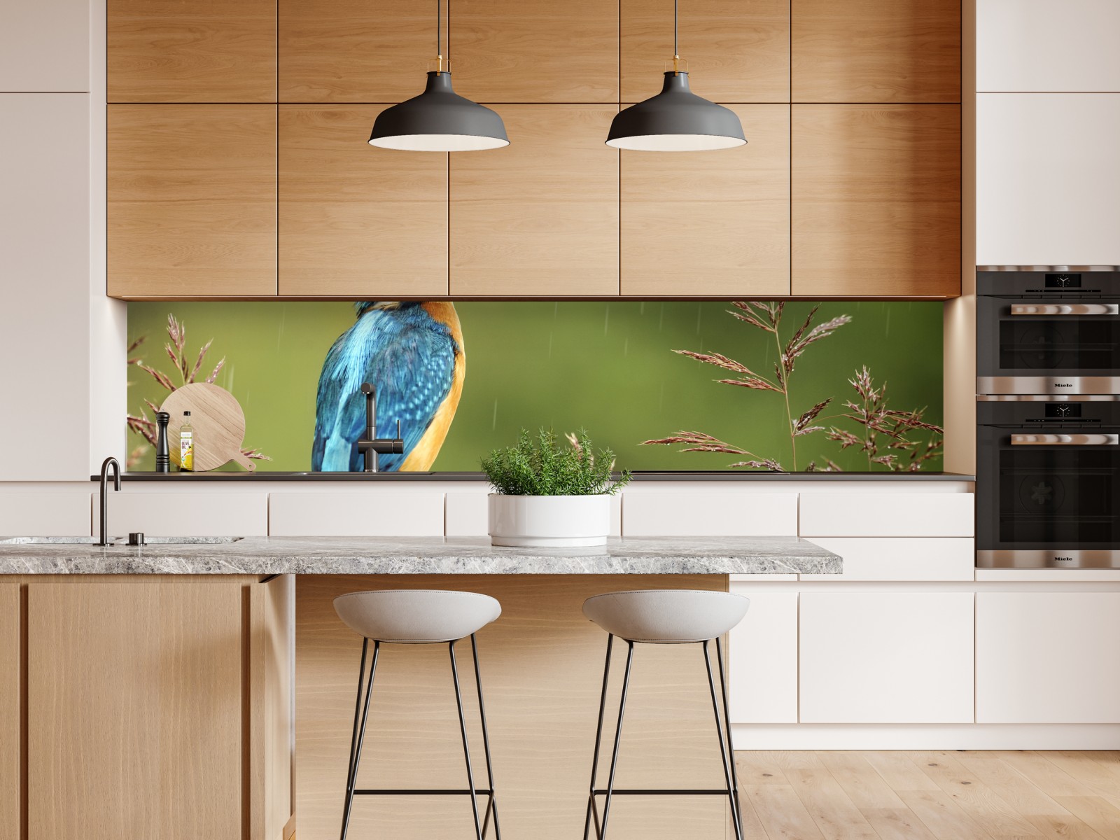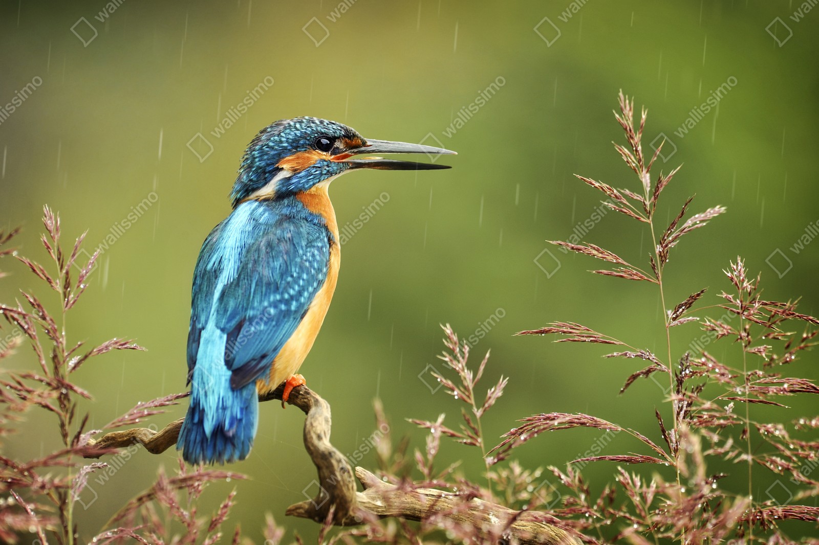 Lebhafte Nahaufnahme eines Eisvogels im Regen mit leuchtend blauem und orangefarbenem Gefieder – perfekt, um die Natur ins Zuhause zu holen.