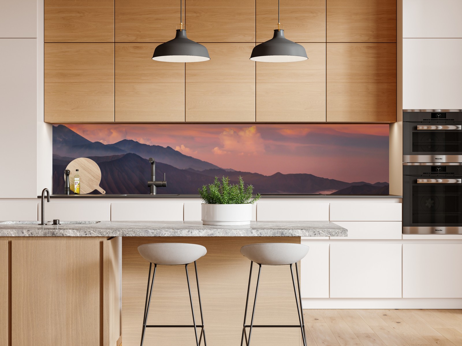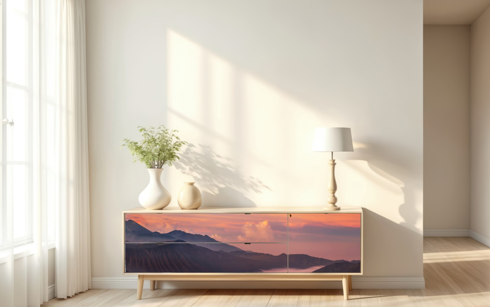 eine lebendige szene bei sonnenaufgang mit einem heißluftballon über nebligen bergen, die wärme und ruhe in jeden raum bringt.