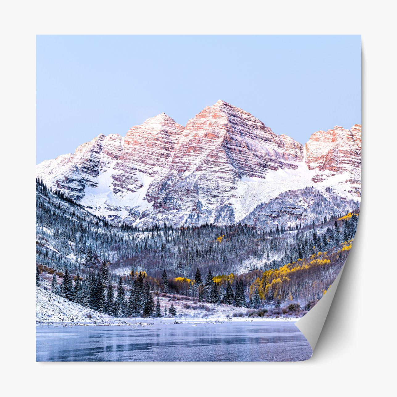 Repositionierbarer Aufkleber Verschneiter morgen in den bergen am see