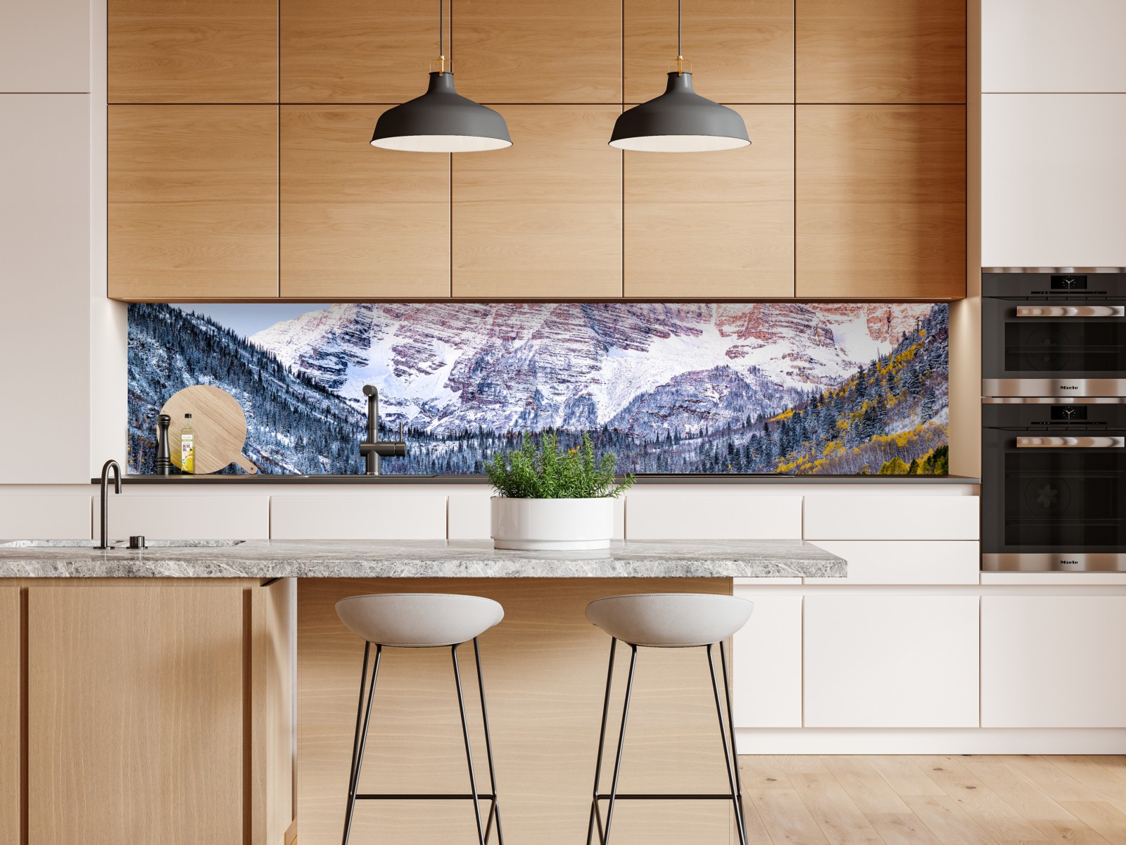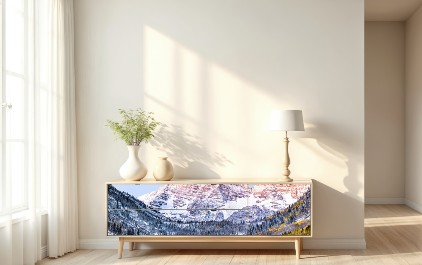 Repositionierbarer Aufkleber verschneiter morgen in den bergen am see