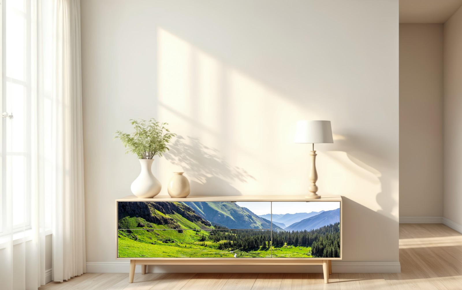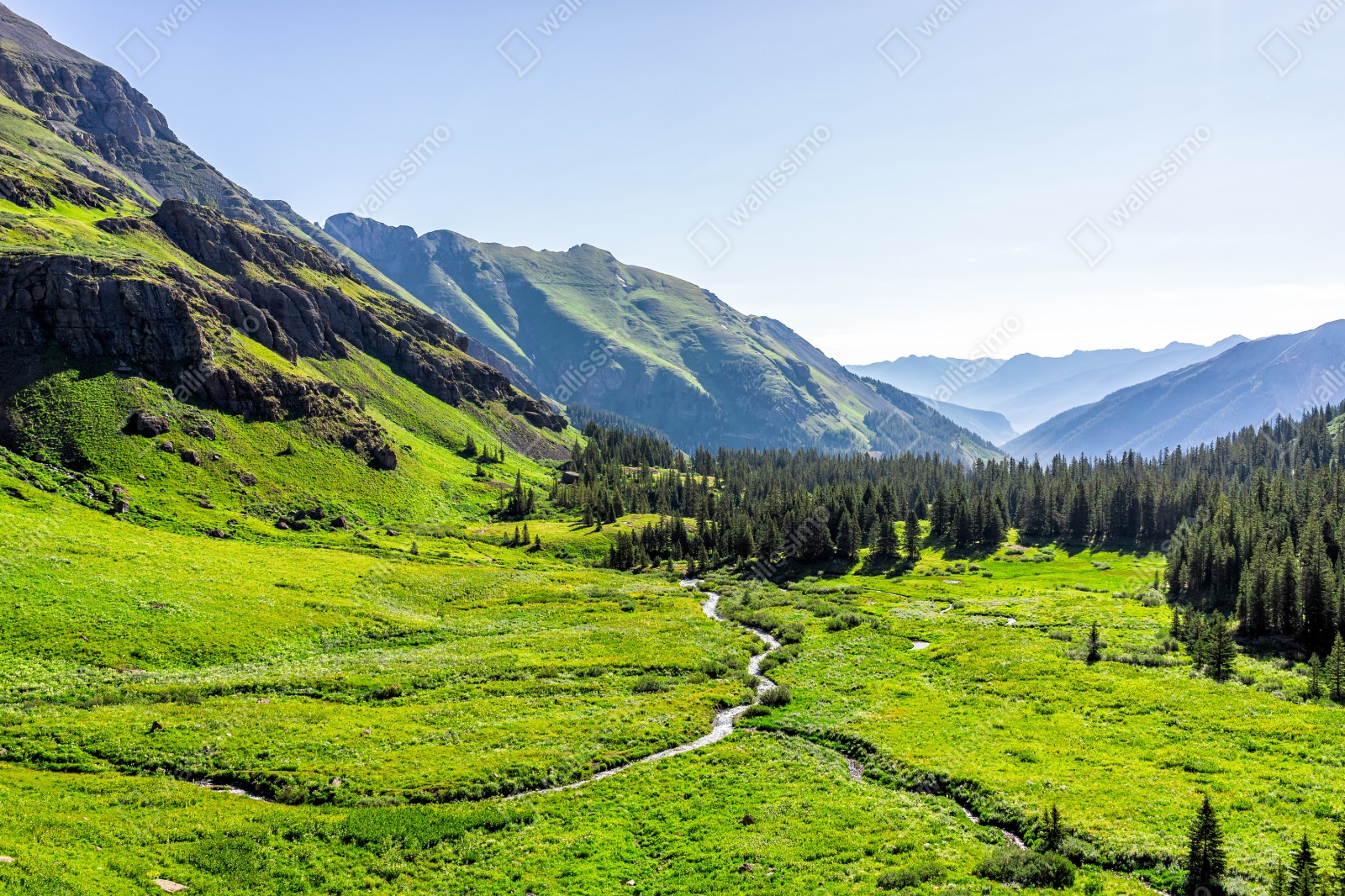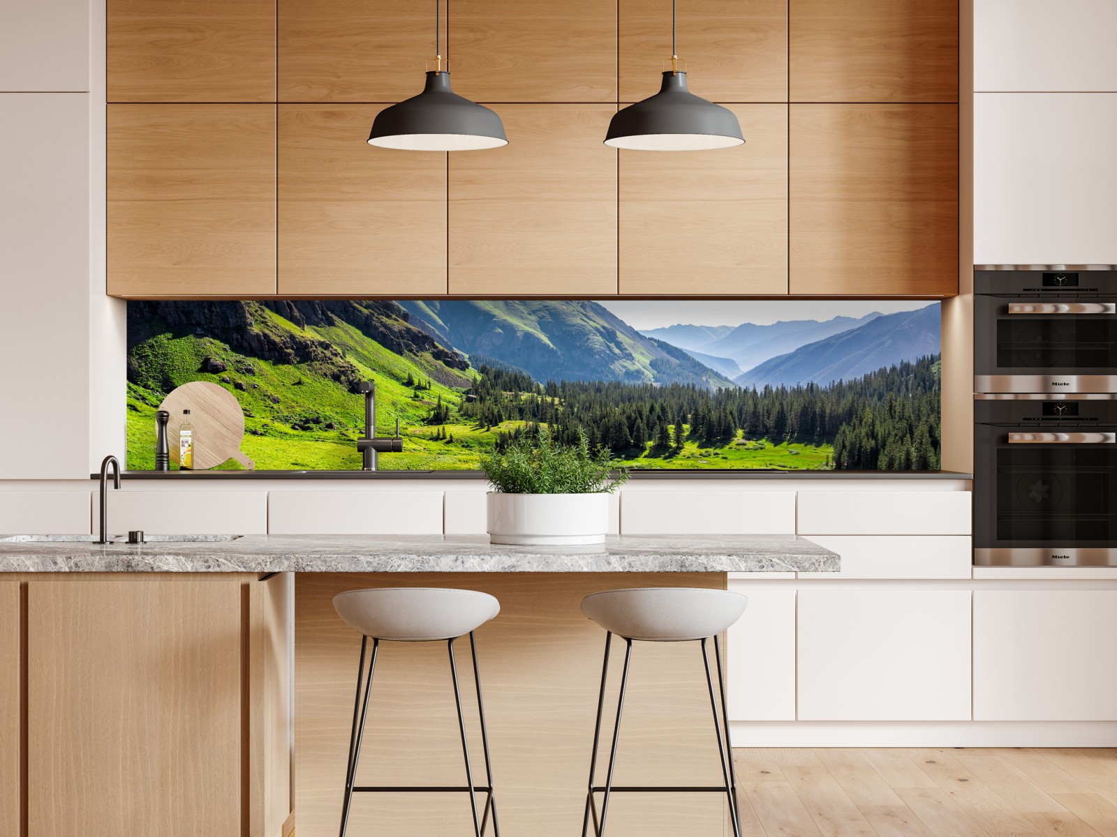 Bringen Sie alpine Ruhe an die Wand mit diesem lebendigen Foto eines grünen Tals, eines mäandernden Bachs und entfernter Gipfel.