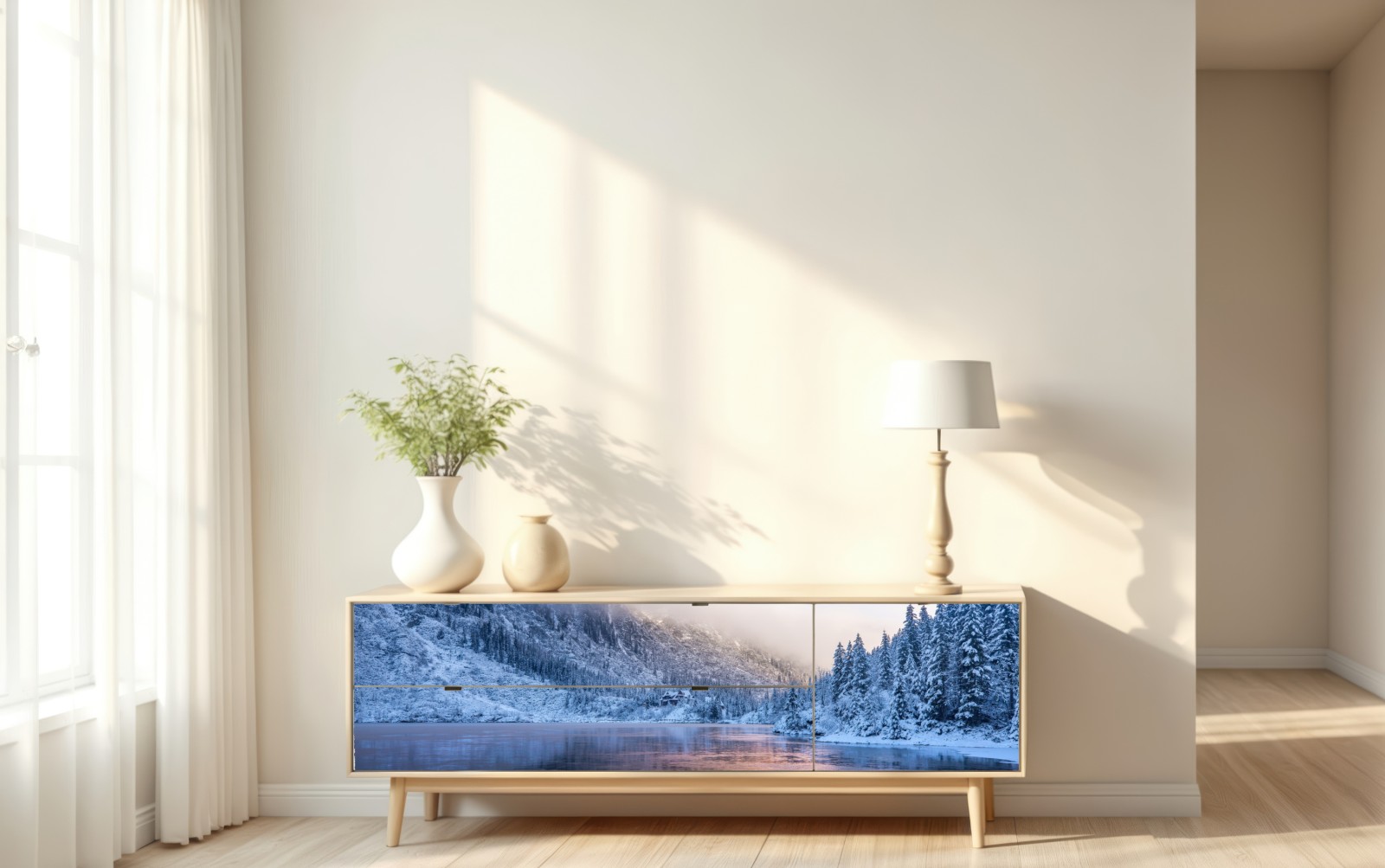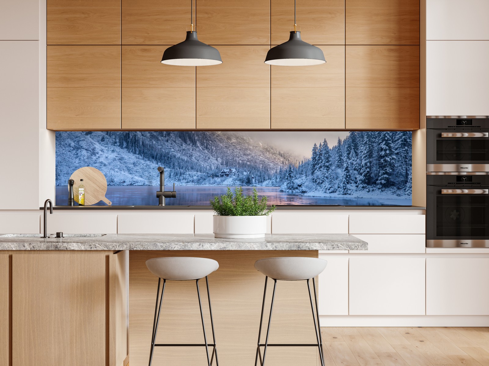Ruhige Winterlandschaft mit Sonnenaufgang über einem zugefrorenen See und schneebedeckten Gipfeln, ideal um natürliche Ruhe in Ihre Räume zu bringen.