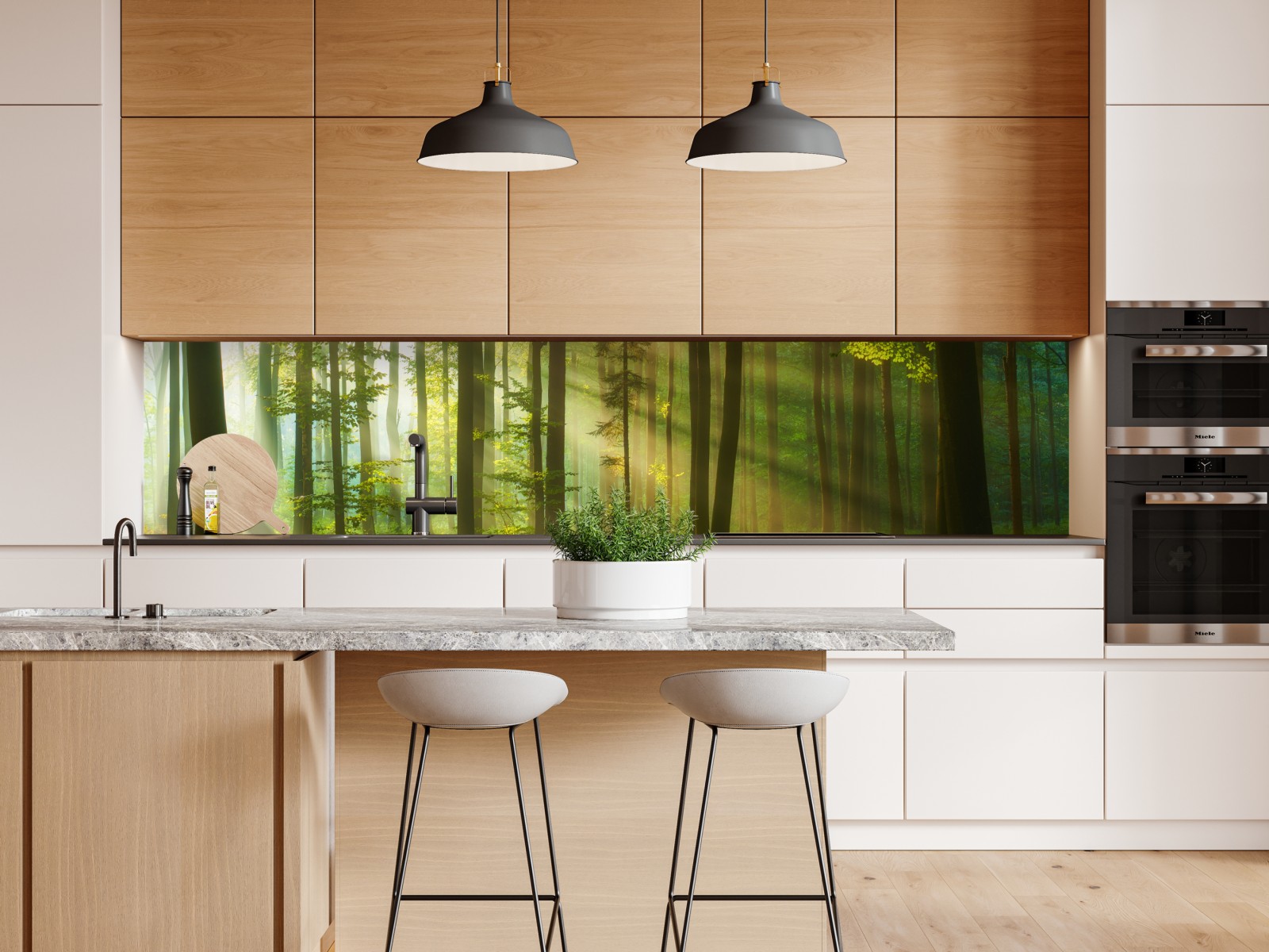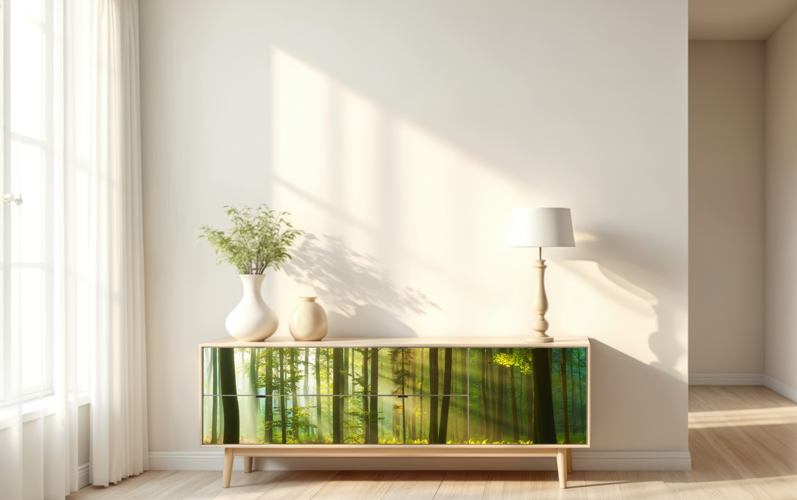 Eine ruhige Waldszene im warmen Morgenlicht, ideal um jedem Raum Ruhe, natürliche Schönheit und einen Hauch von Grün zu verleihen.