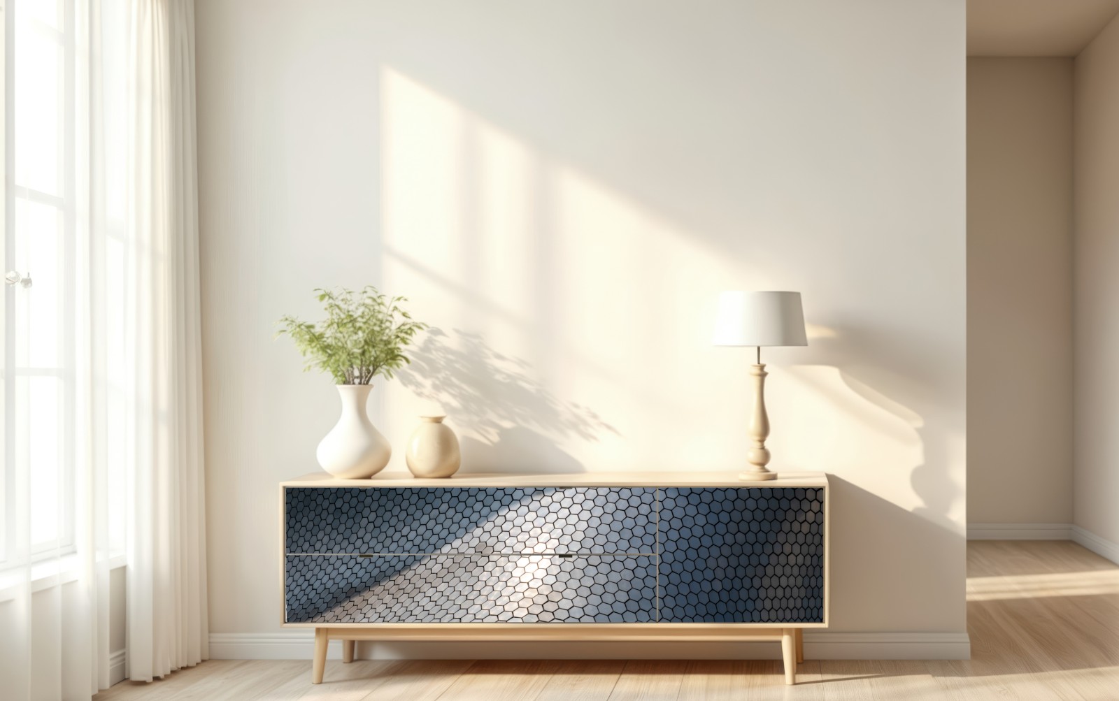 auffälliges metallisches hexagonmuster, das modernen geometrischen charakter und reflektierende tiefe in jeden raum bringt.